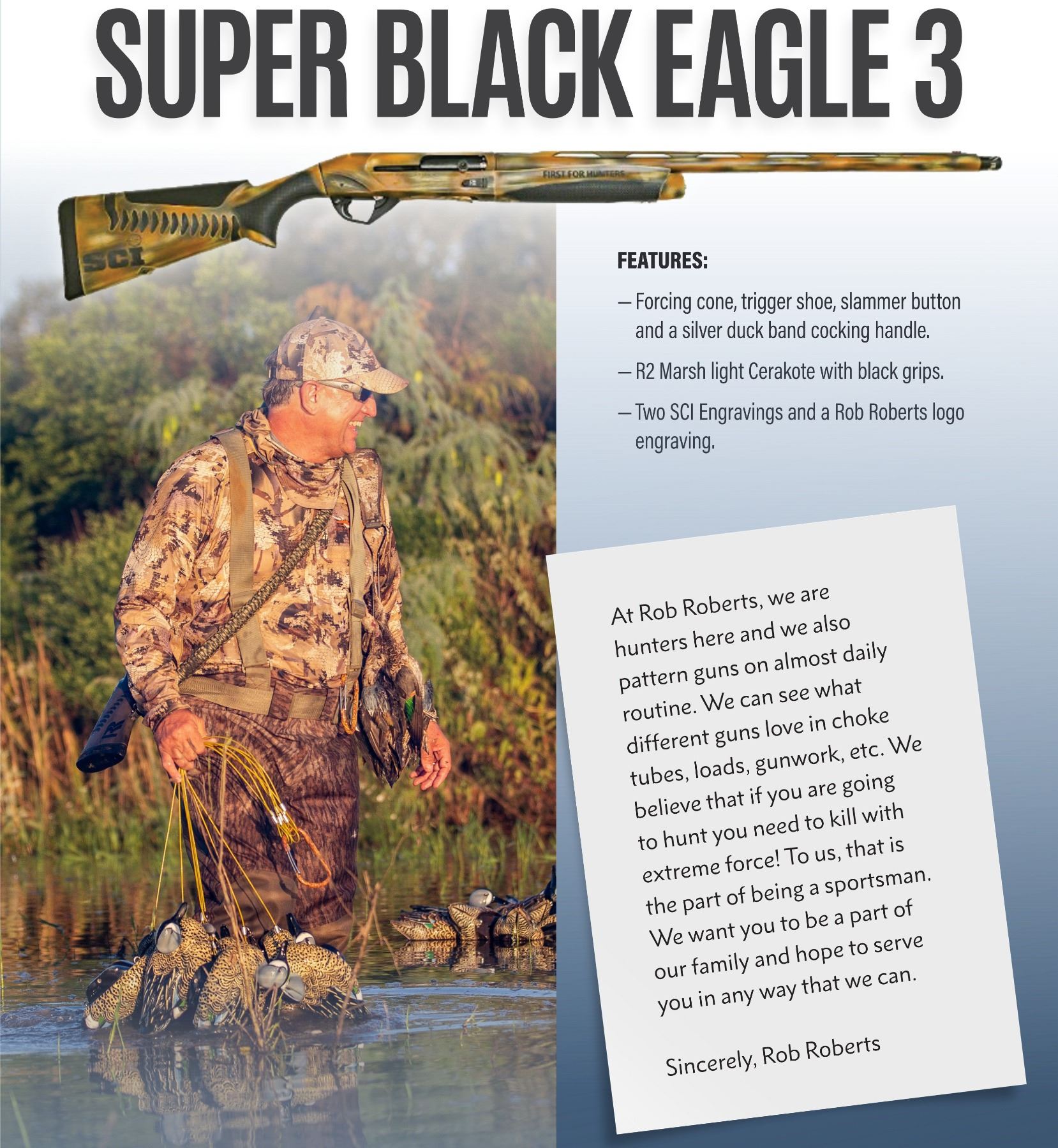 A word from the man himself: At Roberts, we are hunters here and we also pattern guns on a almost daily routine. We can see what different guns love in choke tubes, loads, gunwork, etc. We believe that if you are going to hunt you need to kill with extreme force! To us, that is the part of being a sportsman. We want you to be a part of our family and hope to serve you in any way that we can. Sincerely, Rob Roberts