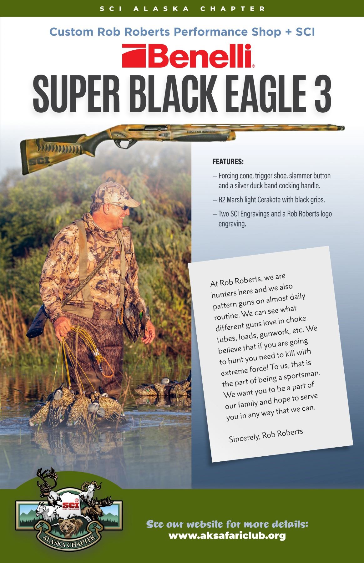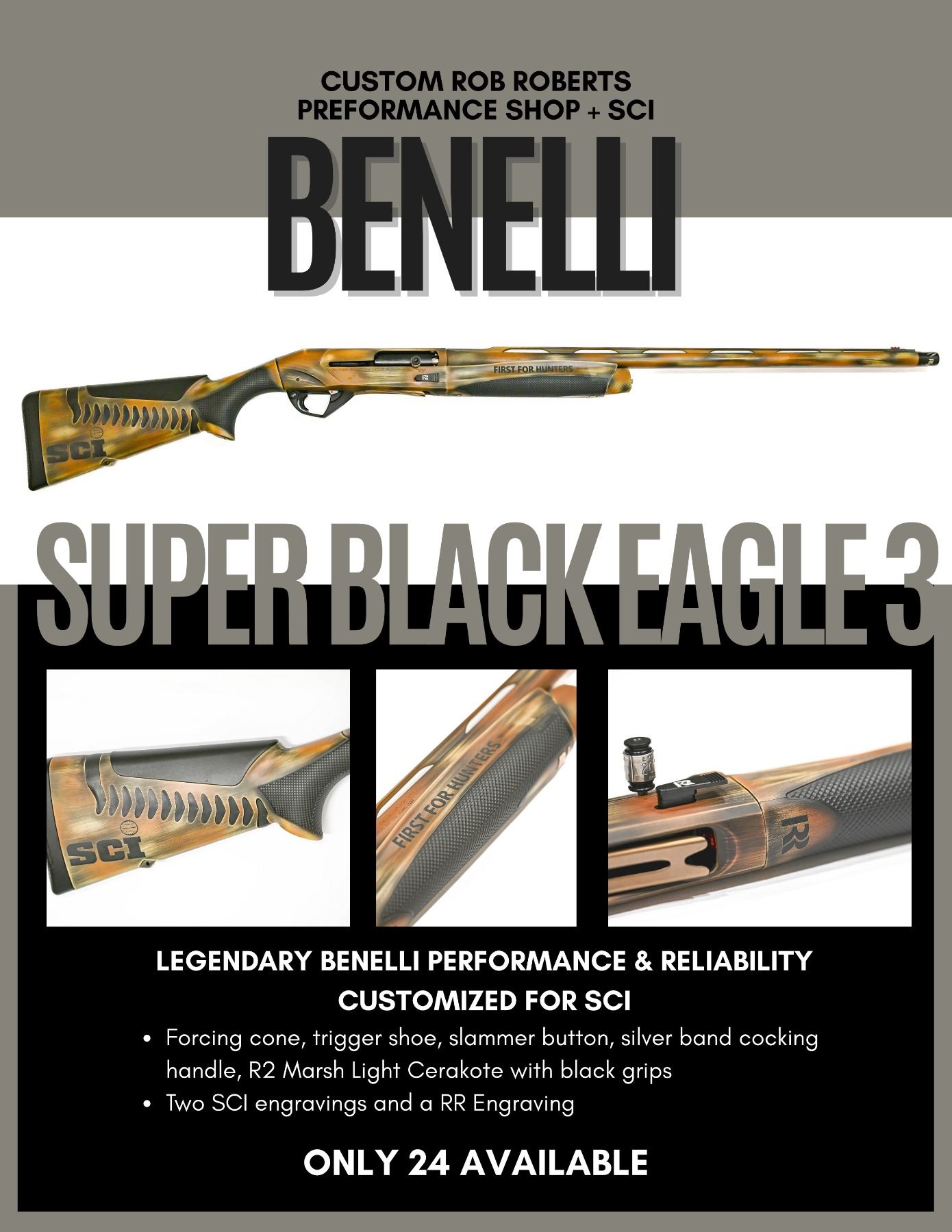 Safari Club Internationals Benneli Super Black Eagle 3 fully customized by master gunsmith Rob Roberts. This shotguns customization includes a forcing cone, a trigger shoe, slammer button, a silver duck band cocking handle, a R2 Marsh Light Cerakote with black grips, two SCI engravings and an RR engraving. Make no mistake, this shotgun is built to hunt.