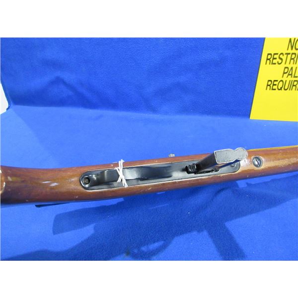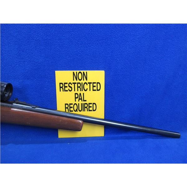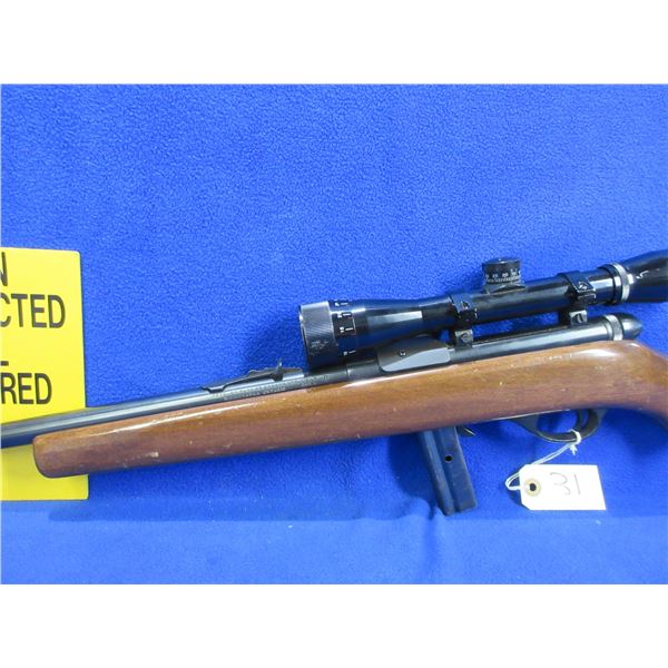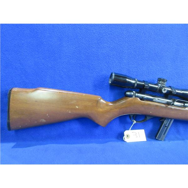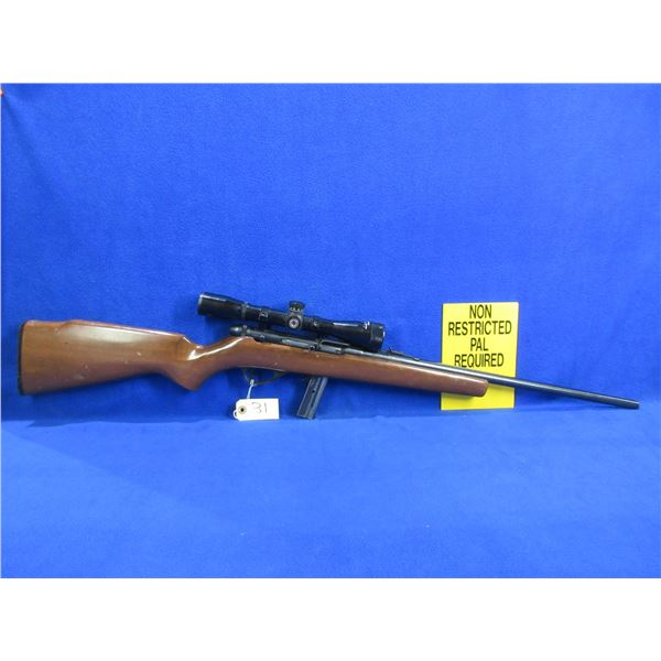 Non-Restricted - Squires Bingham Model 20P in 22 LR - This is a semi-auto rifle with removable magazine, action appears to be in good to very good working order. Barrel is 20 3/4", rifling is very good, bluing is good, has rear sight, front sight missing but has River Trail 4x32 Scope - appears clear - duplex reticle - missing one turret cover, stock is good with usage marks, length of pull is 14", butt plate good. Ser # A582513