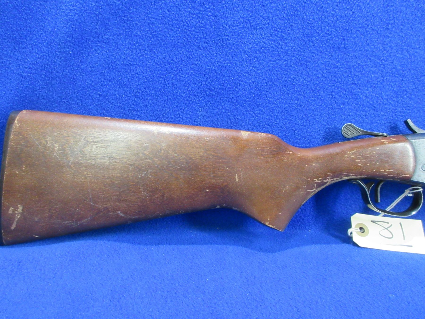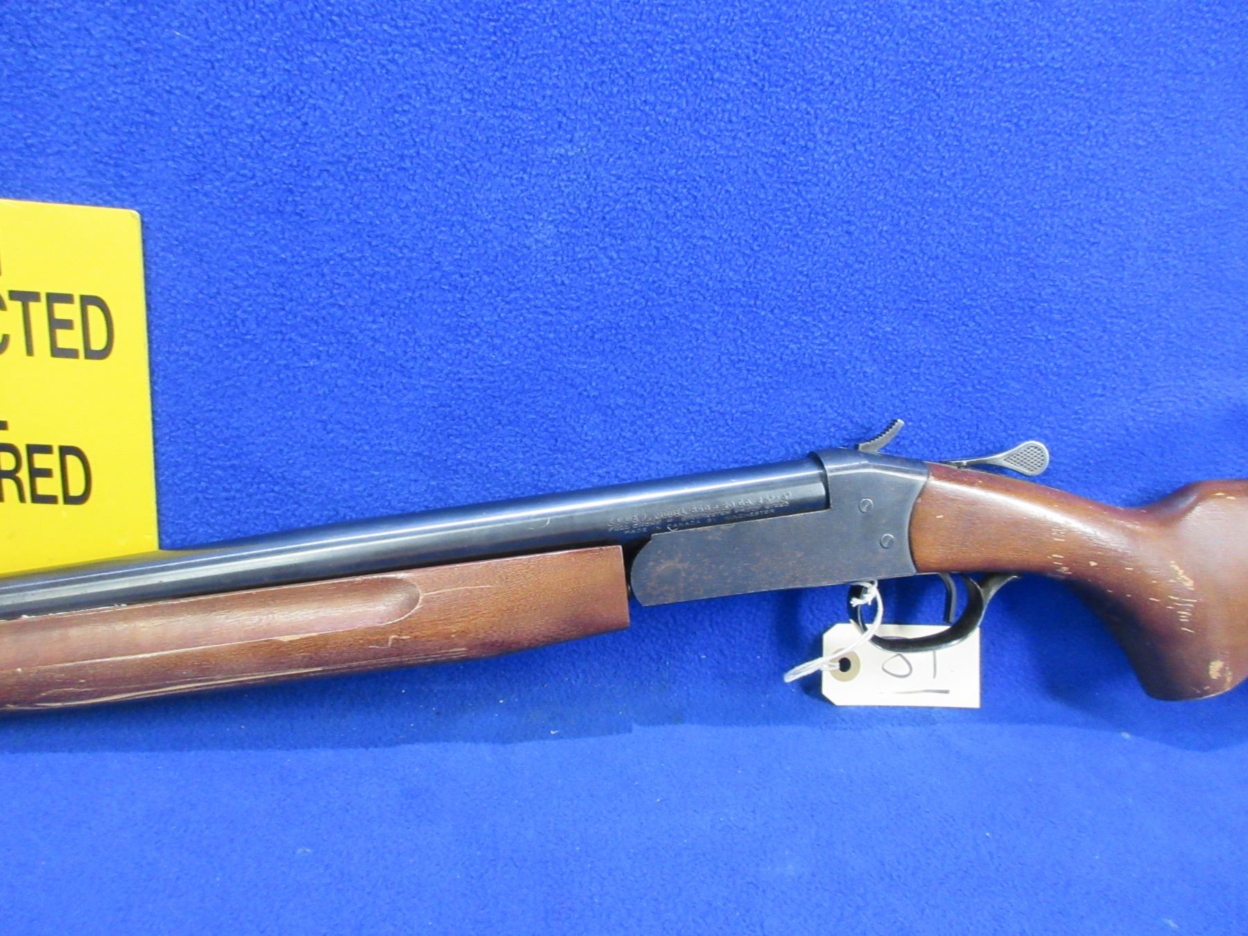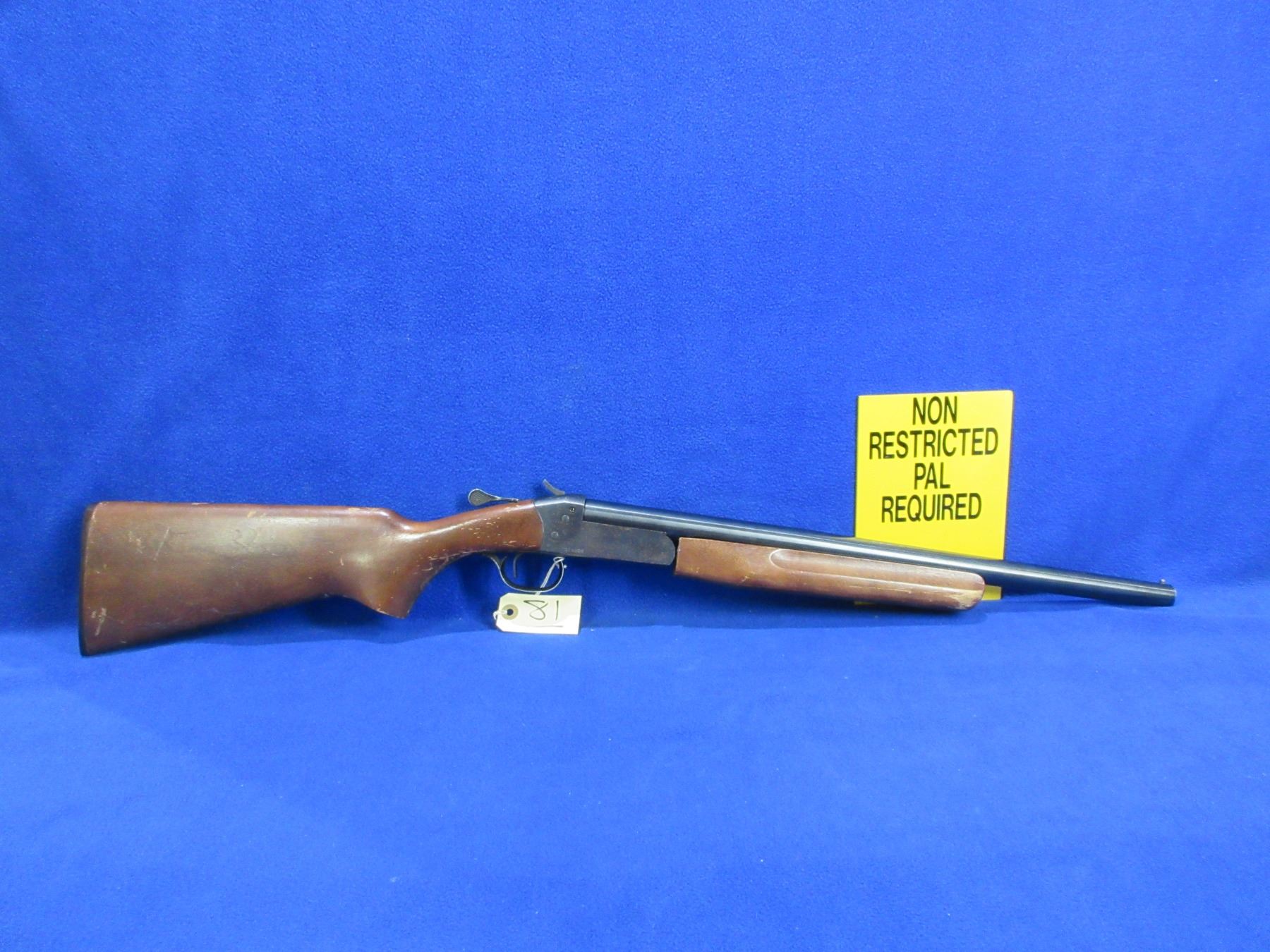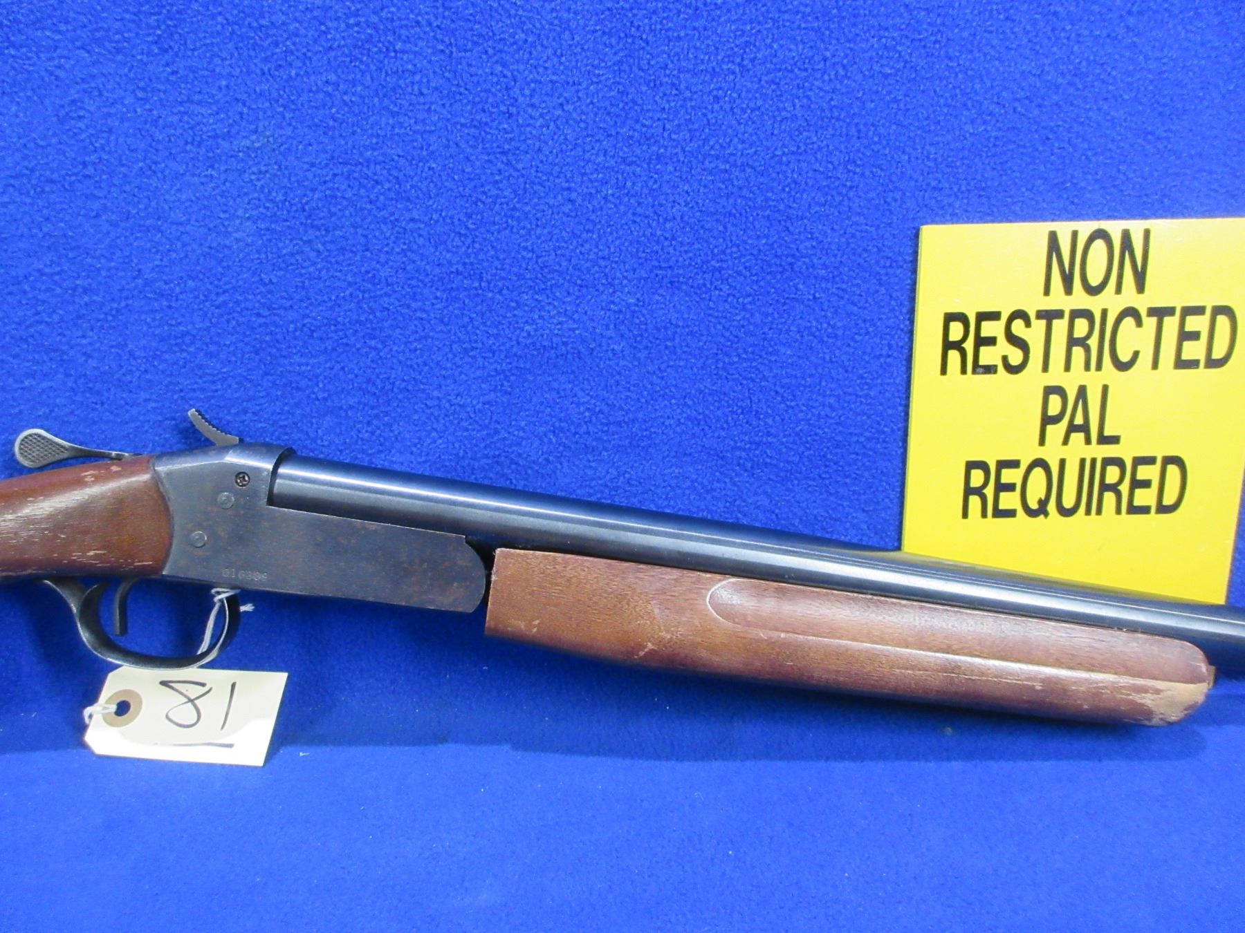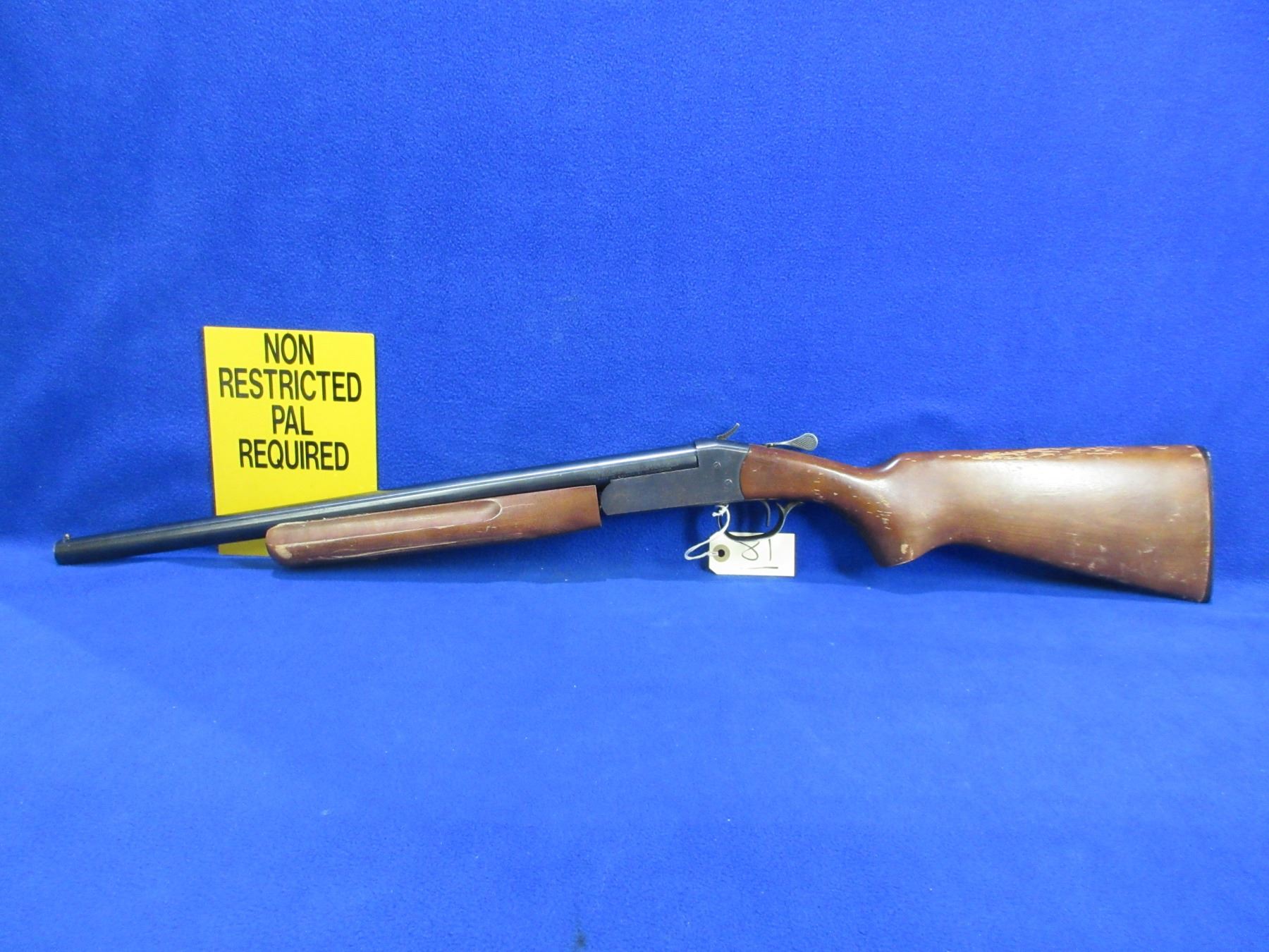 Non-Restricted - Cooey Model 840 in 20 Ga. 2 3/4" / 3" Full - This is a tip up single shot hammer shotgun, action is tight and appears to be in good to very good working order. Barrel is 20", bore is good, bluing is good on barrel with some light scratches and has very light pitting on action, has bead front sight, stock has a hairline crack behind the upper tang, forearm is good with usage marks, length of pull is 14", butt plate good. Ser # O16389