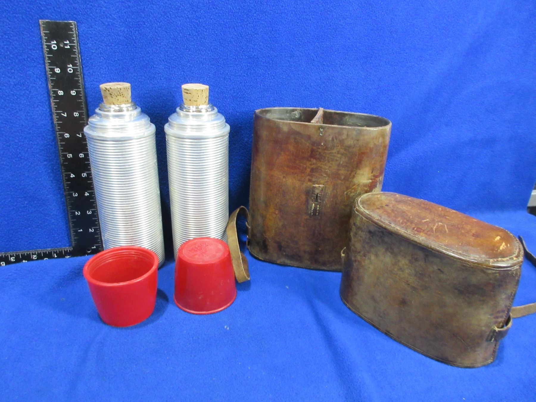 Lot 94 2 Vintage Glass Lined Thermos Bottles w/ Leather Carry Case