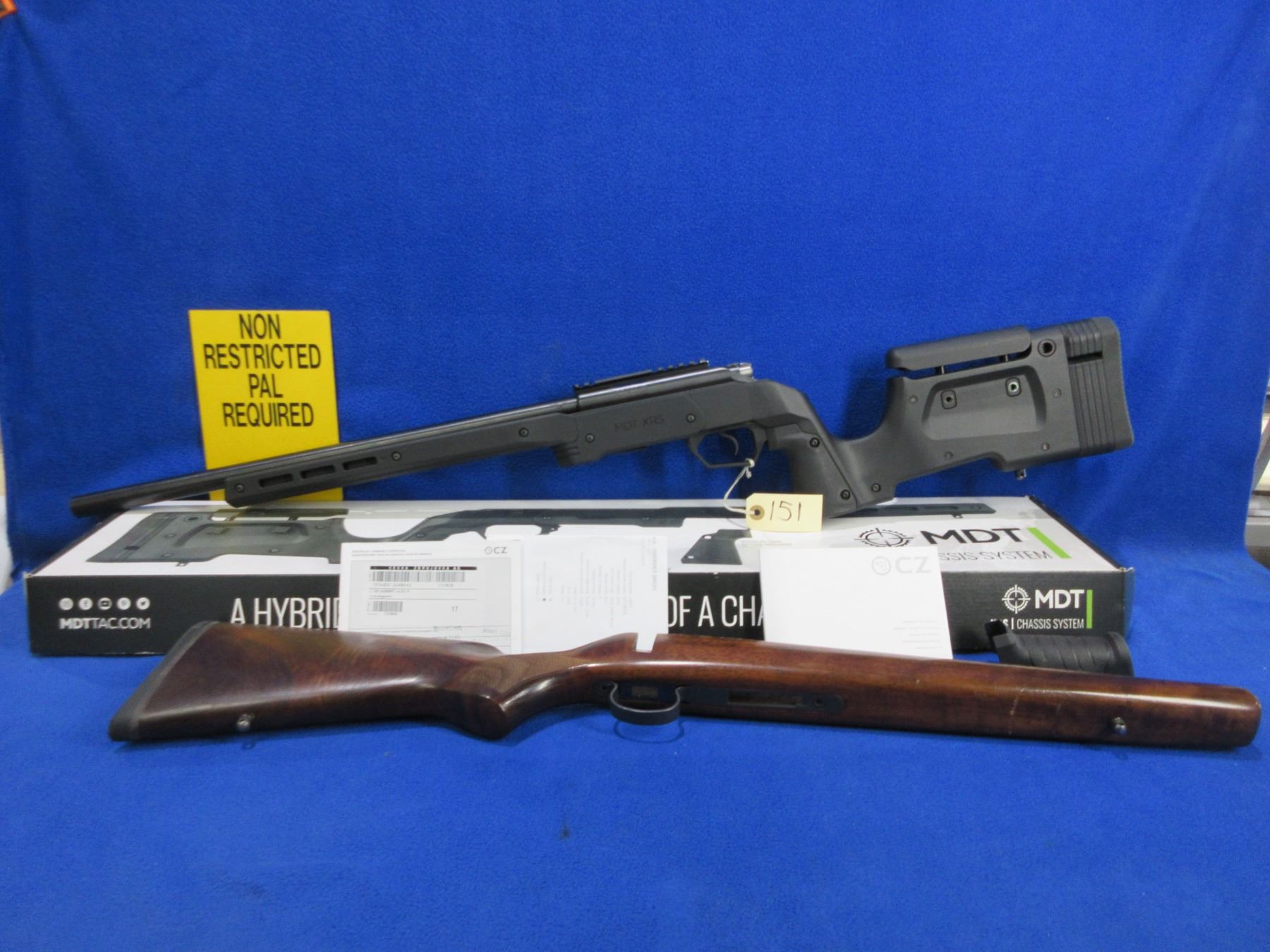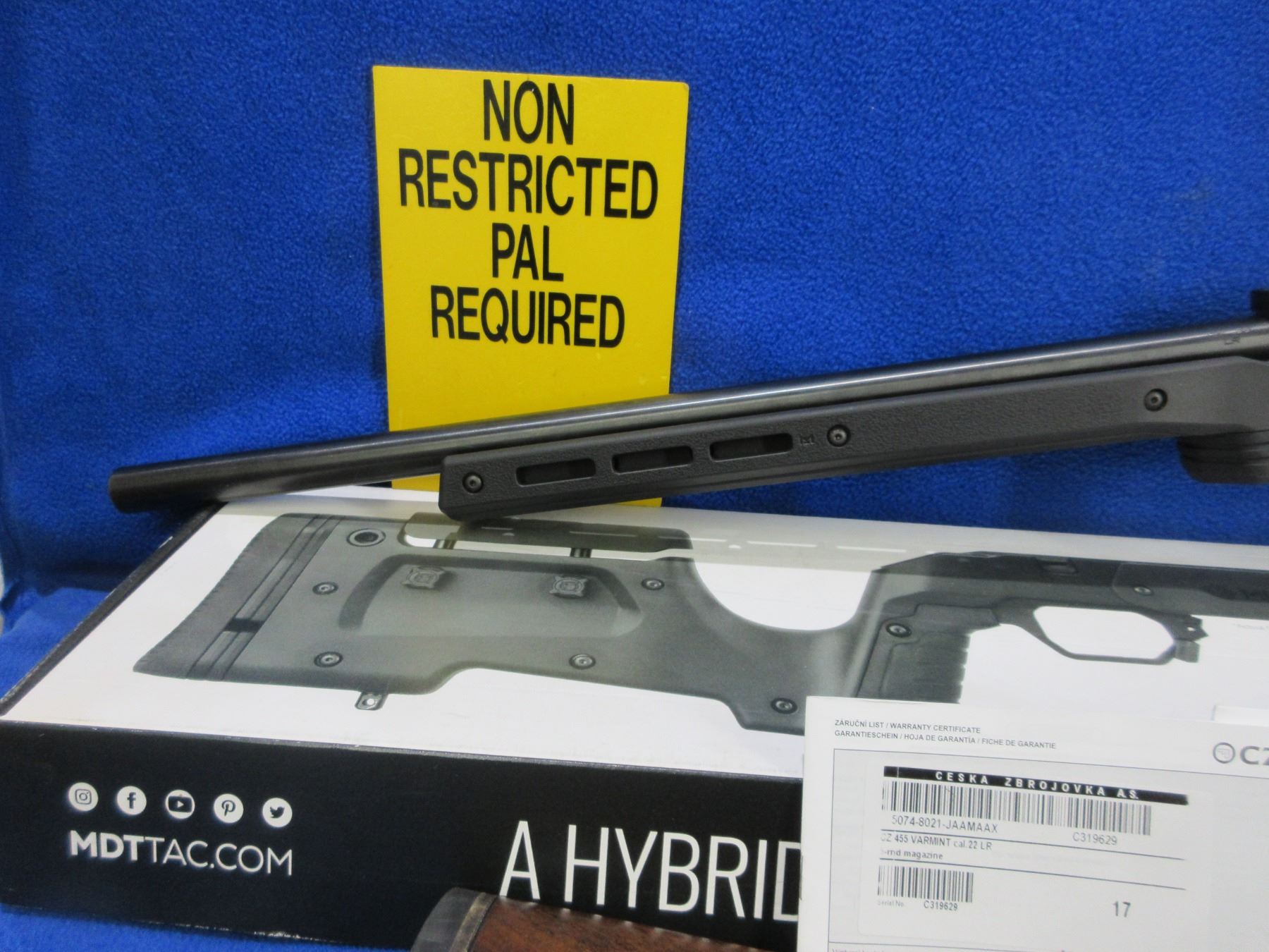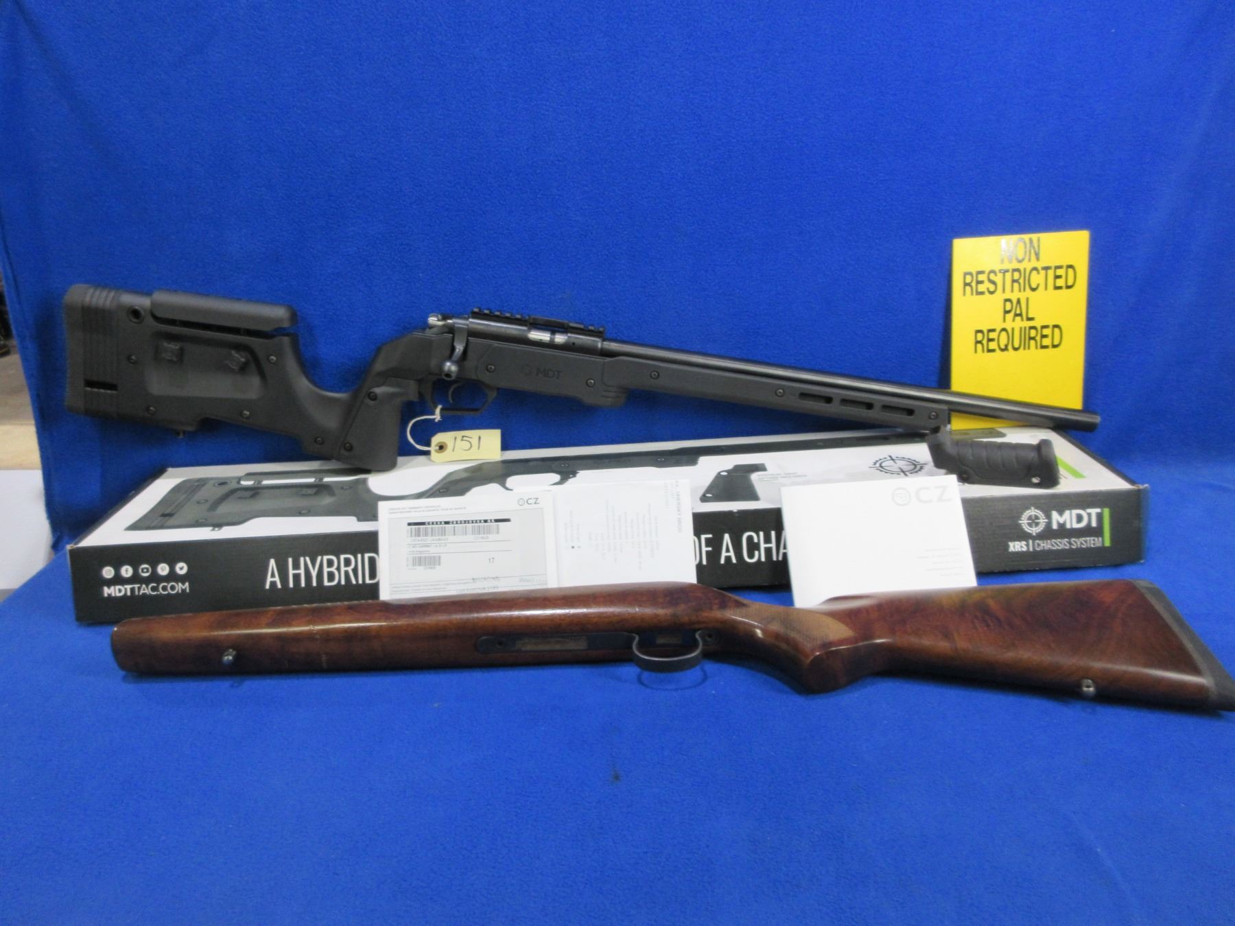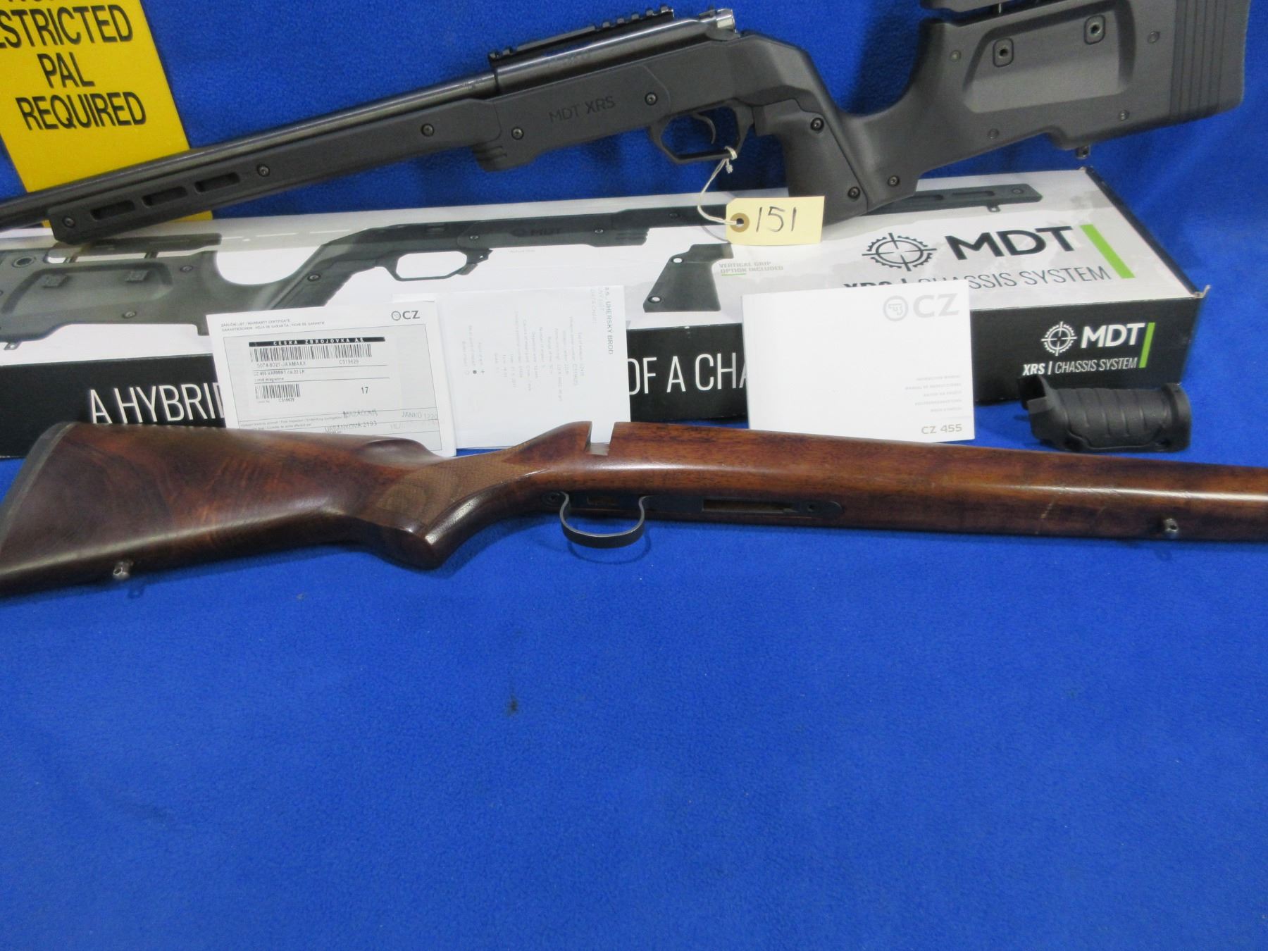 Non-Restricted - CZ Model 455 in 22 LR - This bolt action rifle with removable magazine is in very nice condition, action appears to be in very good working order. Comes with Mcarbo trigger spring installed and original spring in bag. Heavy barrel is 20 1/2", rifling is very good, bluing is very good, has no sights but has Picatinny rail, synthetic MDT XRS Chassis System is very good, length of pull is 14 1/2", rubber recoil pad good, comes with swivel studs, original wood stock (good with usage marks), pistol grip, original MDT box and paperwork. Ser # C319629