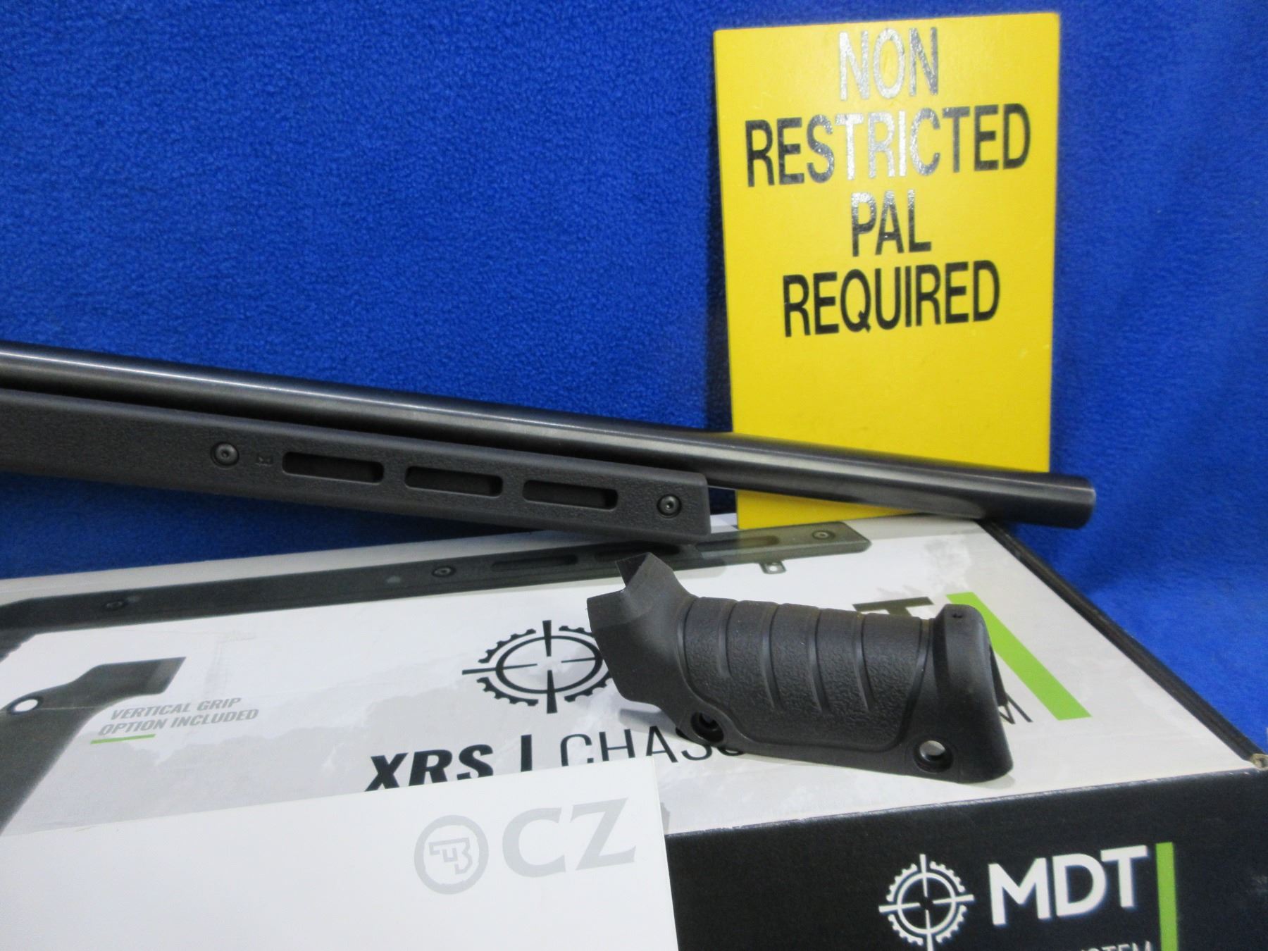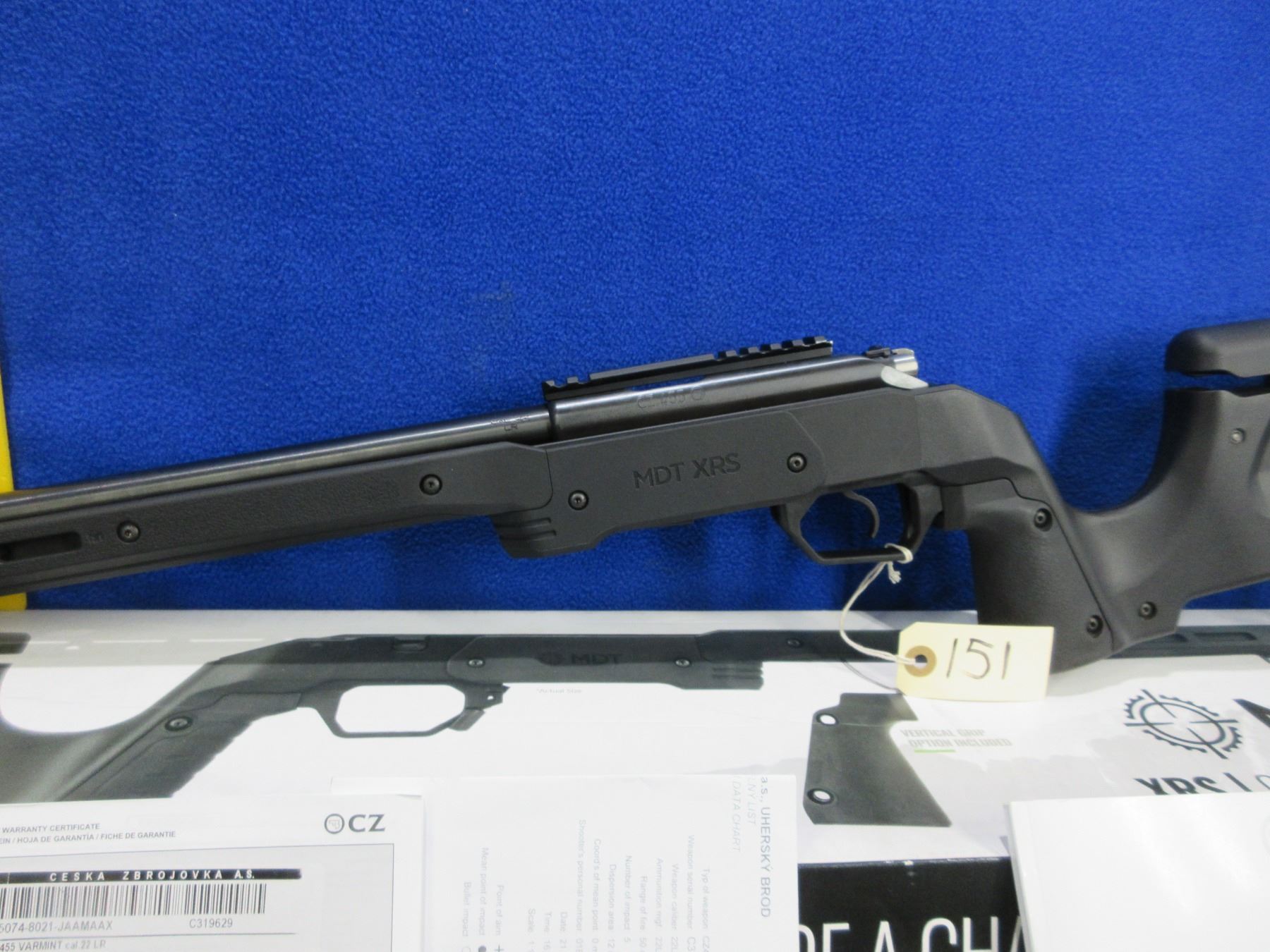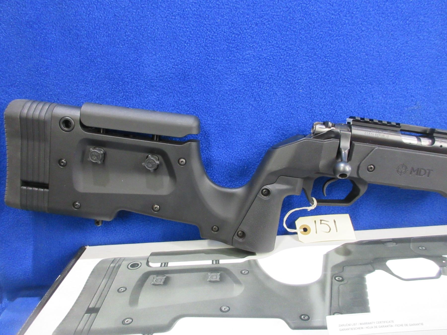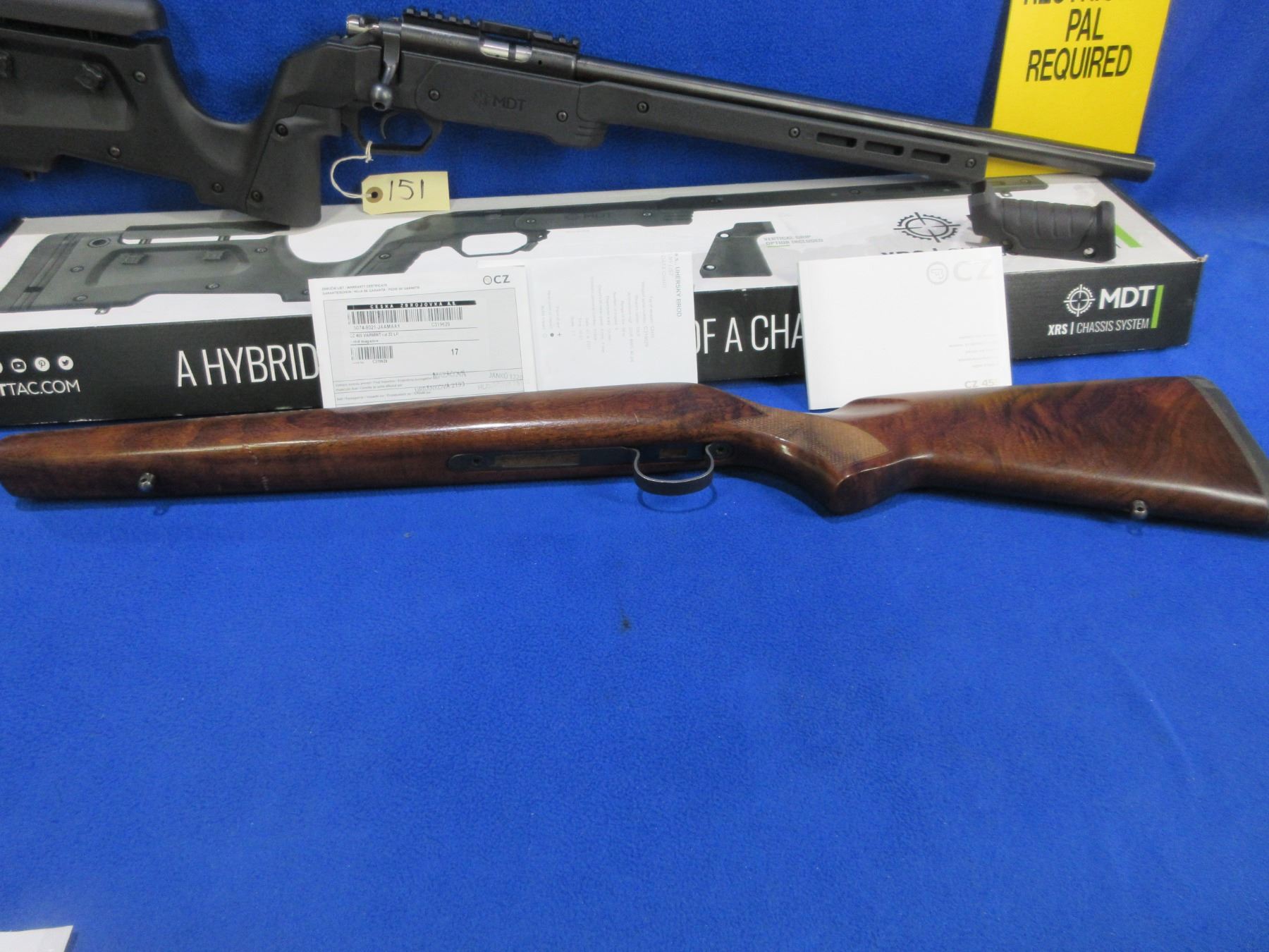 Non-Restricted - CZ Model 455 in 22 LR - This bolt action rifle with removable magazine is in very nice condition, action appears to be in very good working order. Comes with Mcarbo trigger spring installed and original spring in bag. Heavy barrel is 20 1/2", rifling is very good, bluing is very good, has no sights but has Picatinny rail, synthetic MDT XRS Chassis System is very good, length of pull is 14 1/2", rubber recoil pad good, comes with swivel studs, original wood stock (good with usage marks), pistol grip, original MDT box and paperwork. Ser # C319629