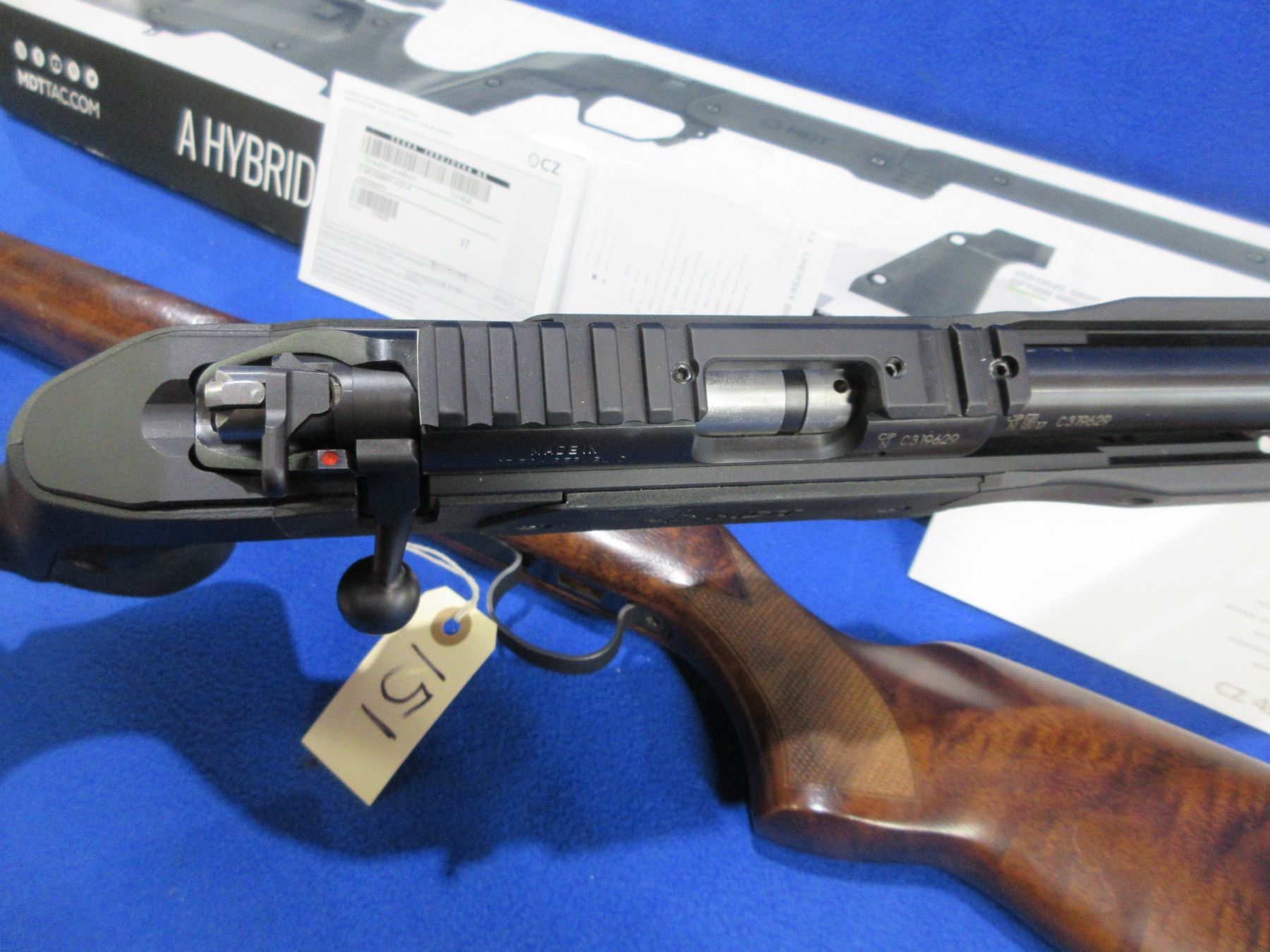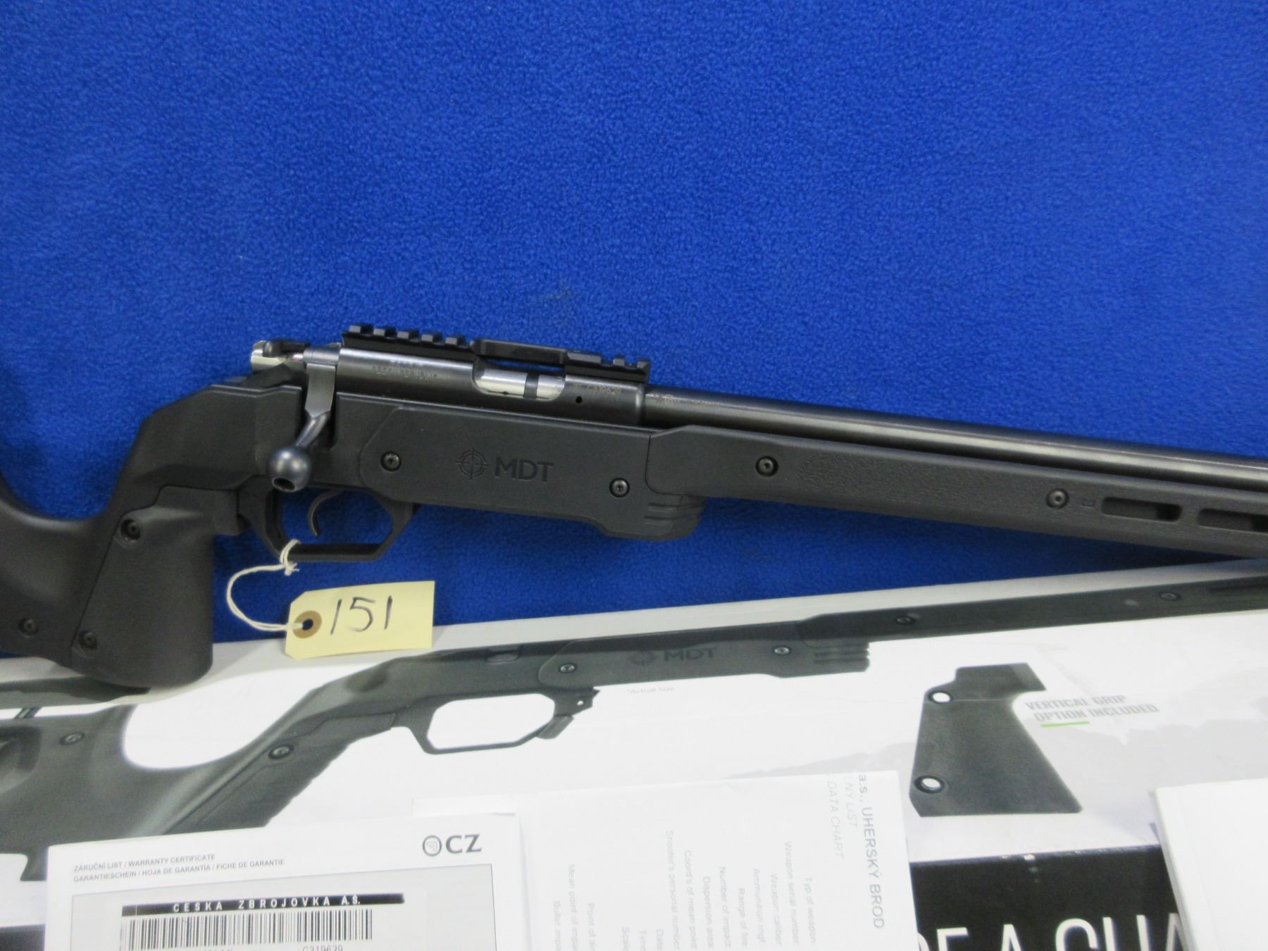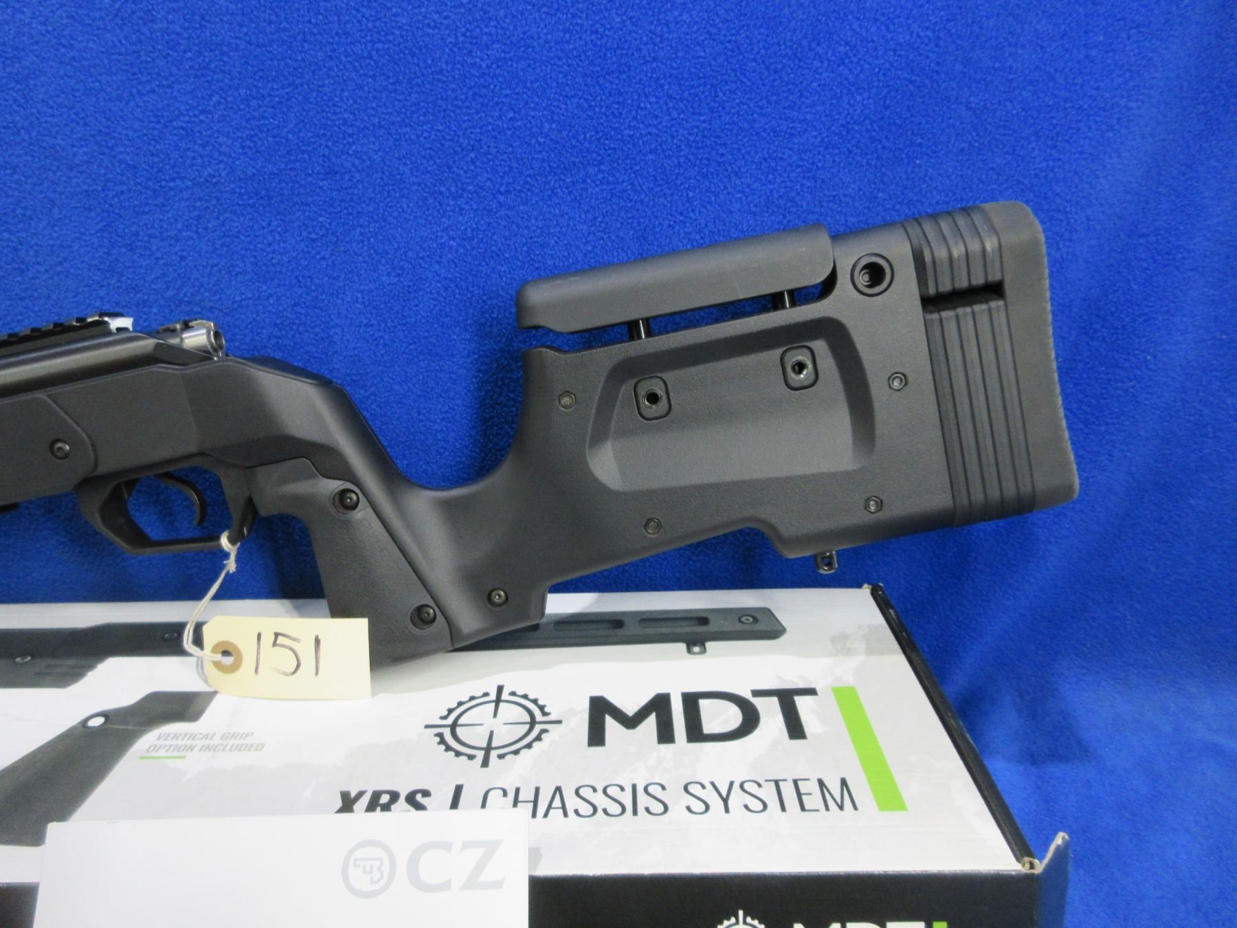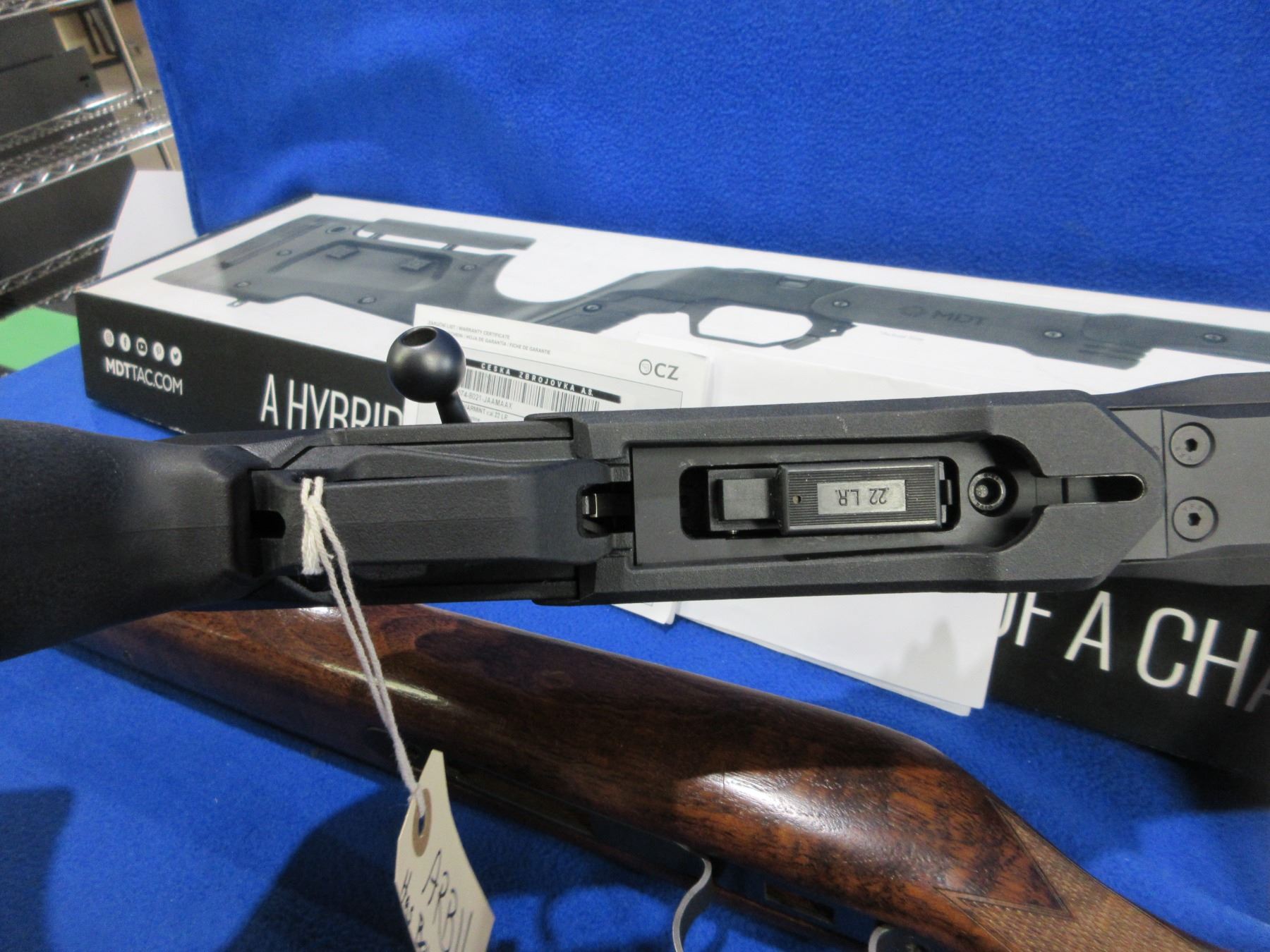 Non-Restricted - CZ Model 455 in 22 LR - This bolt action rifle with removable magazine is in very nice condition, action appears to be in very good working order. Comes with Mcarbo trigger spring installed and original spring in bag. Heavy barrel is 20 1/2", rifling is very good, bluing is very good, has no sights but has Picatinny rail, synthetic MDT XRS Chassis System is very good, length of pull is 14 1/2", rubber recoil pad good, comes with swivel studs, original wood stock (good with usage marks), pistol grip, original MDT box and paperwork. Ser # C319629
