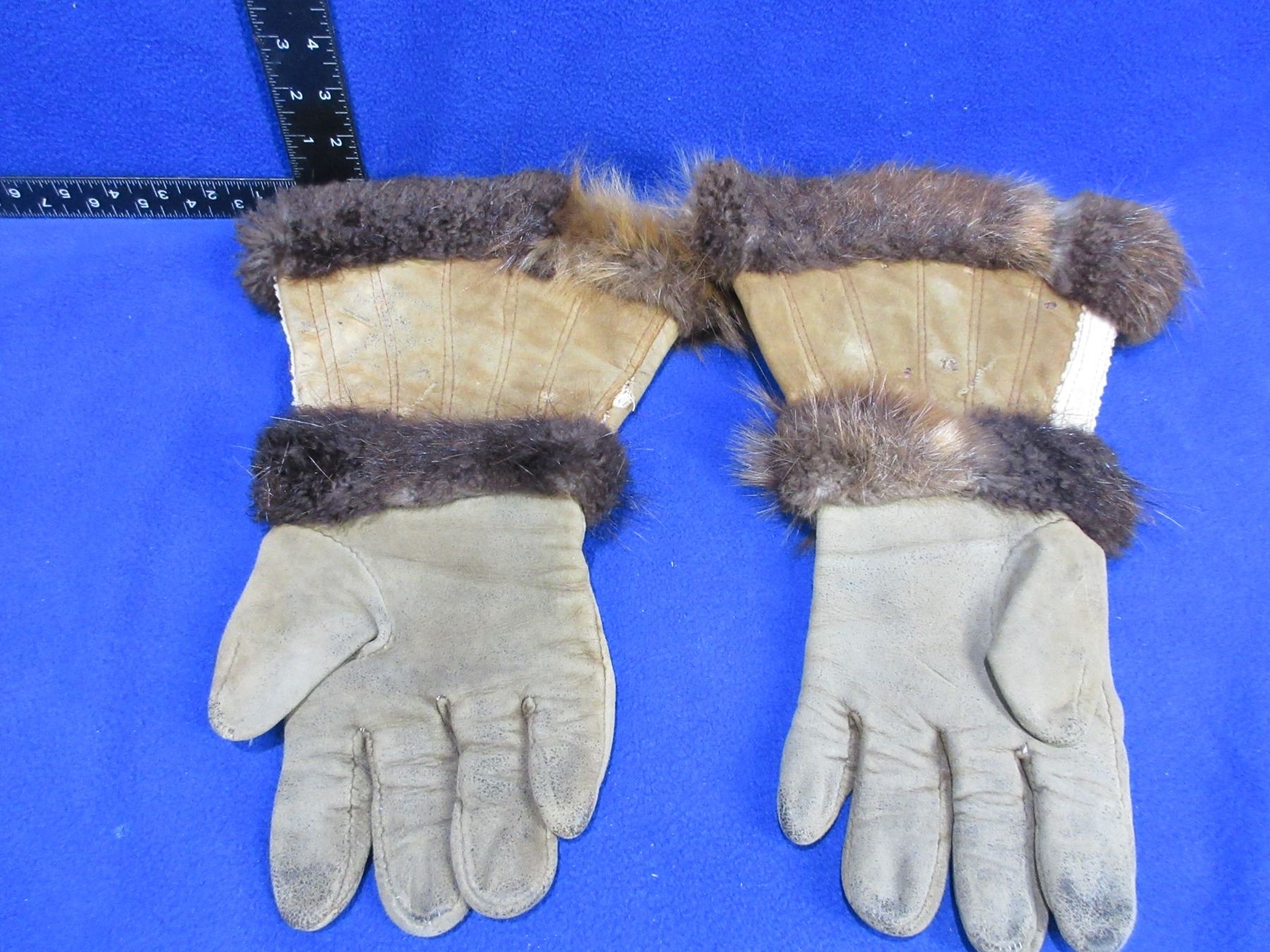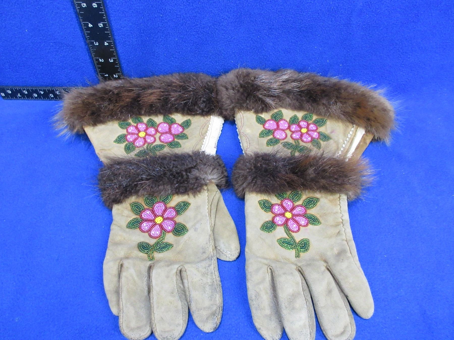 Native American Leather Gloves with Beadwork and Fur - Size Large