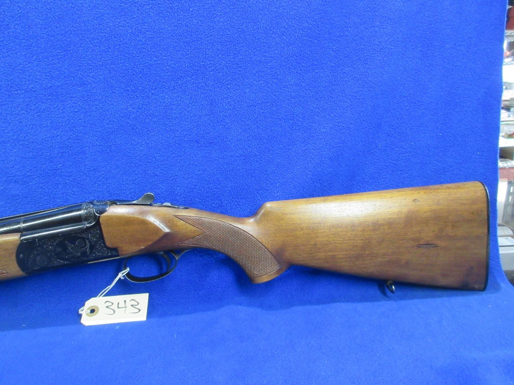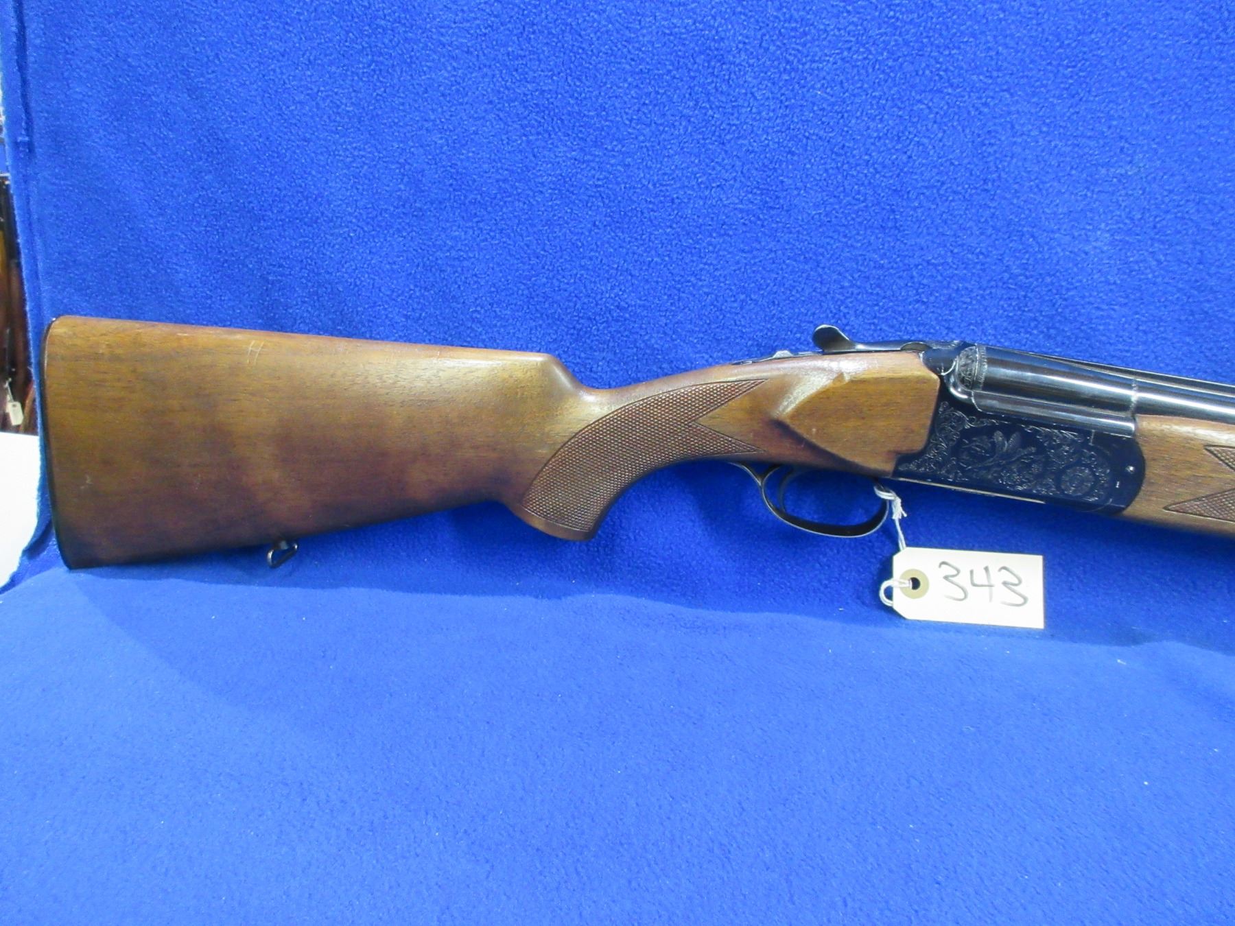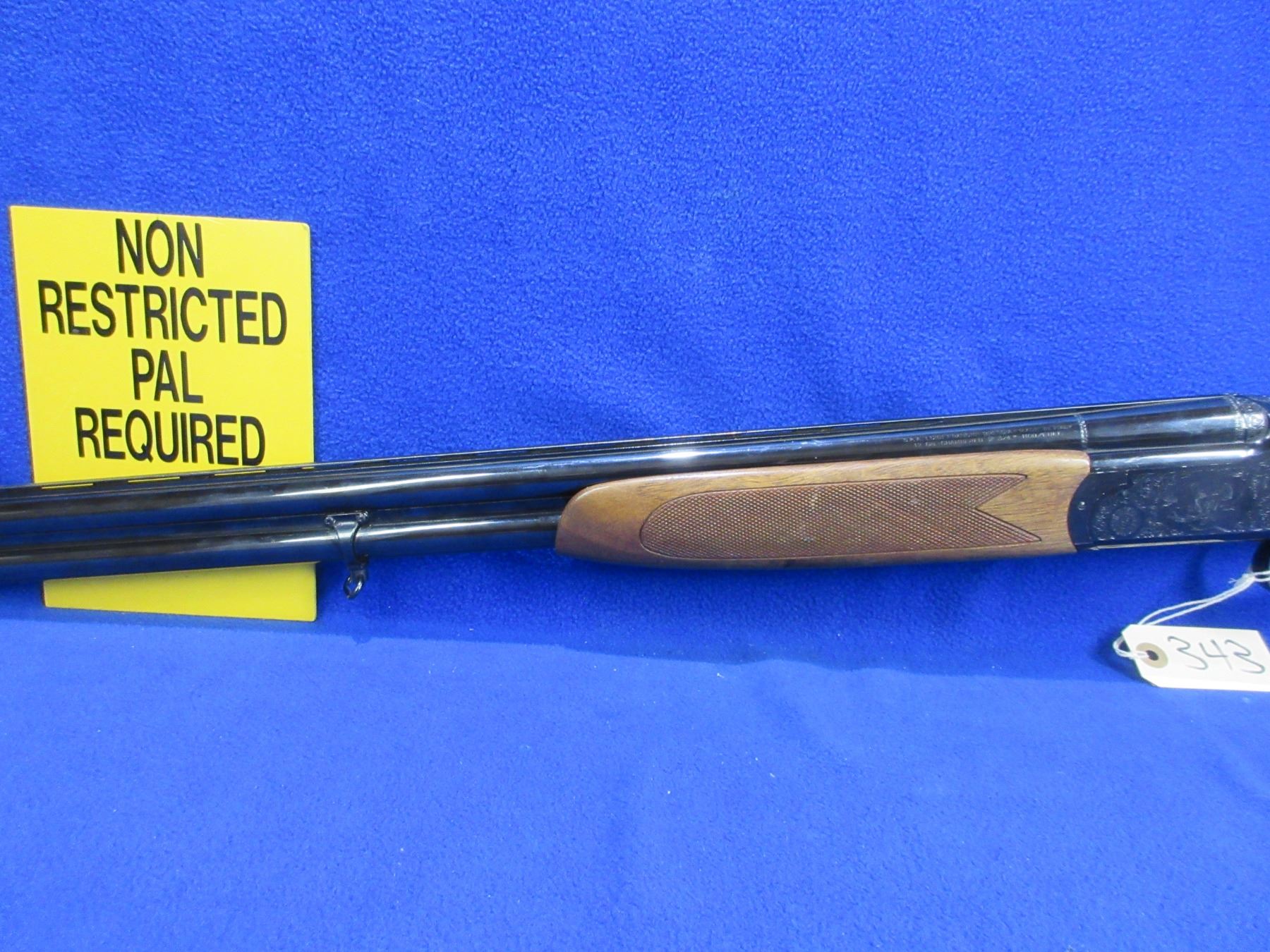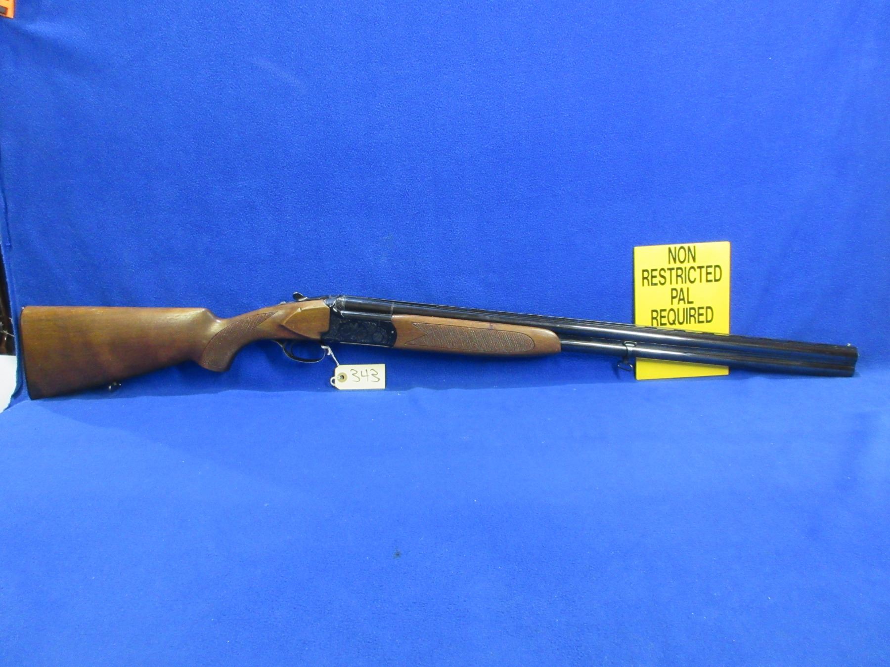 Non-Restricted - Franchi Brescia in 12 Ga. 2 3/4" Mod/Full - This is an over/under shotgun with chokes, nicely engraved action is tight and appears to be in good working order. Vent rib barrels are 28", bores are good but top barrel has a dent approx 4 1/2" from muzzle, bluing is good, has bead front sight, stock is good with usage marks, forearm is good with usage marks, length of pull is 14 1/4", butt plate good, comes with swivels. Ser # 400586