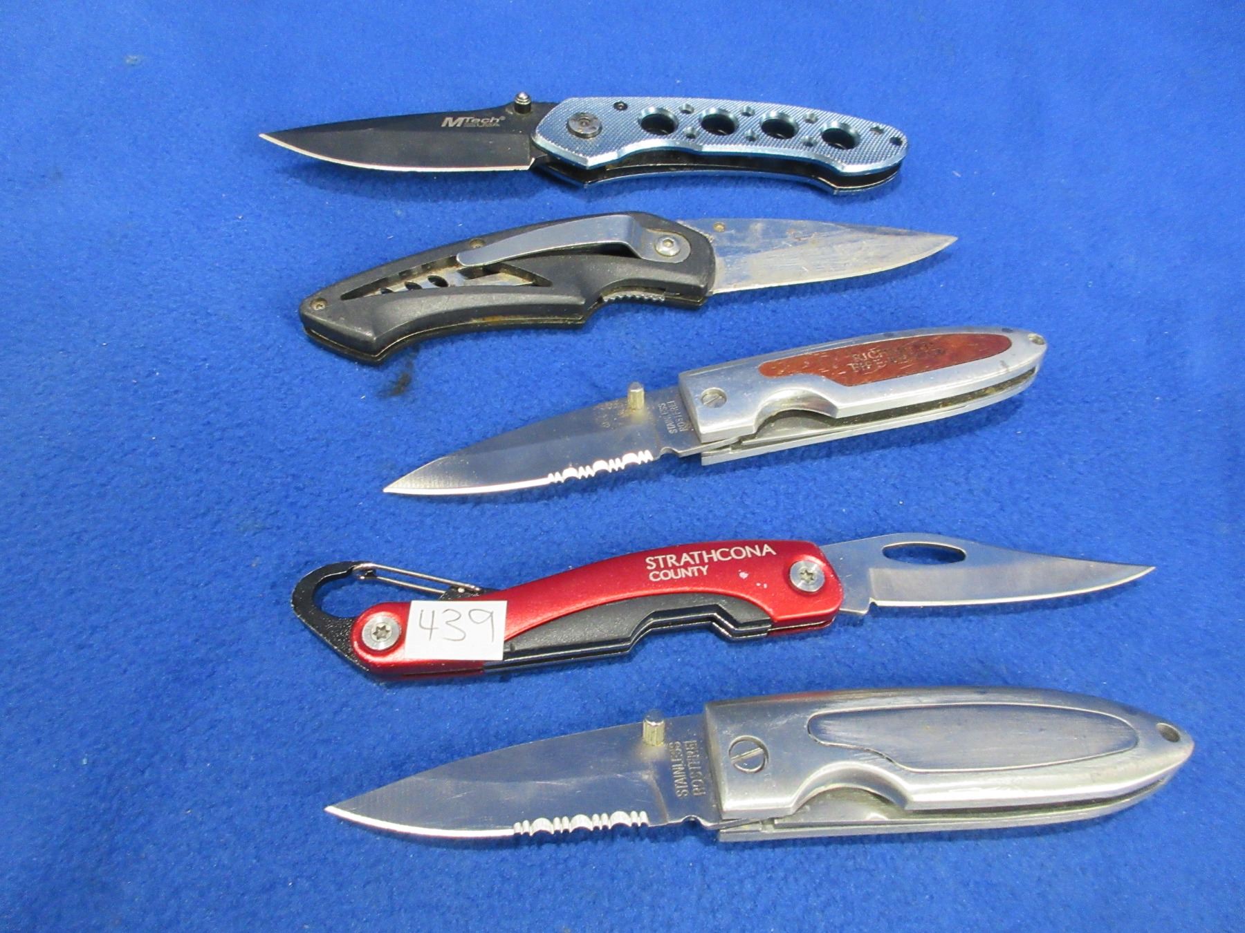 Lot 439 4 Folding Lock Blade Knives and 1 Folding Blade Knife