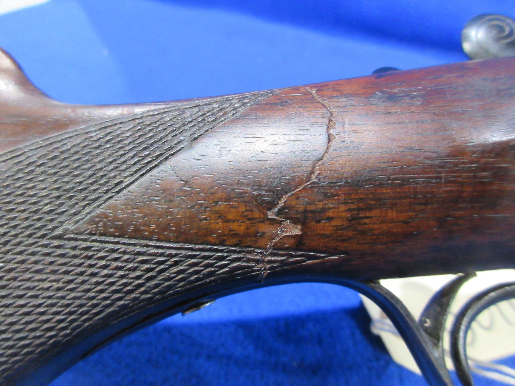Non-Restricted - Fortuna Suhl SXS in 12 Ga. 2 3/4" - This is a tip up SXS shotgun, action is tight and is in non working order as front trigger is seized and action is missing a screw, rear trigger does cock and fire. Barrels are 26 3/4", bores are good, bluing is good, has bead front sight, stock has a major crack repair in the wrist area, forearm is good, length of pull is 15", rubber recoil pad, trigger guard and front swivel have incorrect screws, comes with swivels. Ser # 516988