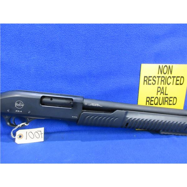 Non-Restricted - Rokin Model PX-4 in 12 Ga. 3" - This is a pump action shotgun with tube magazine, action appears to be in very good working order. Barrel is 18.5", bore is good, black finish is good to very good, has blade front sight and integral rail, synthetic stock is very good, forearm is very good, length of pull is 14 1/2", rubber recoil pad very good, comes with swivel studs. Ser # 21CA-RKP0621-40