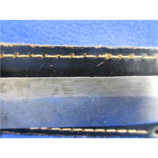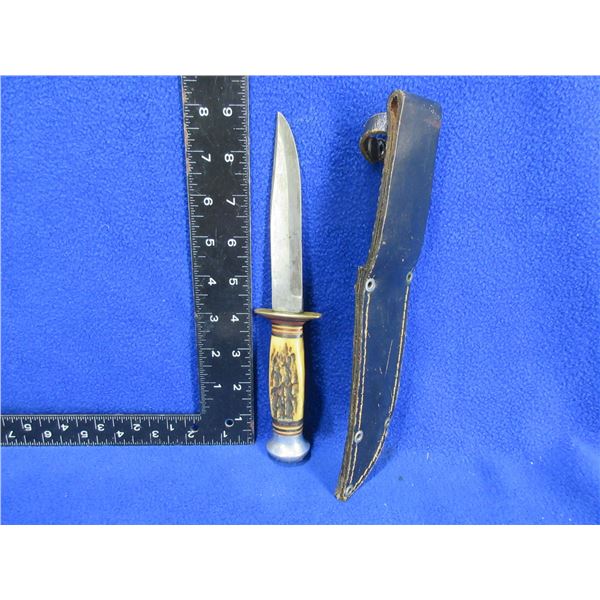 Vintage Fixed Blade Knife w/ Stag Handle & Leather Sheath - 4 3/4" Blade, 8 3/4" Total Length