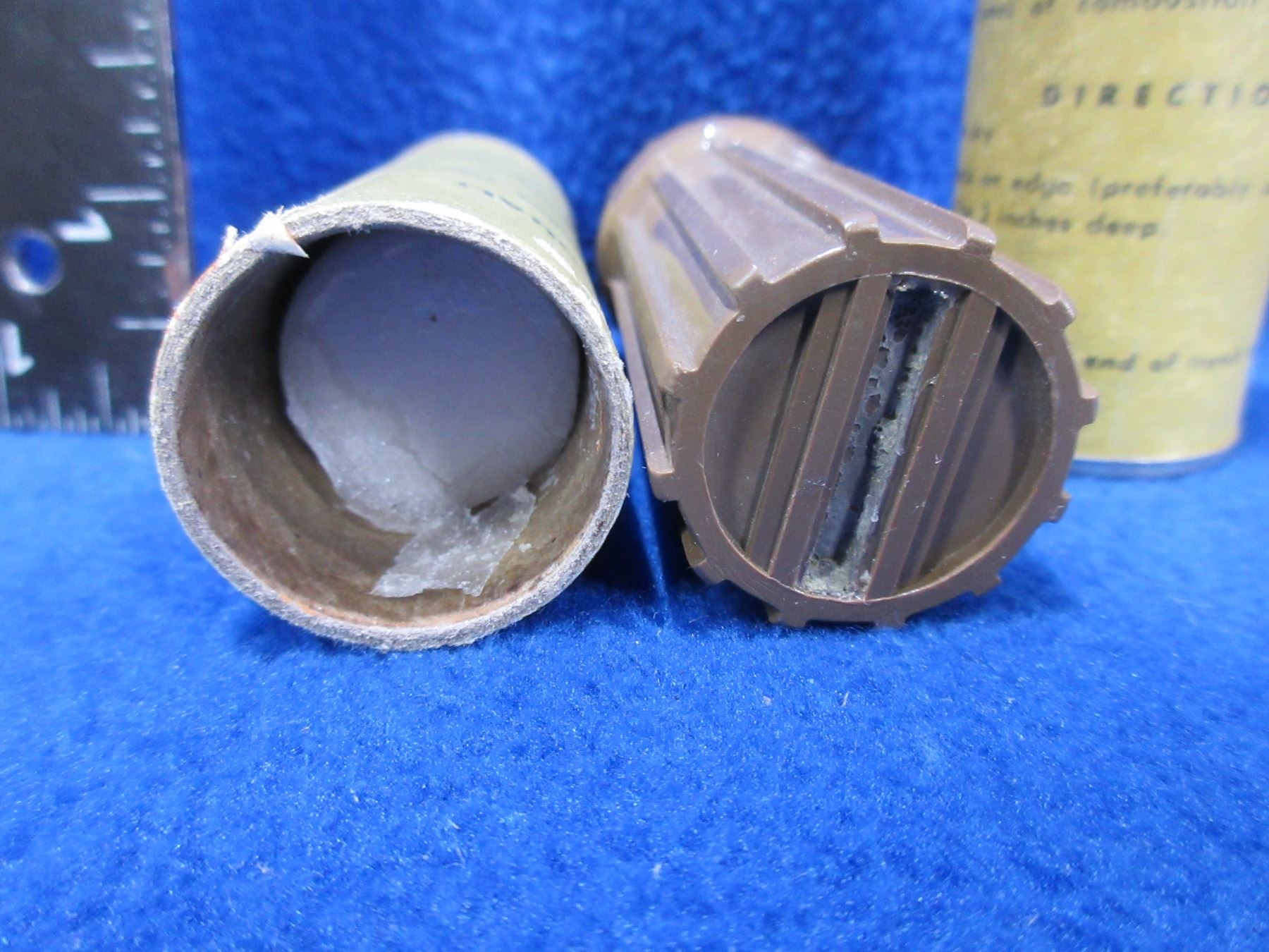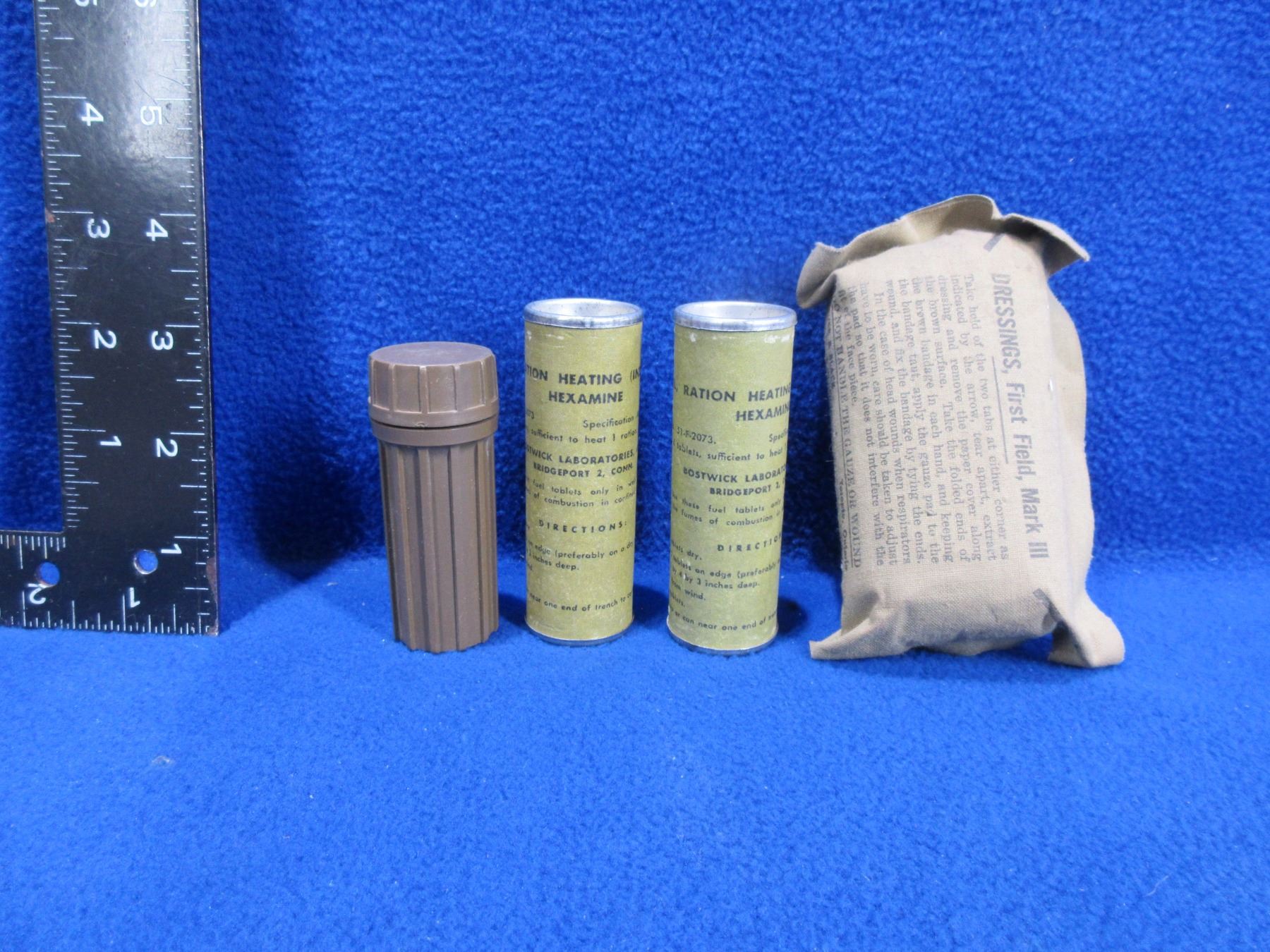 Lot 1050 2 Vintage Military Hexa Heating Fuel Tubes, Field Dressing & Match Safe