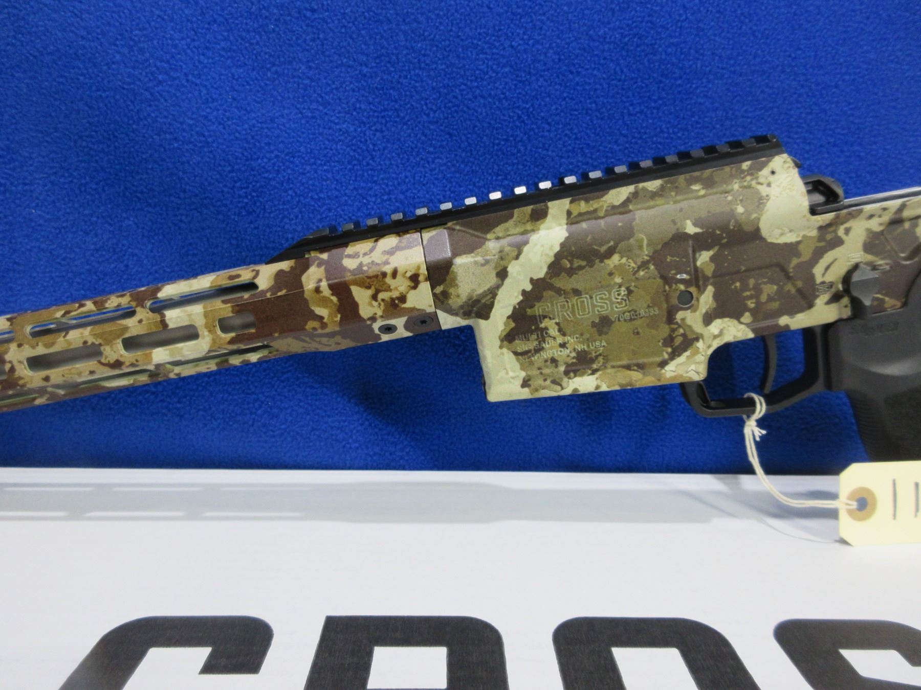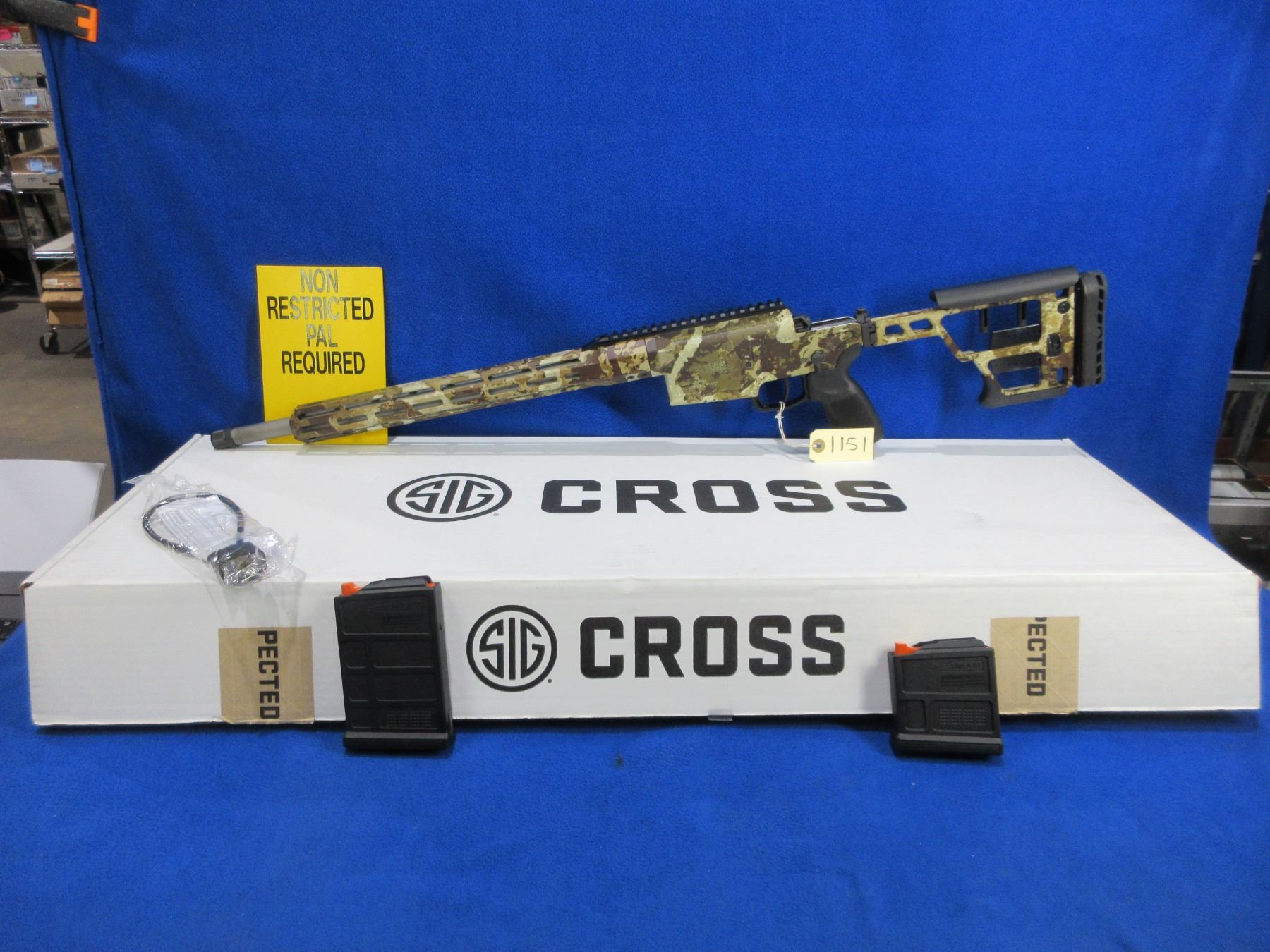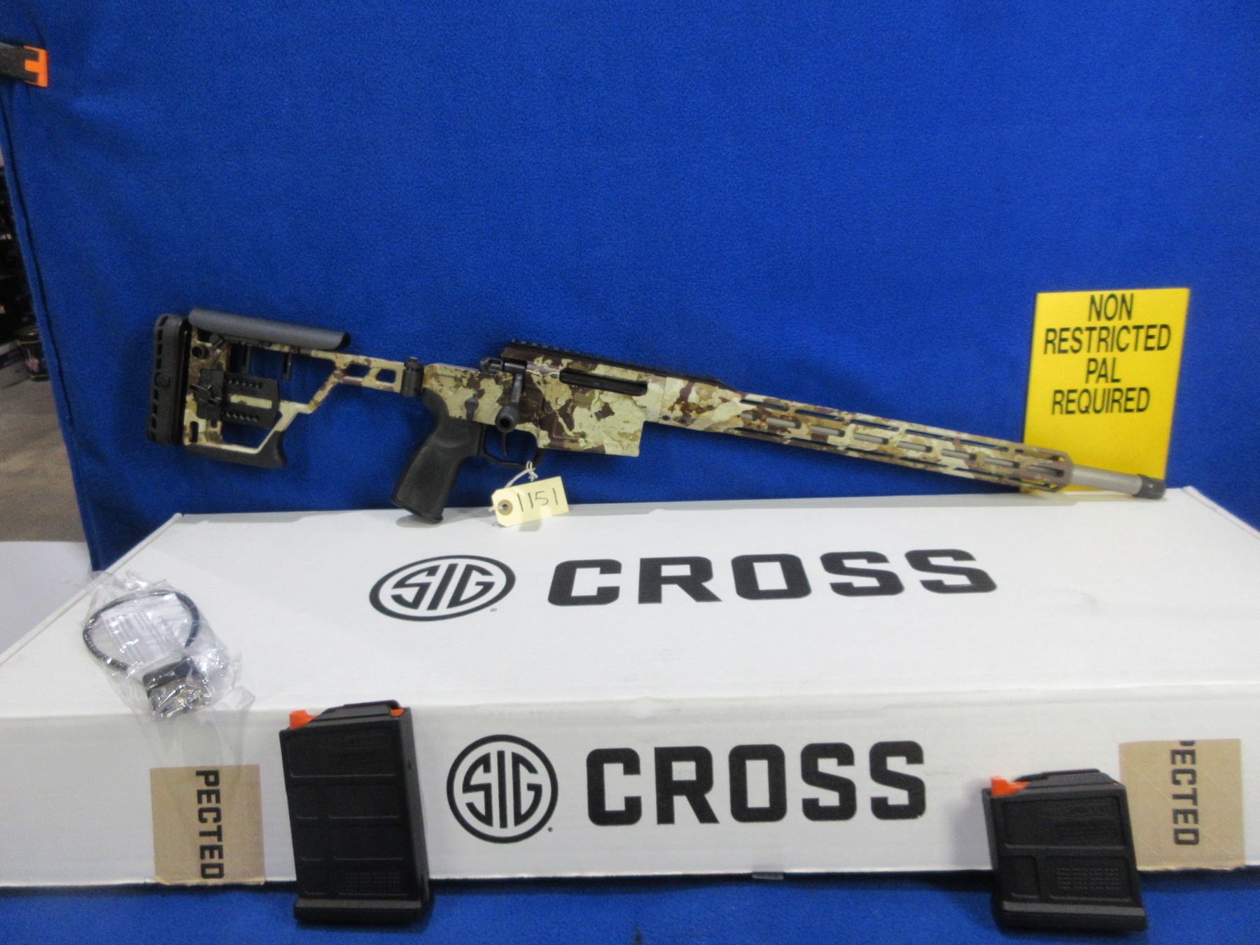 Non-Restricted - Sig Sauer Model Cross in 6.5 Creedmoor - This is a bolt action rifle with 2 removable magazines, action appears to be in very good working order. Barrel is 18.5", rifling is good to very good, First Lite Cipher Armakote finish good to very good, has no sights but has picatinny rail, adjustable folding SIG Precision stock is good to very good, length of pull is 12 3/4" - 14 3/4"", M-LOK accessory rail, rubber recoil pad good, comes with 2 magazines (P-Mag 5 & P-Mag 10), cable lock and original box. Ser # 70G016433