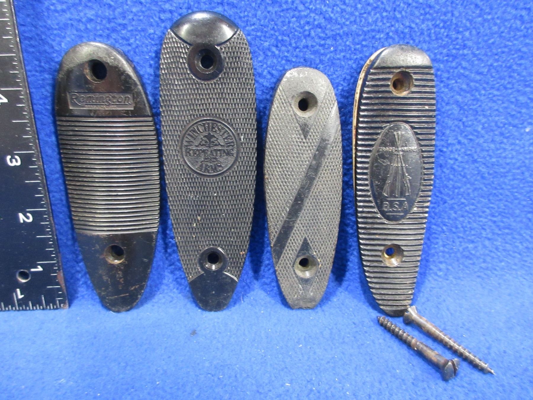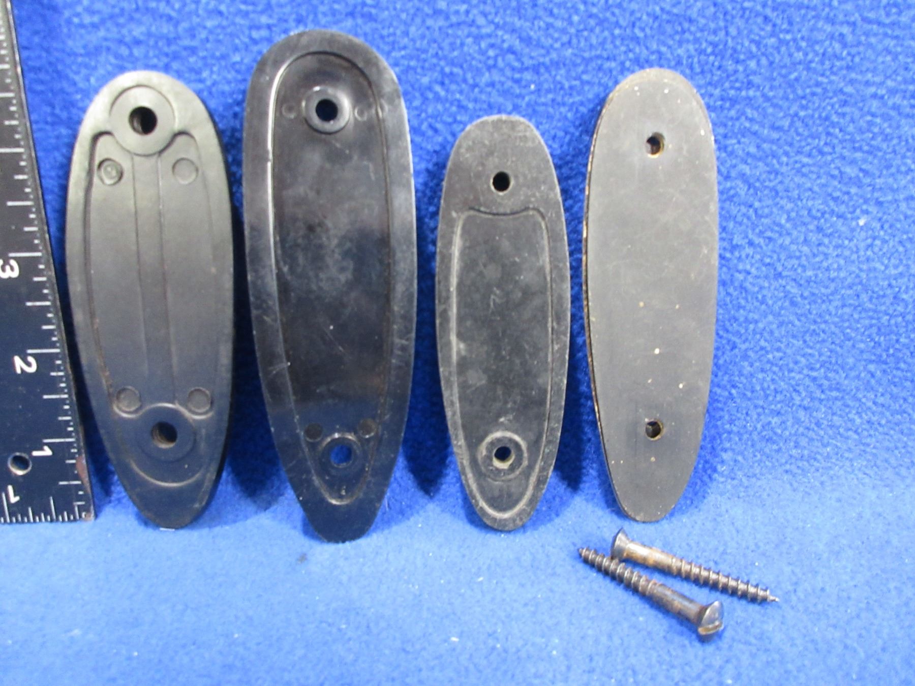 4 Butt Plates - Rem. 3 1/8" C/C, Win. 3 3/8" C/C, BSA 3" C/C, Unknown 2 7/8" C/C (Toe is Chipped)