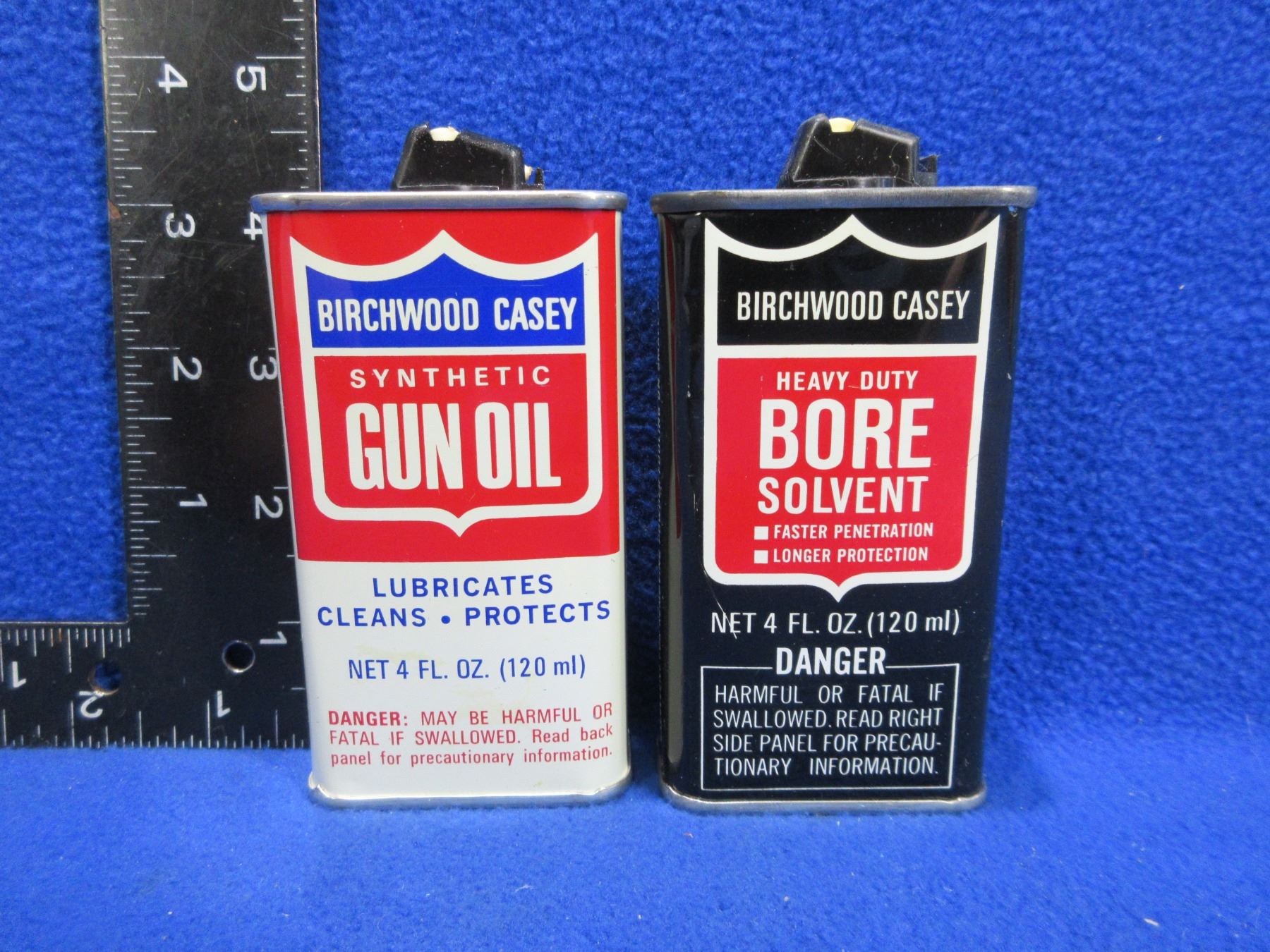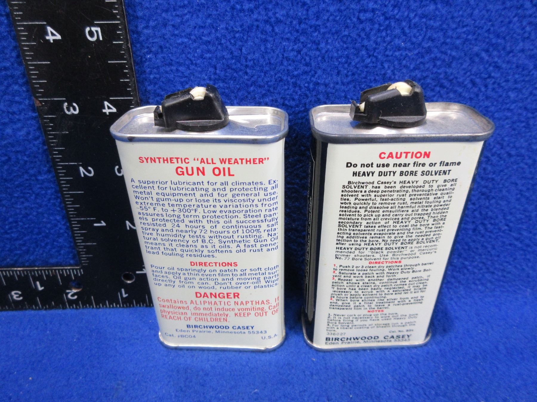 2 Vintage Birchwood Casey Tins - Gun Oil & Bore Solvent - Bore solvent is 1/4 full, gun oil is almost empty