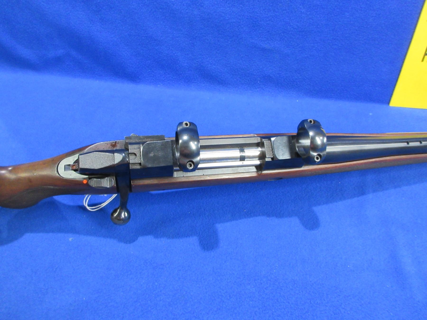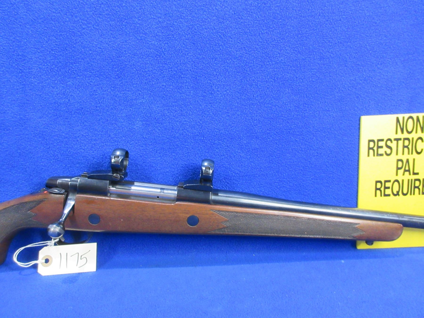 Non-Restricted - Sako Model AV in 375 H&H - This is a bolt action rifle with floorplate magazine, action appears to be in good to very good working order. Barrel is 23", rifling is good to very good, bluing is good with some light speckling, sights are missing but has Redfield 1" rings, stock is good to very good with usage marks, length of pull is 14", rubber recoil pad good, comes with swivel studs. Ser # 597957