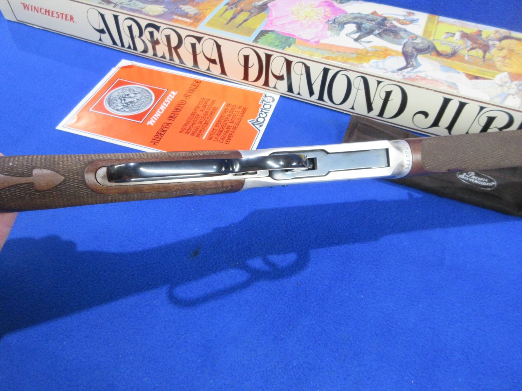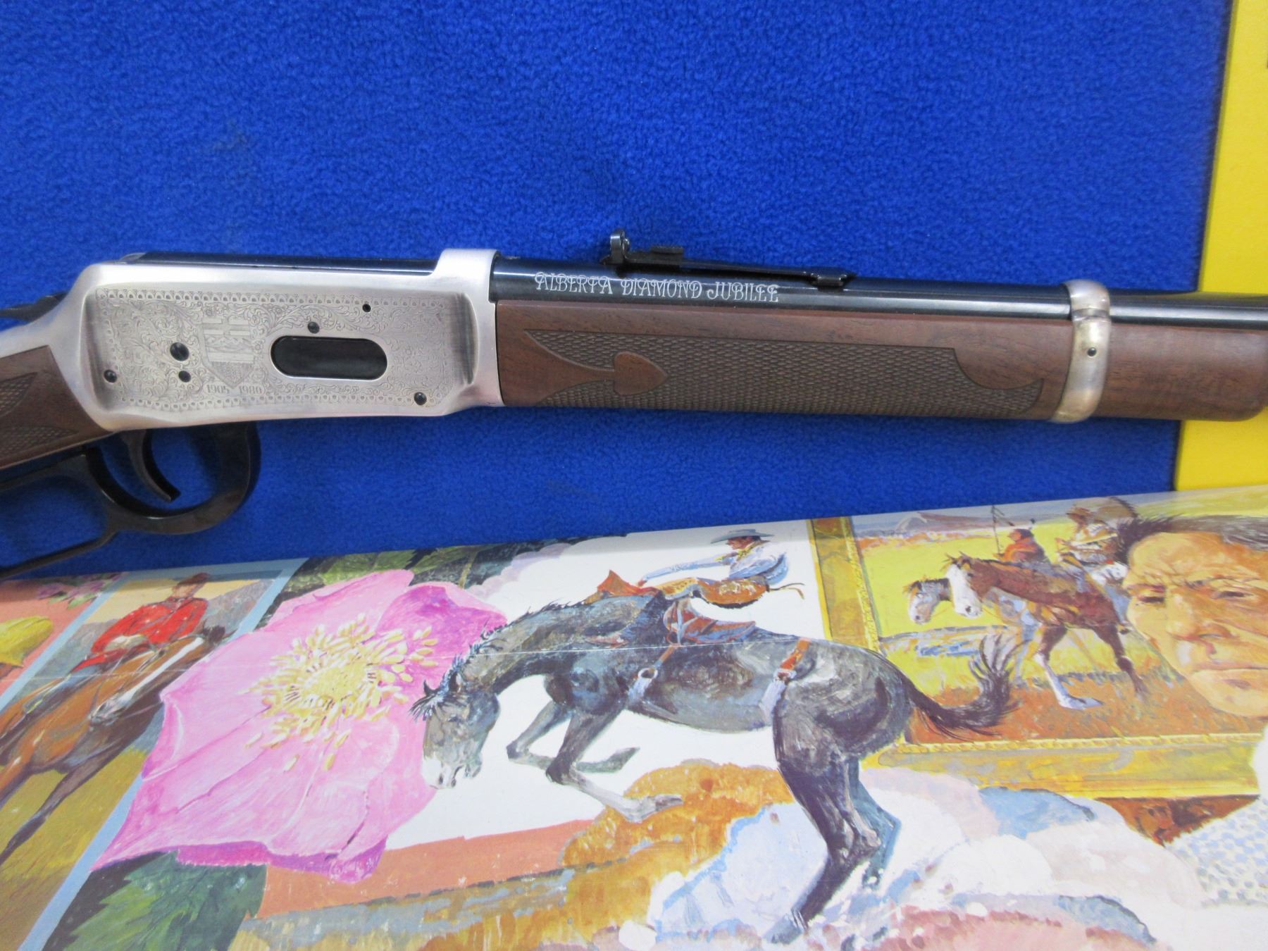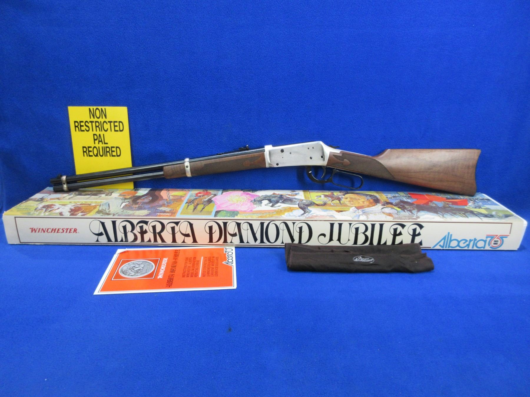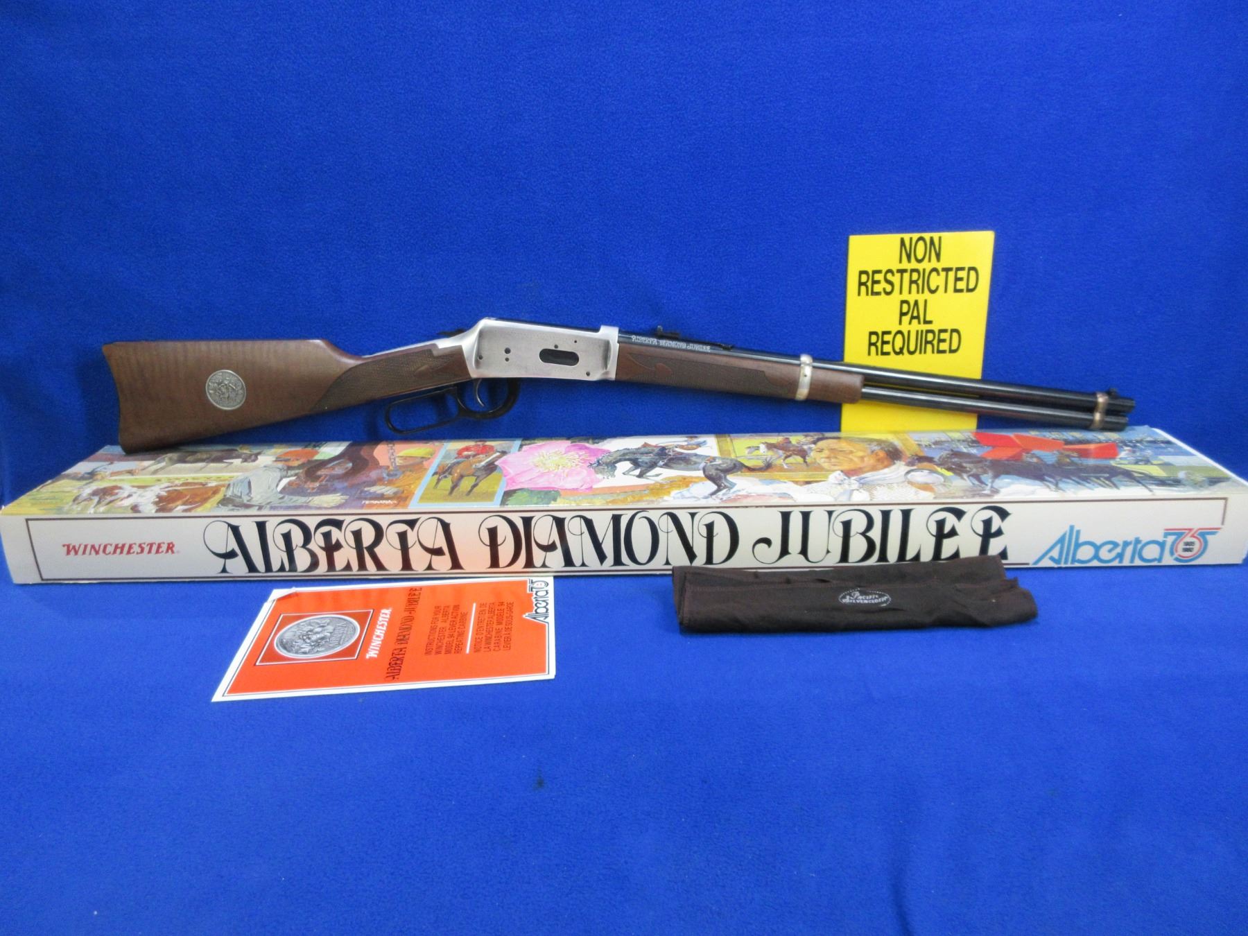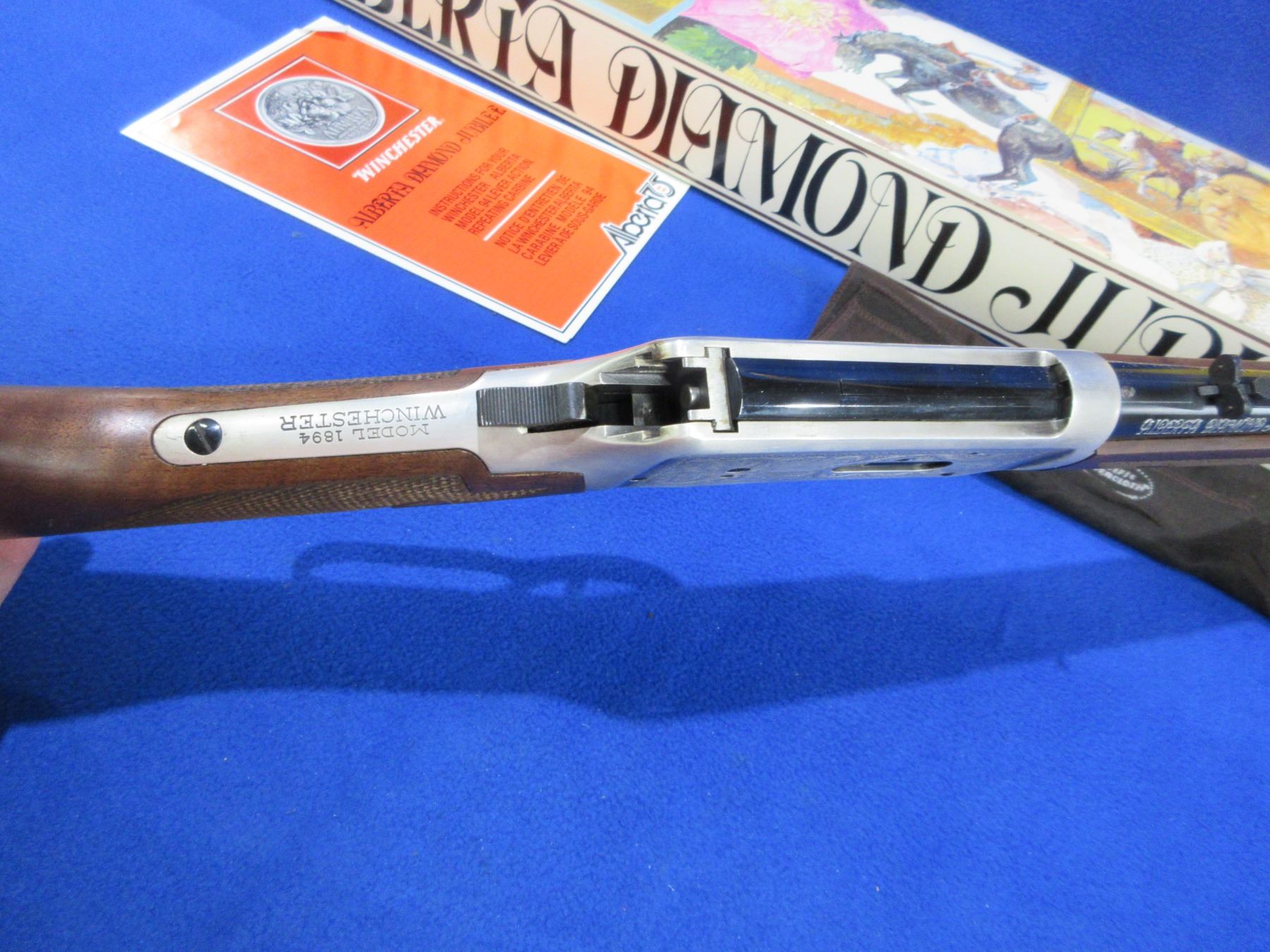 NEW - Non-Restricted - Winchester Model 94 Alberta Diamond Jubilee Commemorative in 38-55 Win. - This NEW lever action rifle with tube magazine is part of a 3 rifle set with matching serial numbers (Lots 1201, 1202, 1203). Round barrel with silver lettering "Alberta Diamond Jubilee" is 20", length of pull is 13 1/4", comes with original box, paperwork and silver protection cloth. Produced to mark the 1905-1980 Diamond Jubilee of the Canadian province of Alberta. Silver-plated receiver and barrel bands, with the remaining parts deeply blued. The right side of the receiver shows the dates "1905-1980" and a coat of arms, while the left depicts oil derricks and sheep against mountains. American walnut with spade-design checkering (Winchester Style F) and an inlaid Alberta Coat of Arms medallion. Ser # ADJ2779