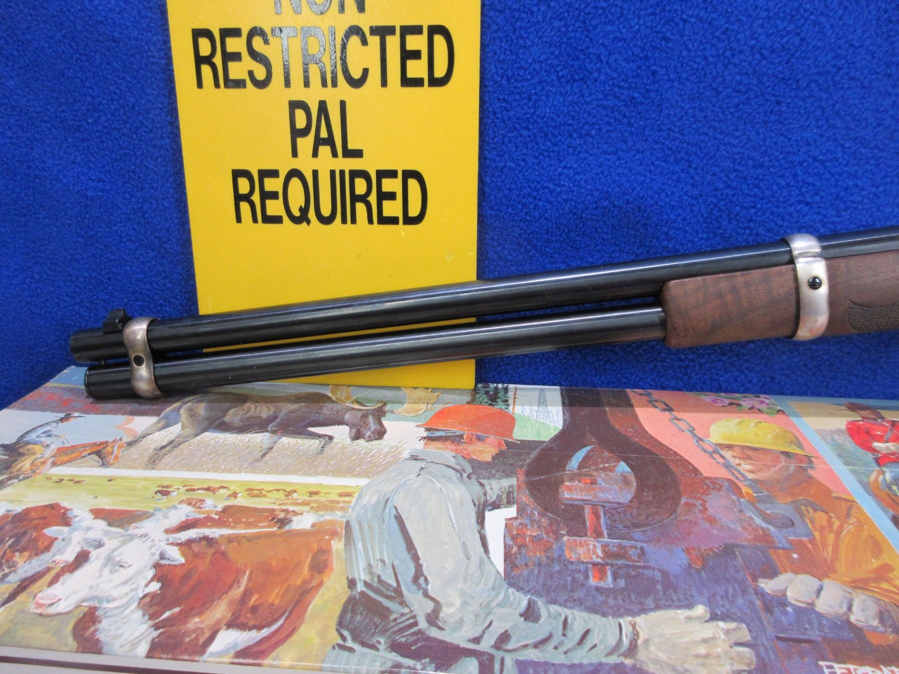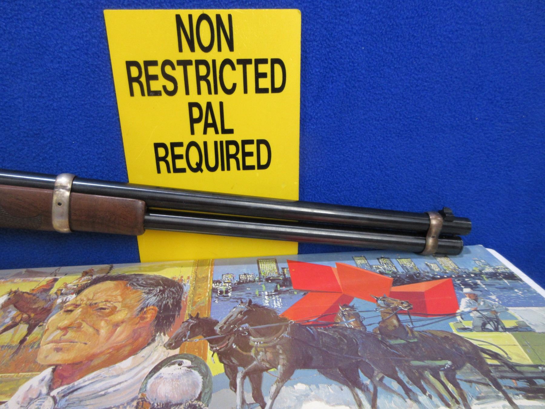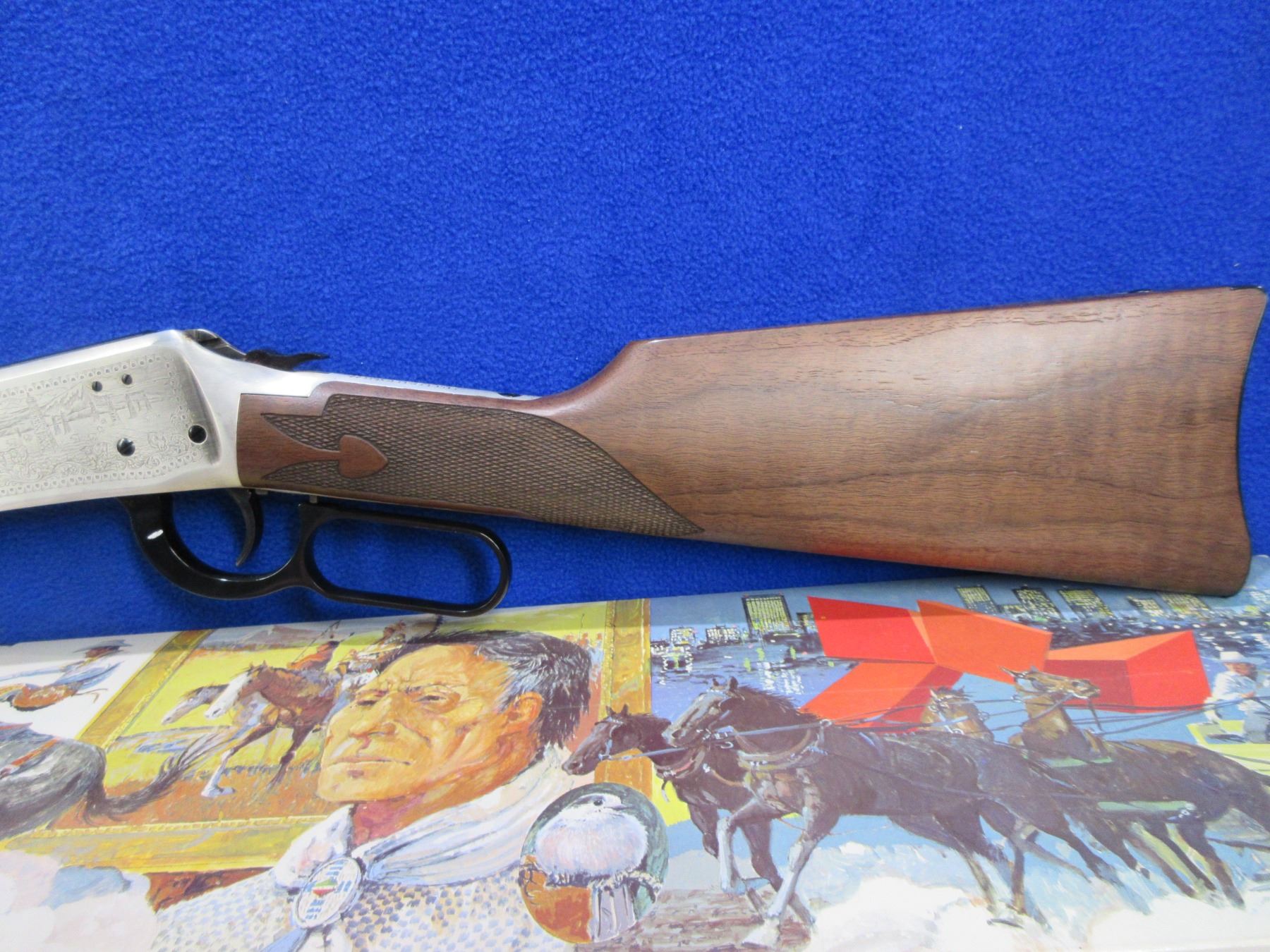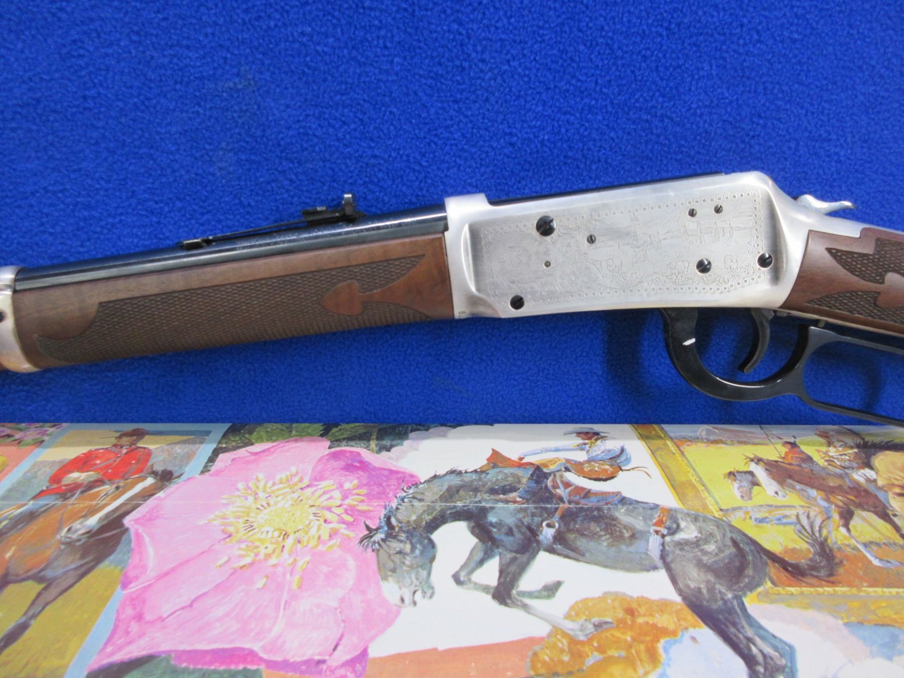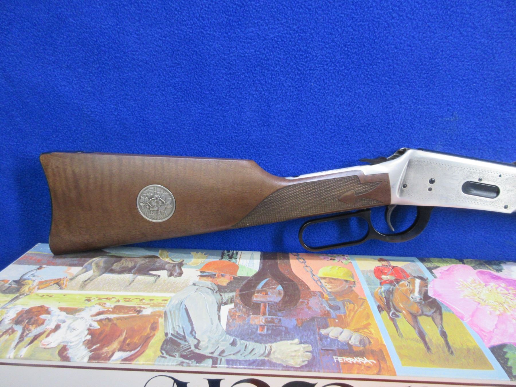 NEW - Non-Restricted - Winchester Model 94 Alberta Diamond Jubilee Commemorative in 38-55 Win. - This NEW lever action rifle with tube magazine is part of a 3 rifle set with matching serial numbers (Lots 1201, 1202, 1203). Round barrel with silver lettering "Alberta Diamond Jubilee" is 20", length of pull is 13 1/4", comes with original box, paperwork and silver protection cloth. Produced to mark the 1905-1980 Diamond Jubilee of the Canadian province of Alberta. Silver-plated receiver and barrel bands, with the remaining parts deeply blued. The right side of the receiver shows the dates "1905-1980" and a coat of arms, while the left depicts oil derricks and sheep against mountains. American walnut with spade-design checkering (Winchester Style F) and an inlaid Alberta Coat of Arms medallion. Ser # ADJ2779