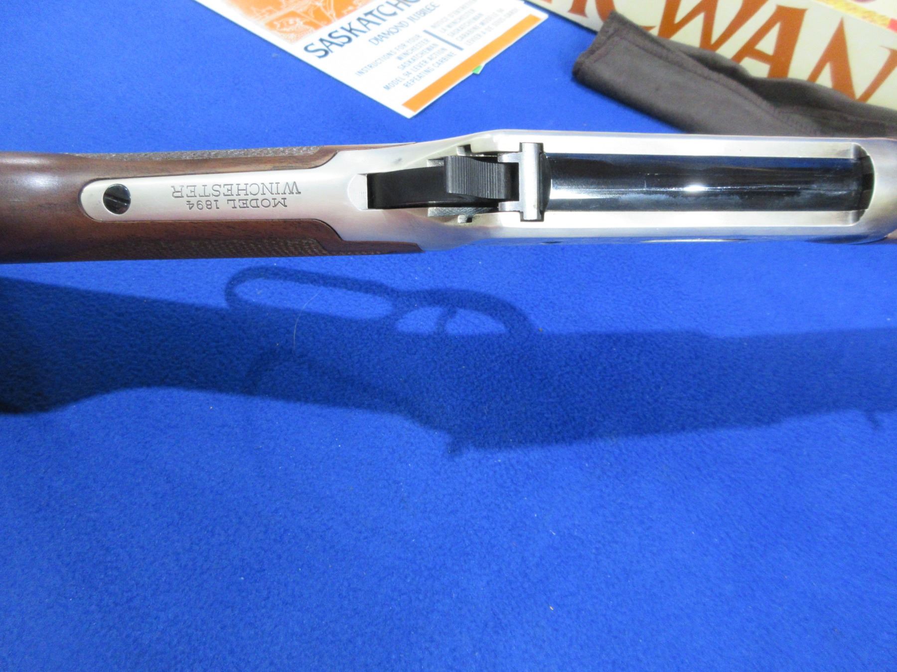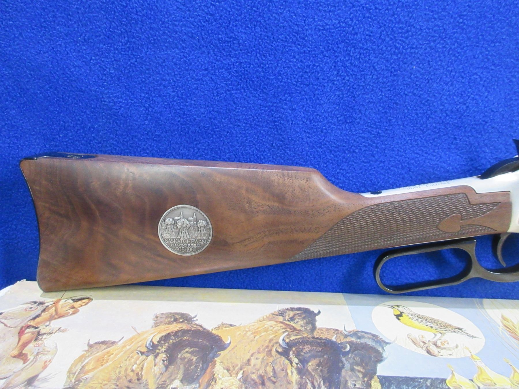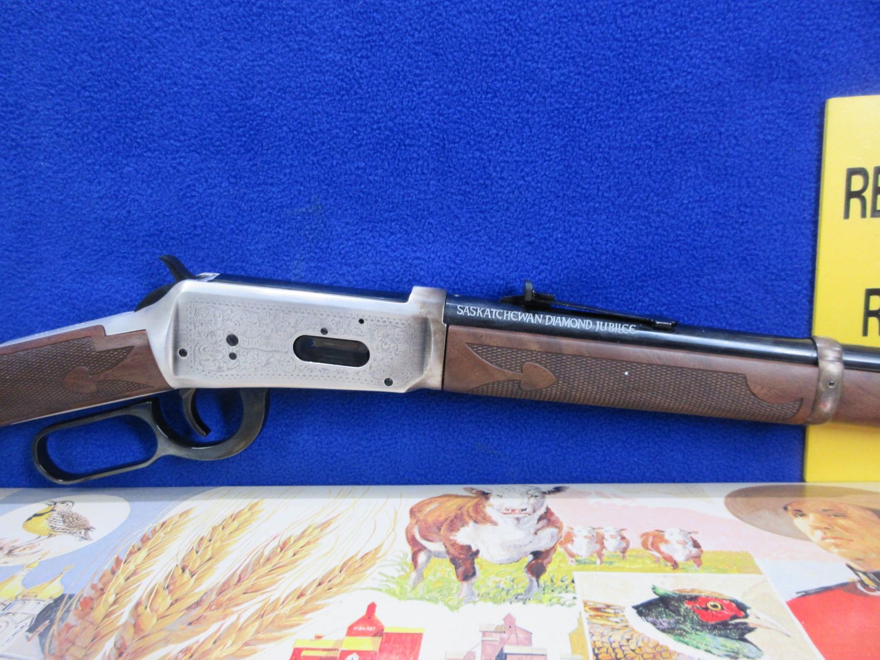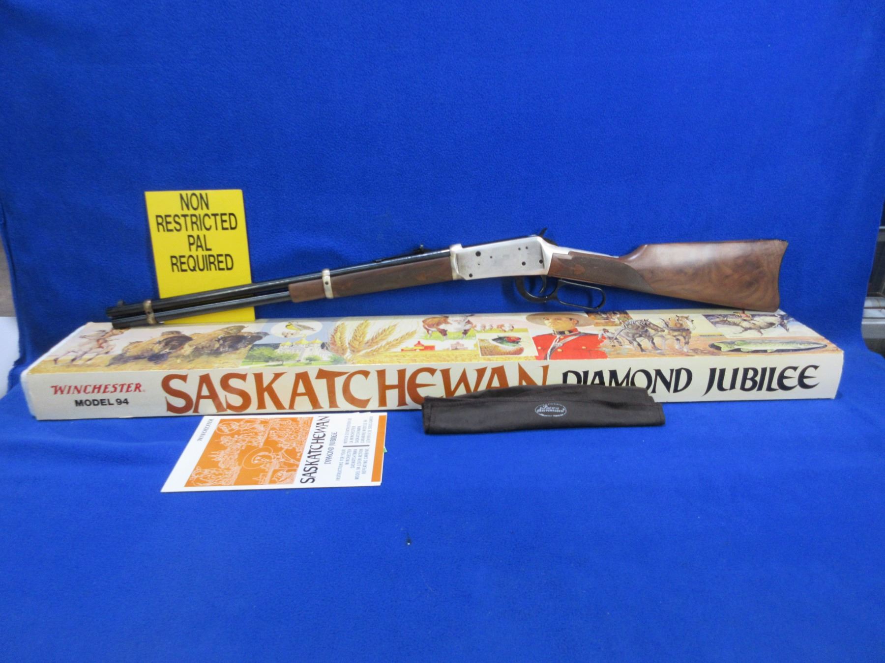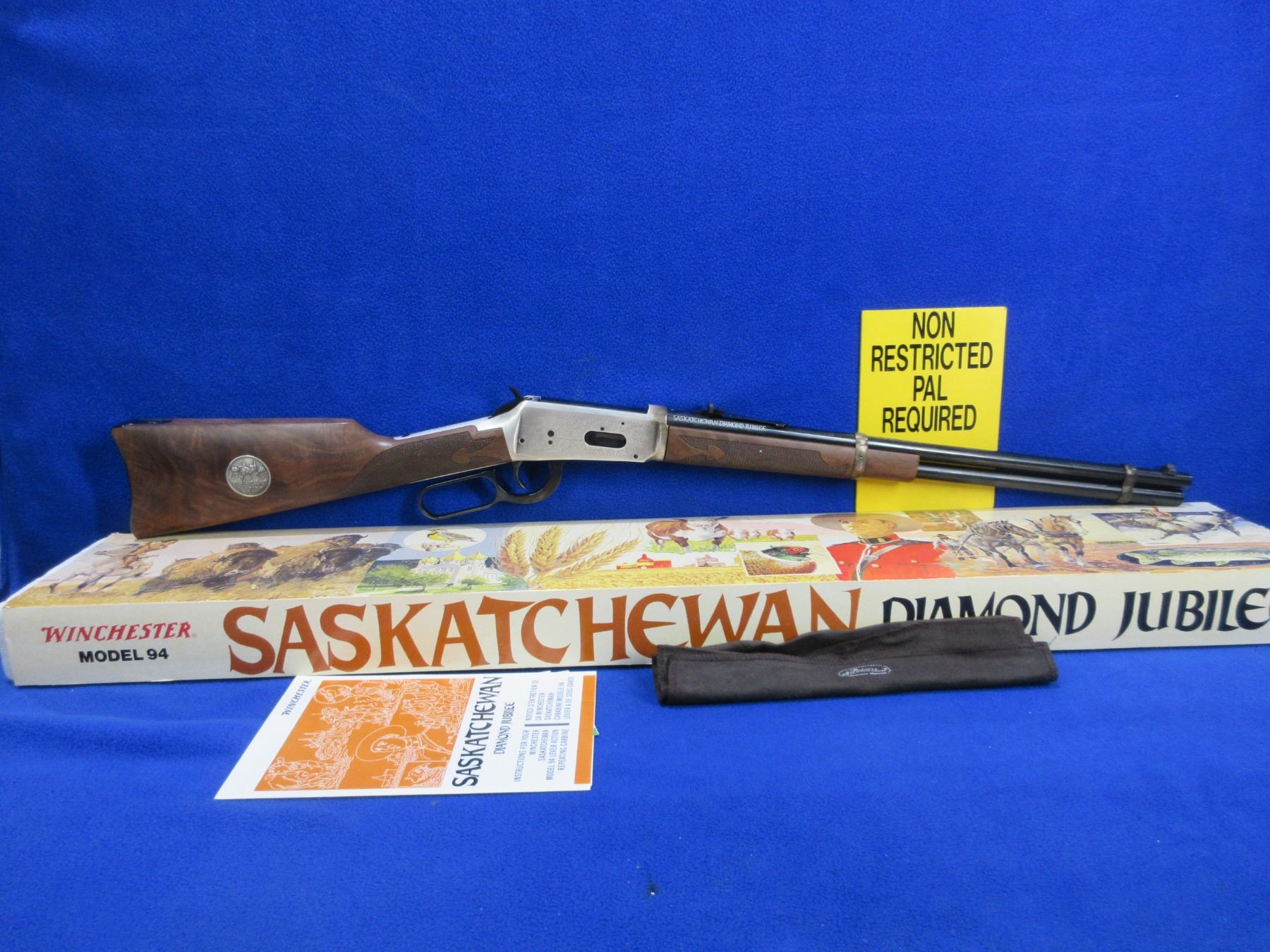 NEW - Non-Restricted - Winchester Model 94 Saskatchewan Diamond Jubilee Commemorative in 38-55 Win. - This NEW lever action rifle with tube magazine is part of a 3 rifle set with matching serial numbers (Lots 1201, 1202, 1203). Round barrel with silver lettering "Saskatchewan Diamond Jubilee" is 20", length of pull is 13 1/4", comes with original box, paperwork and silver protection cloth. Produced to mark the 1905-1980 Diamond Jubilee of the Canadian province of Saskatchewan. Silver-plated receiver and barrel bands, with the remaining parts deeply blued. The right side of the receiver shows the dates "1905-1980" and a coat of arms, while the left depicts a field of gathered wheat stalks with mills in the background. American walnut with spade-design checkering (Winchester Style F) and an inlaid Saskatchewan Coat of Arms medallion.Ser # SDJ2779