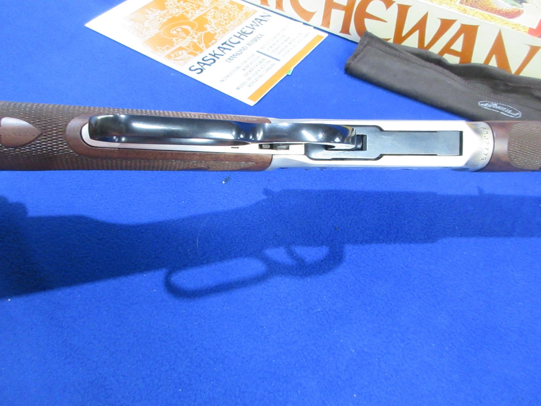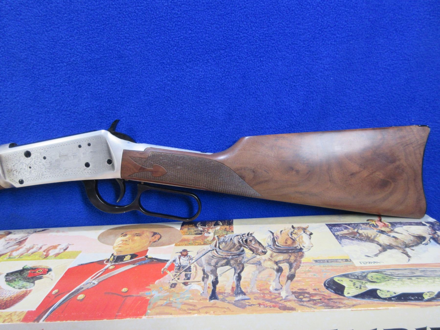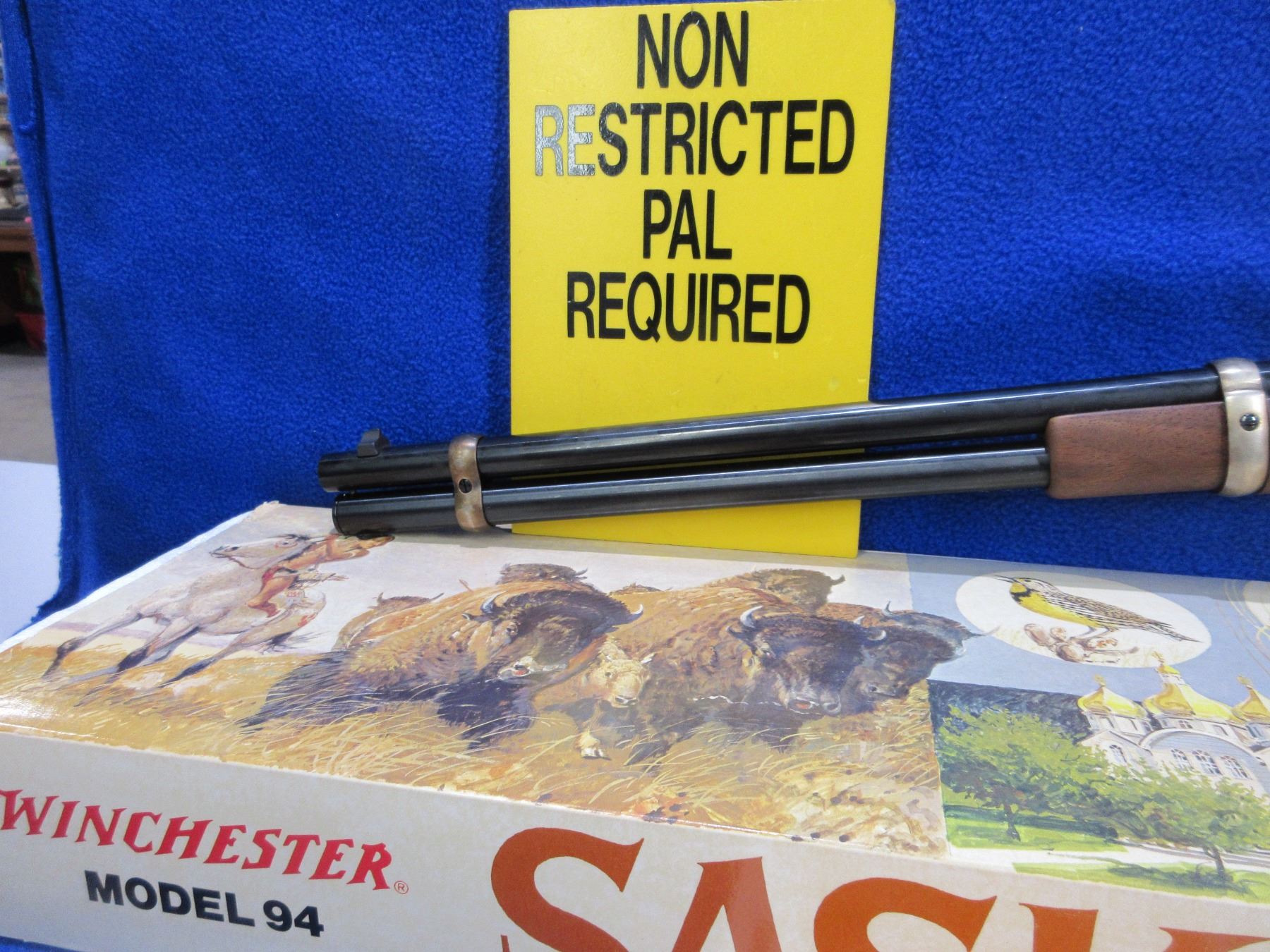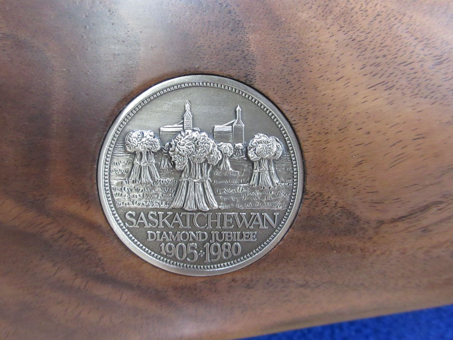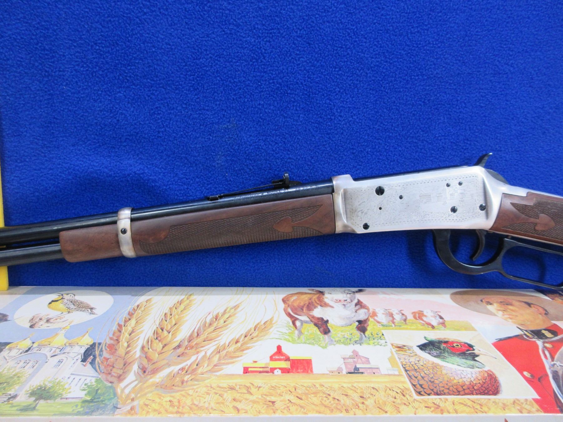 NEW - Non-Restricted - Winchester Model 94 Saskatchewan Diamond Jubilee Commemorative in 38-55 Win. - This NEW lever action rifle with tube magazine is part of a 3 rifle set with matching serial numbers (Lots 1201, 1202, 1203). Round barrel with silver lettering "Saskatchewan Diamond Jubilee" is 20", length of pull is 13 1/4", comes with original box, paperwork and silver protection cloth. Produced to mark the 1905-1980 Diamond Jubilee of the Canadian province of Saskatchewan. Silver-plated receiver and barrel bands, with the remaining parts deeply blued. The right side of the receiver shows the dates "1905-1980" and a coat of arms, while the left depicts a field of gathered wheat stalks with mills in the background. American walnut with spade-design checkering (Winchester Style F) and an inlaid Saskatchewan Coat of Arms medallion.Ser # SDJ2779