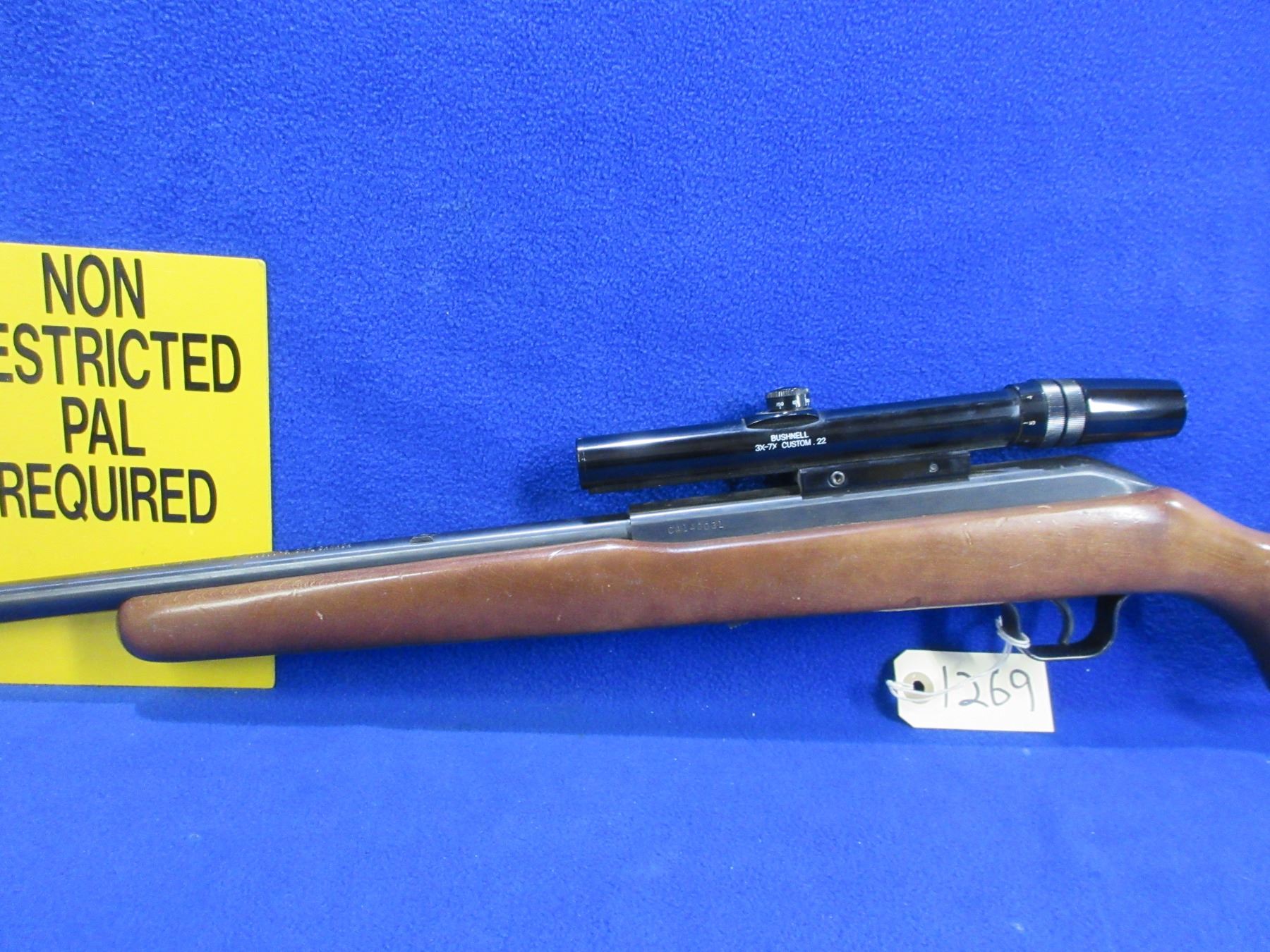 Non-Restricted - Cooey by Winchester Model 64B in 22 LR - This is a semi-auto rifle with removable magazine (magazine missing), action appears to be in good to very good working order. Barrel is 20 1/4", rifling is good to very good, bluing is good, has front sight, missing rear sight but has Bushnell 3x-7x Custom .22 scope - appears clear - duplex reticle - eye piece is loose, stock is good to very goodwith usage marks, length of pull is 13 1/2", butt plate good. Ser # CA140031