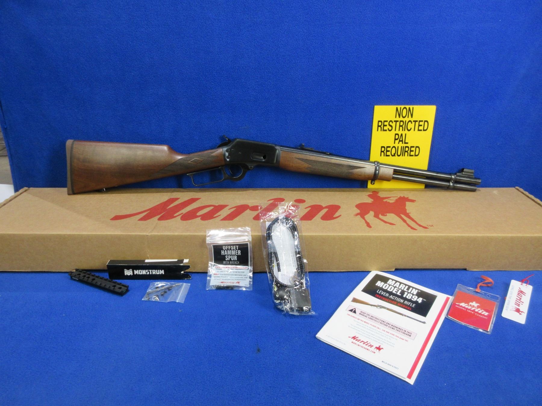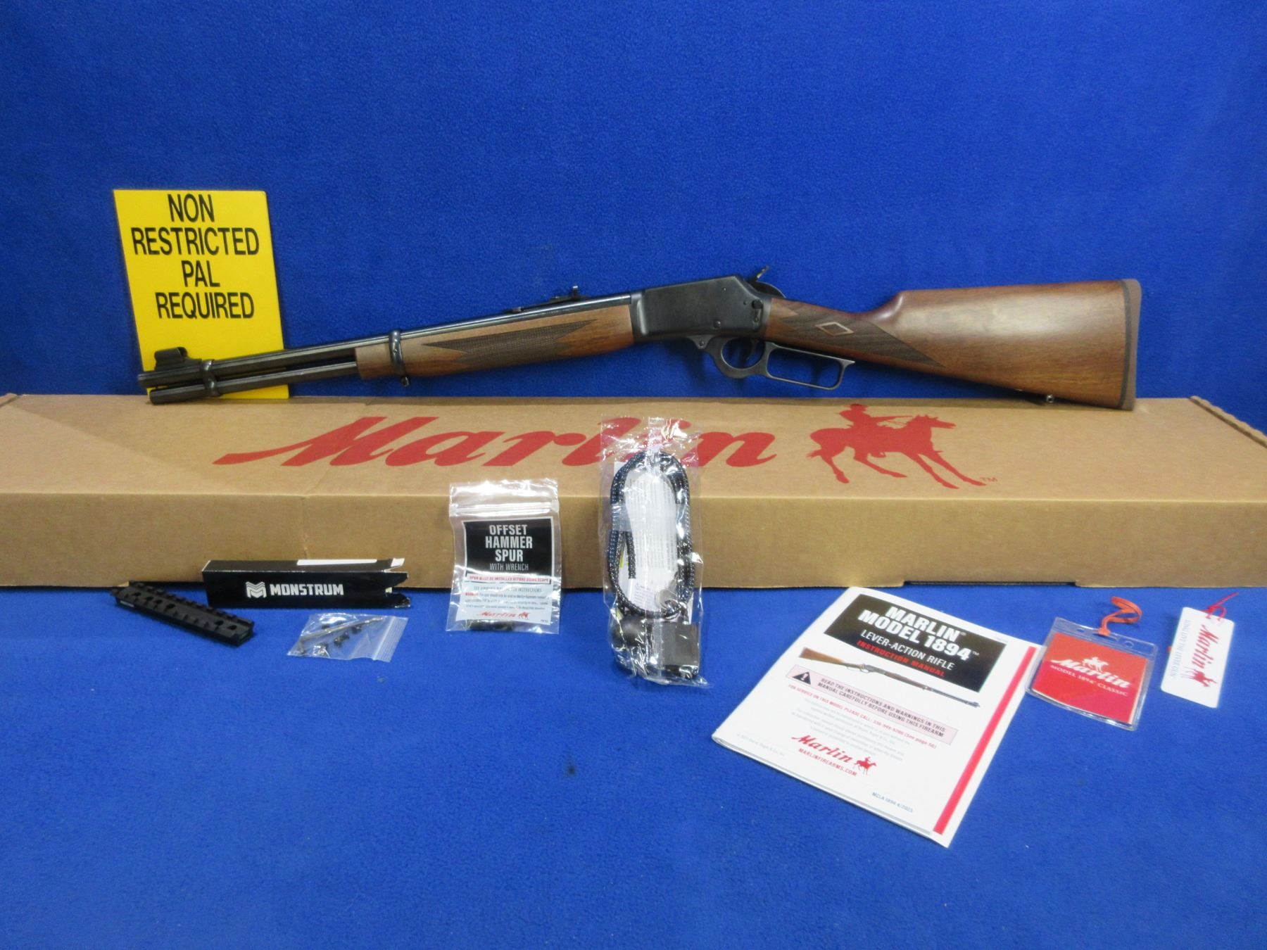 adjustable semi-buckhorn rear sight, length of pull is 13 1/2", comes with Monstrum Picatinny bubble level rail, cable lock, Marlin offset hammer spur, original box and paperwork. Ser # RM1021050