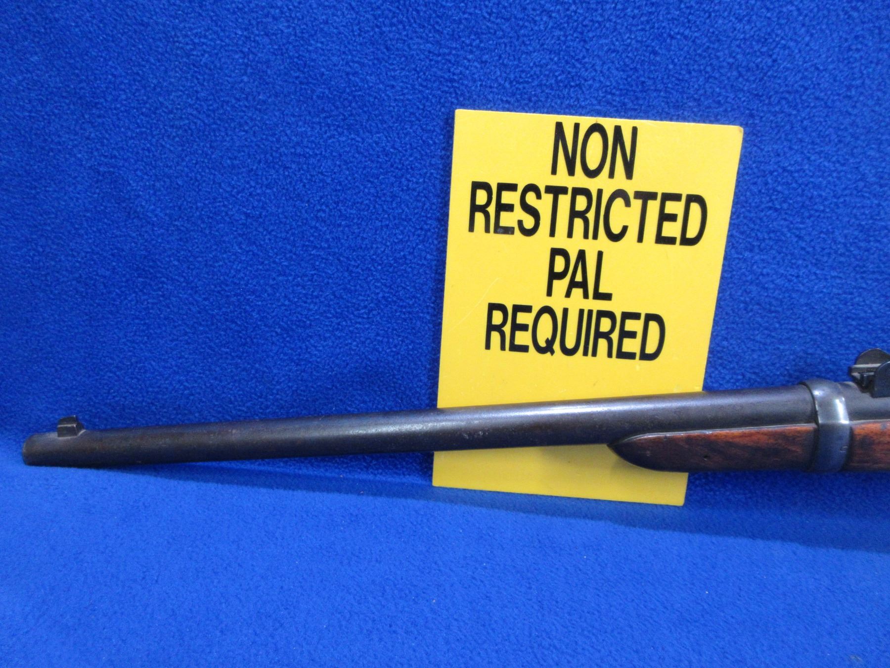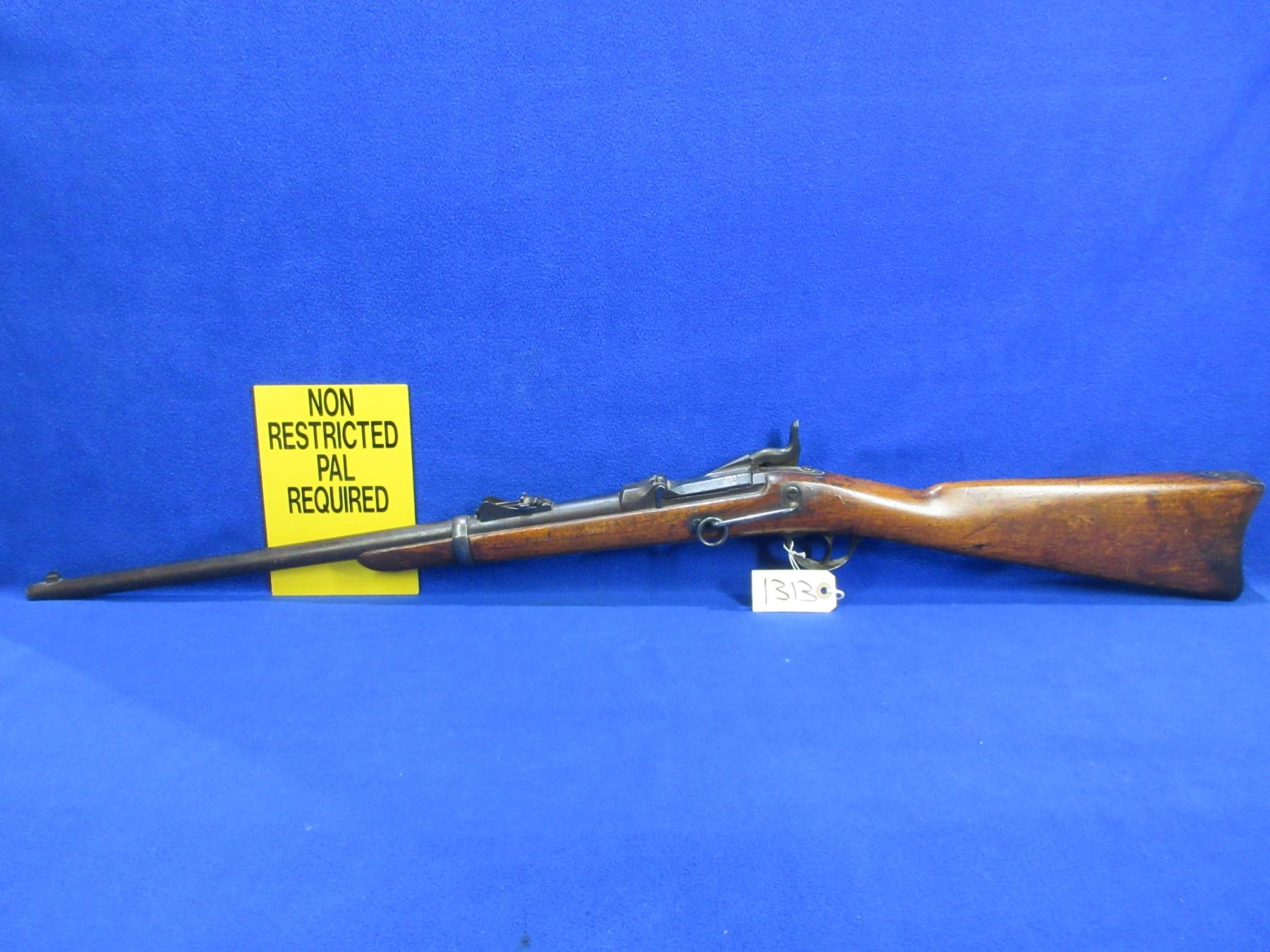 Non-Restricted - US Springfield 1873 Trapdoor Saddle Ring Carbine in 45-70 Gov't - This is a breech-loading single-shot rifle, action is in non working order as the firing pin is missing. Action locks in place nicely but has a small amount of play. Barrel is 22", rifling is good, bluing is turning brown with light pitting, has both sights, stock is good with many usage marks, length of pull is 13 1/2", metal butt plate good. Ser # 340393