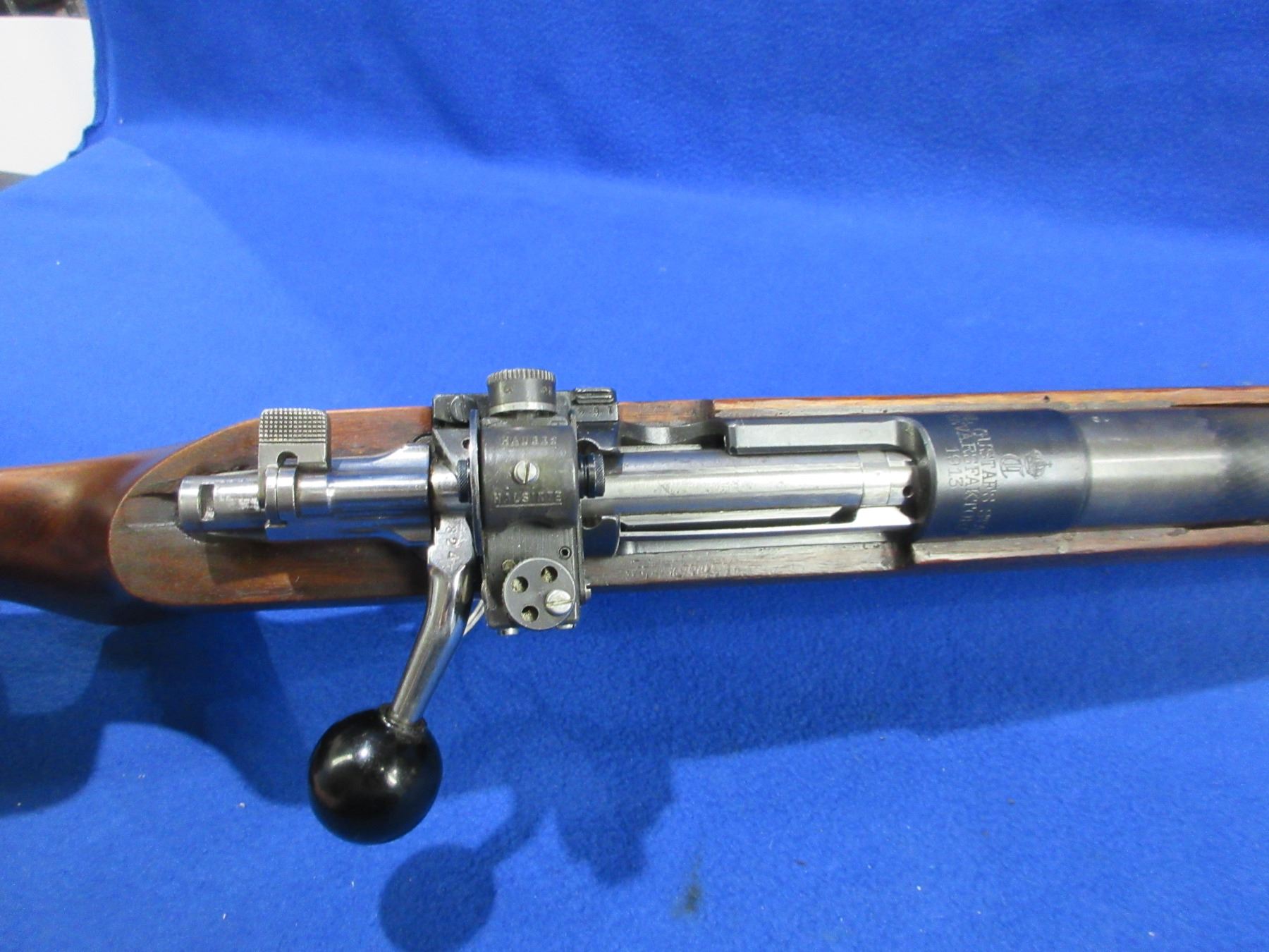 Non-Restricted - Carl Gustaf Model CG80 Target in 6.5x55 - This is a bolt action rifle with floorplate magazine, action appears to be in very good working order. Heavy hammer forged barrel is 25 3/4", rifling is good to very good, bluing is good with some wear on top of the barrel, has front globe and rear Hauges Halsikte Diopter sights, stock is good to very good with minor usage marks, length of pull is 14", butt plate good, wooden floorplate cover has a small chip and a hairline crack. Ser # 324824