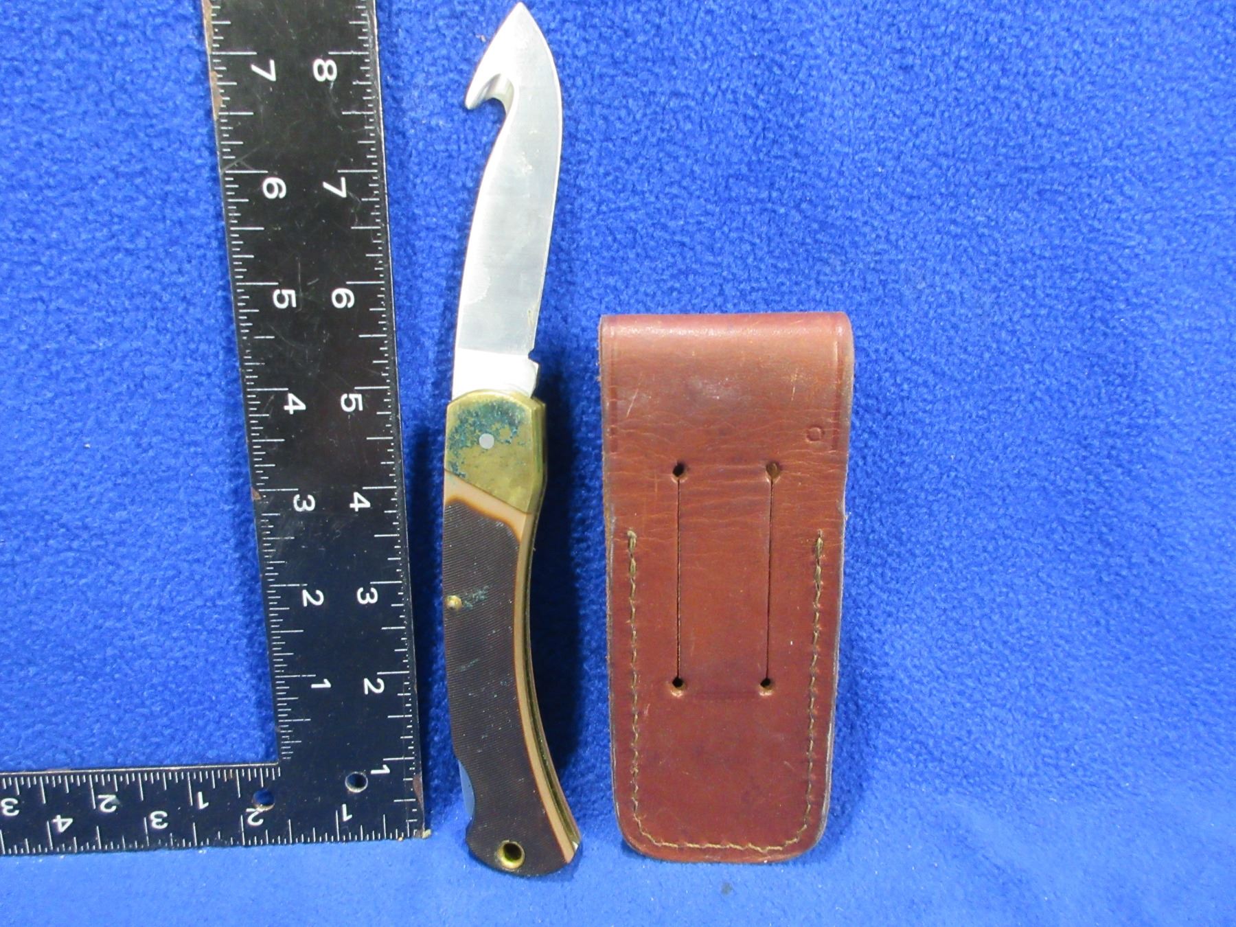 Schrade+ USA 9-OT Old Timer Folding Lock Blade Gut Hook Knife w/ Leather Sheath - 3 1/2" Blade, 8 1/2" Total Length