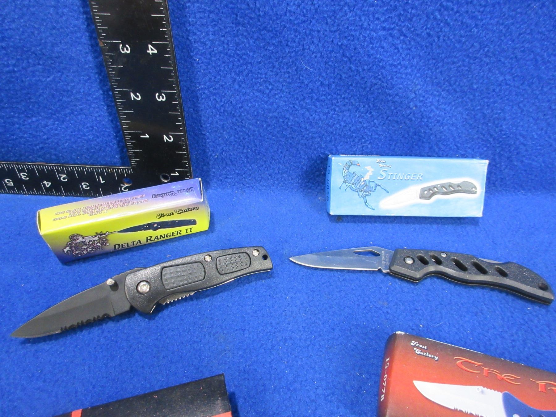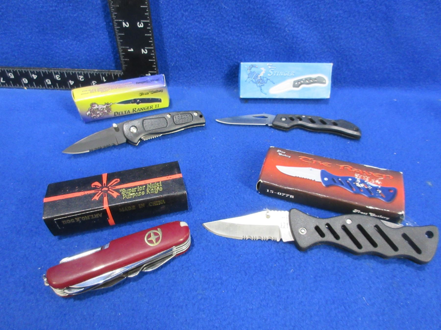 3 Folding Lock Blade Knives and a Swiss Army Style Knife