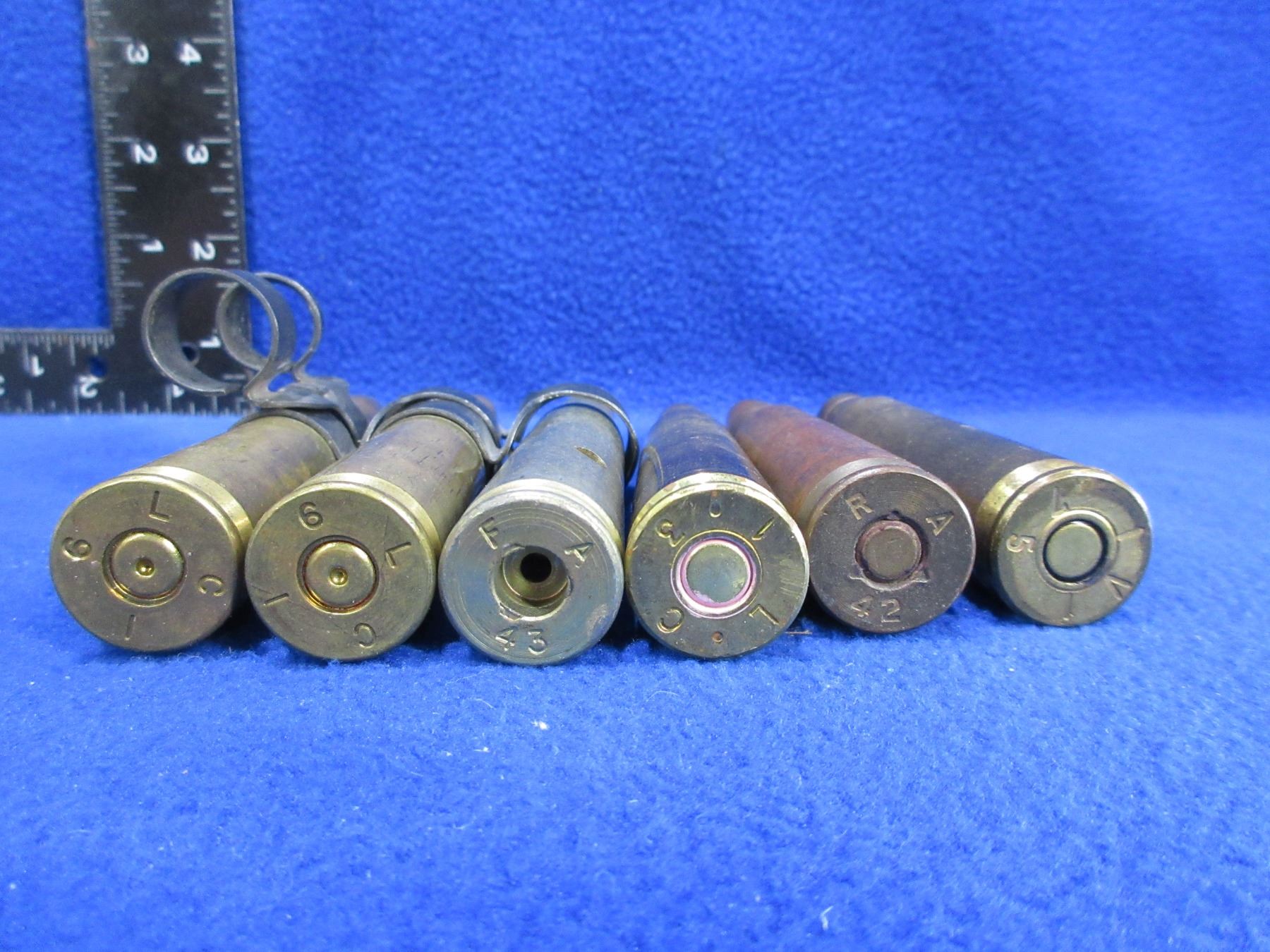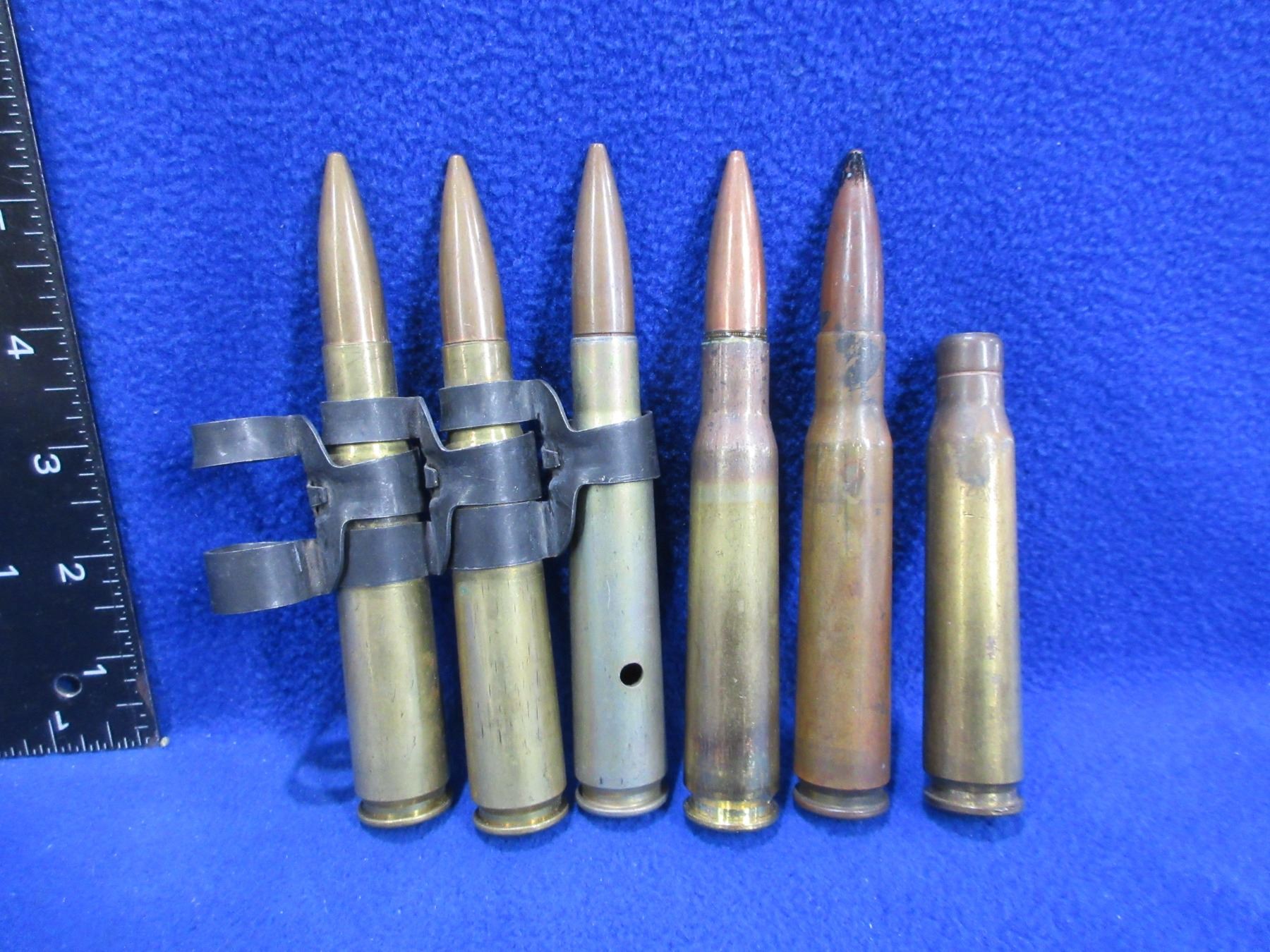 50 BMG Brass & Cartridges - Bag of 6 (Pick Up or Ship by UPS Only) - comes with 3 links, 3 appear loaded, 1 has holes drilled in it, 2 appear fired but have bullets seated