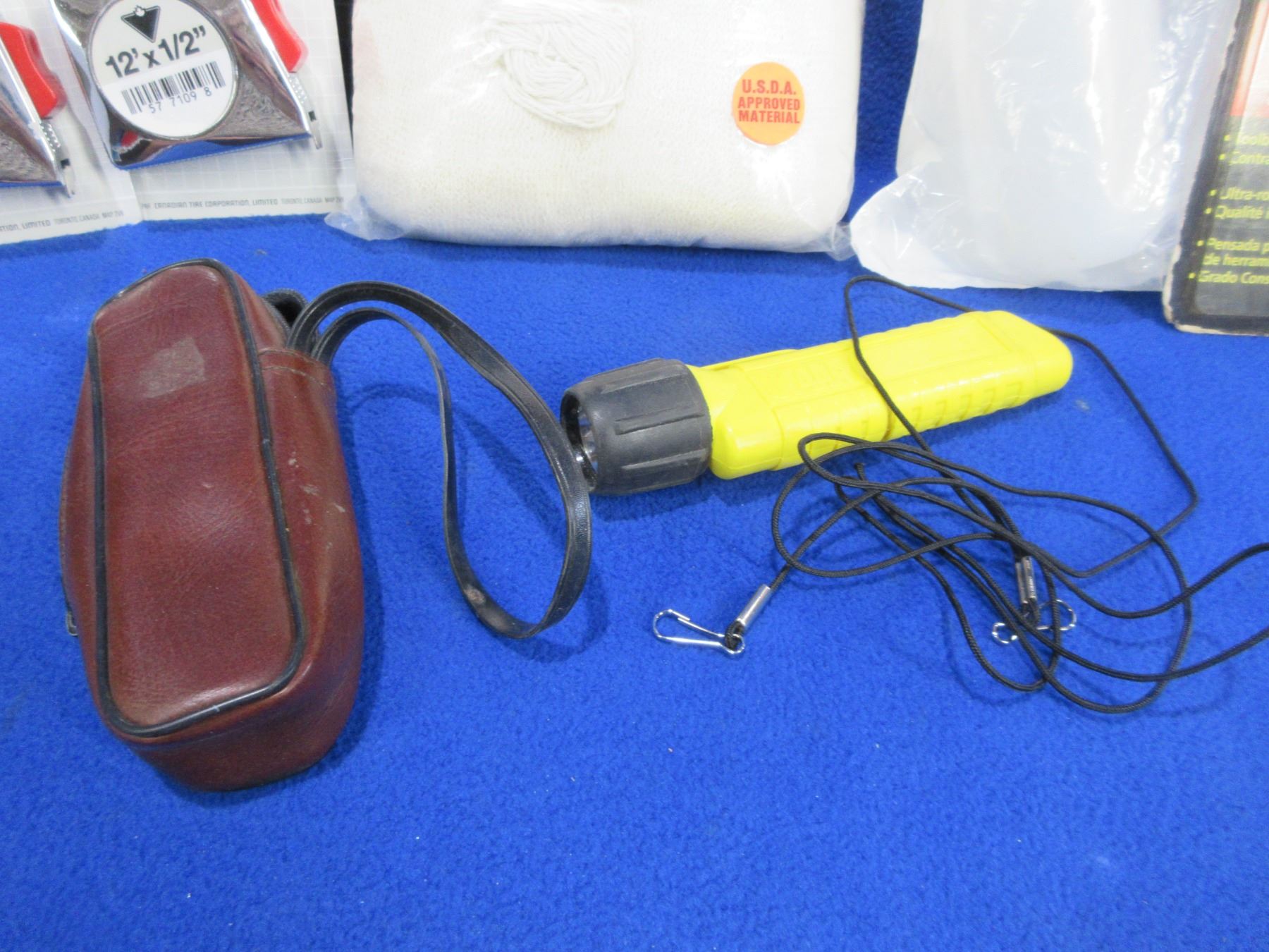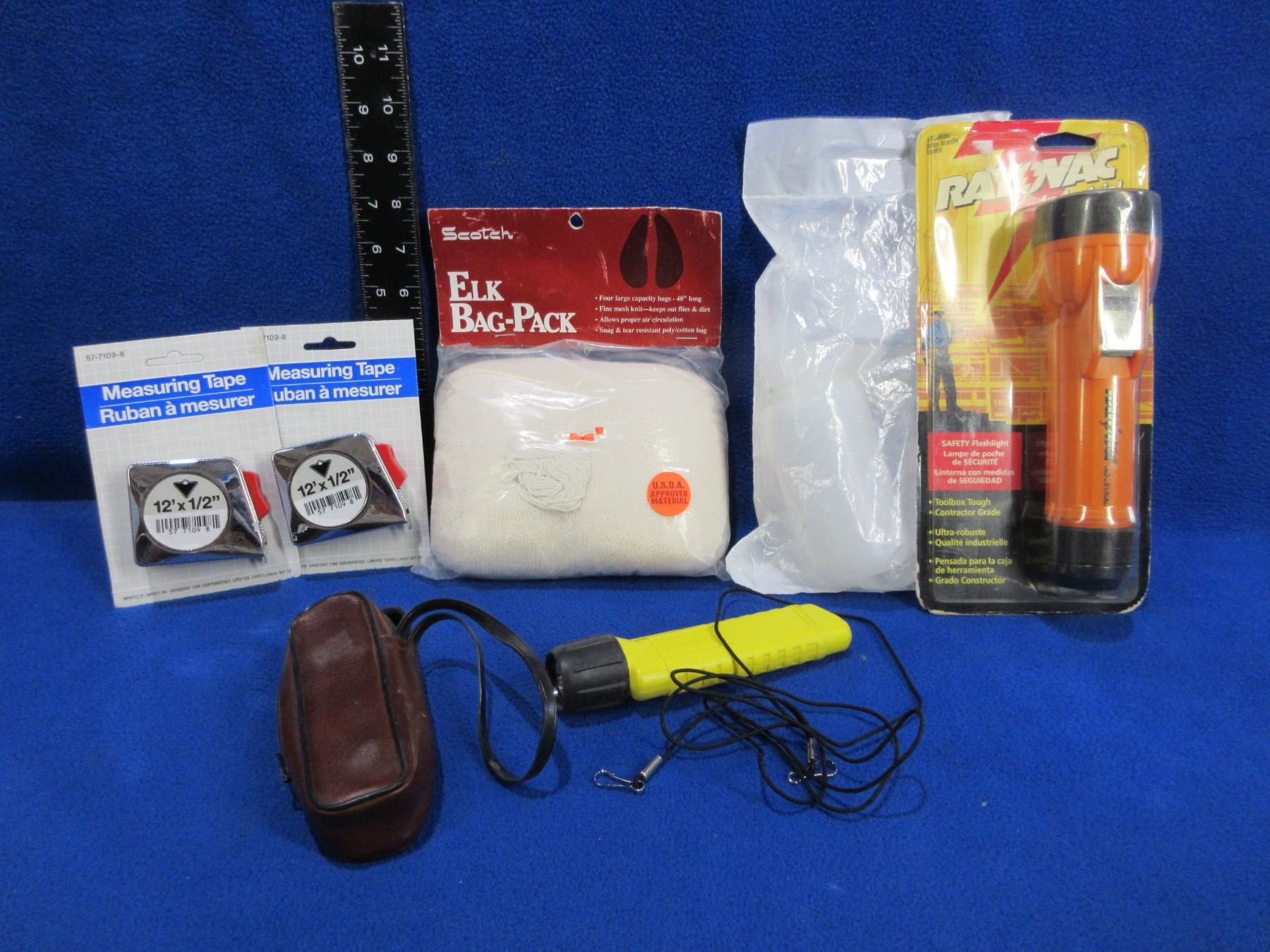 Lot 1623 Lot of Misc. - 2 Flashlights, 2 Measuring Tapes, Elk Bag, Powder Bottle, Etc.