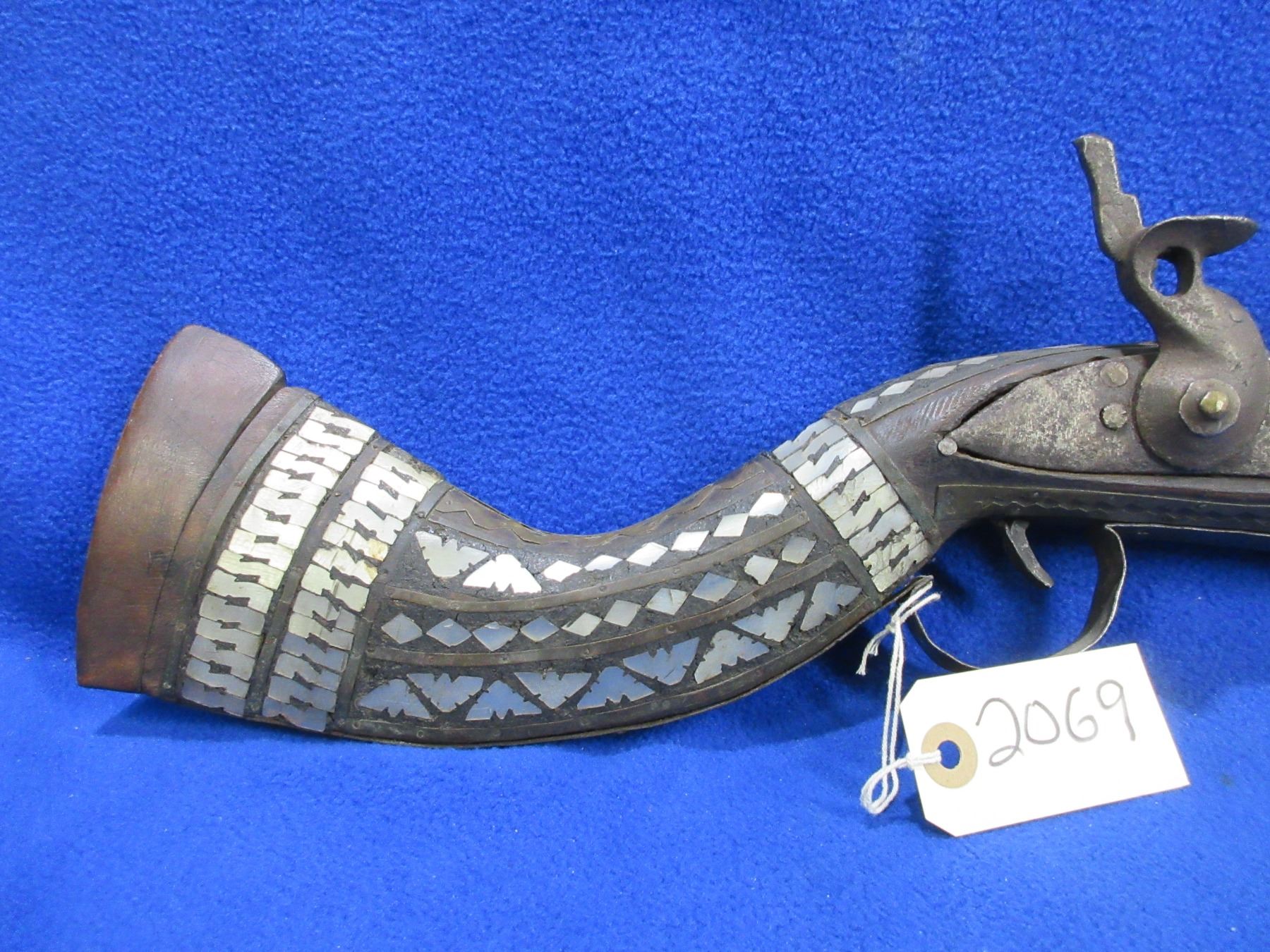 Antique - No PAL Required - Very Old Flintlock Replica Blunderbuss - This is a very old replica of a flintlock Blunderbuss, action is in non working order. Engraved flared barrel is approx. 14" and in fair condition, total length of pistol is 27". Wood stock is inlaid with brass and what looks like mother of pearl and is in fair condition for age with some damage and missing inlay. Ser # None
