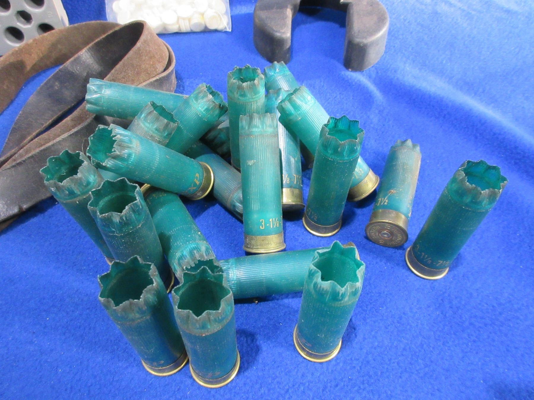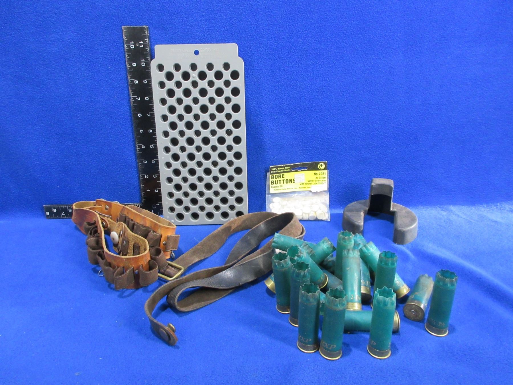 Lot 2265 Lot of Misc. - Ammo Belt, Reloading Block, Bore Buttons, 12 Ga. Hulls, Etc.