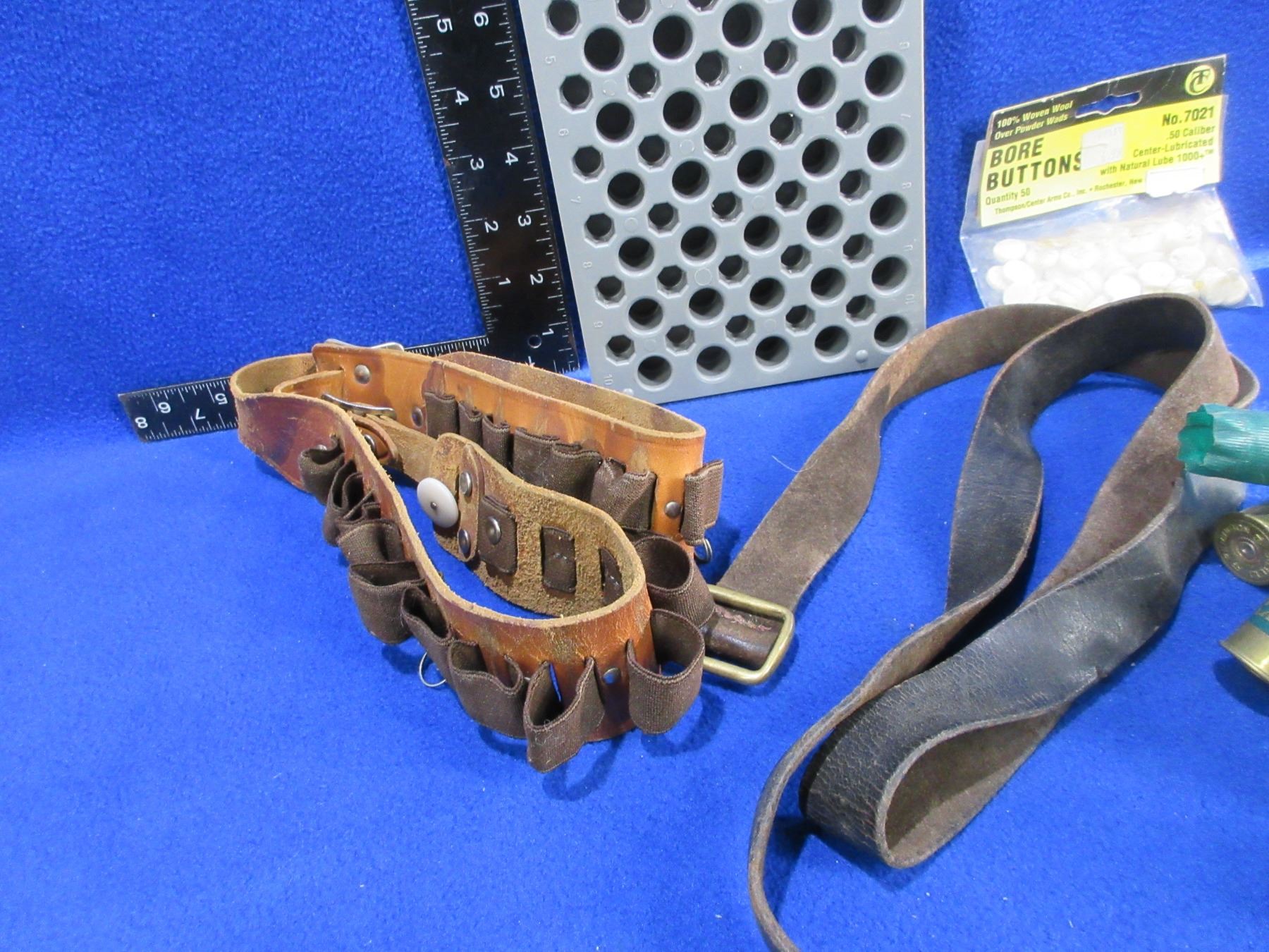 Lot of Misc. - Ammo Belt, Reloading Block, 50 Cal. Bore Buttons, 12 Ga. Hulls x 22, Etc.