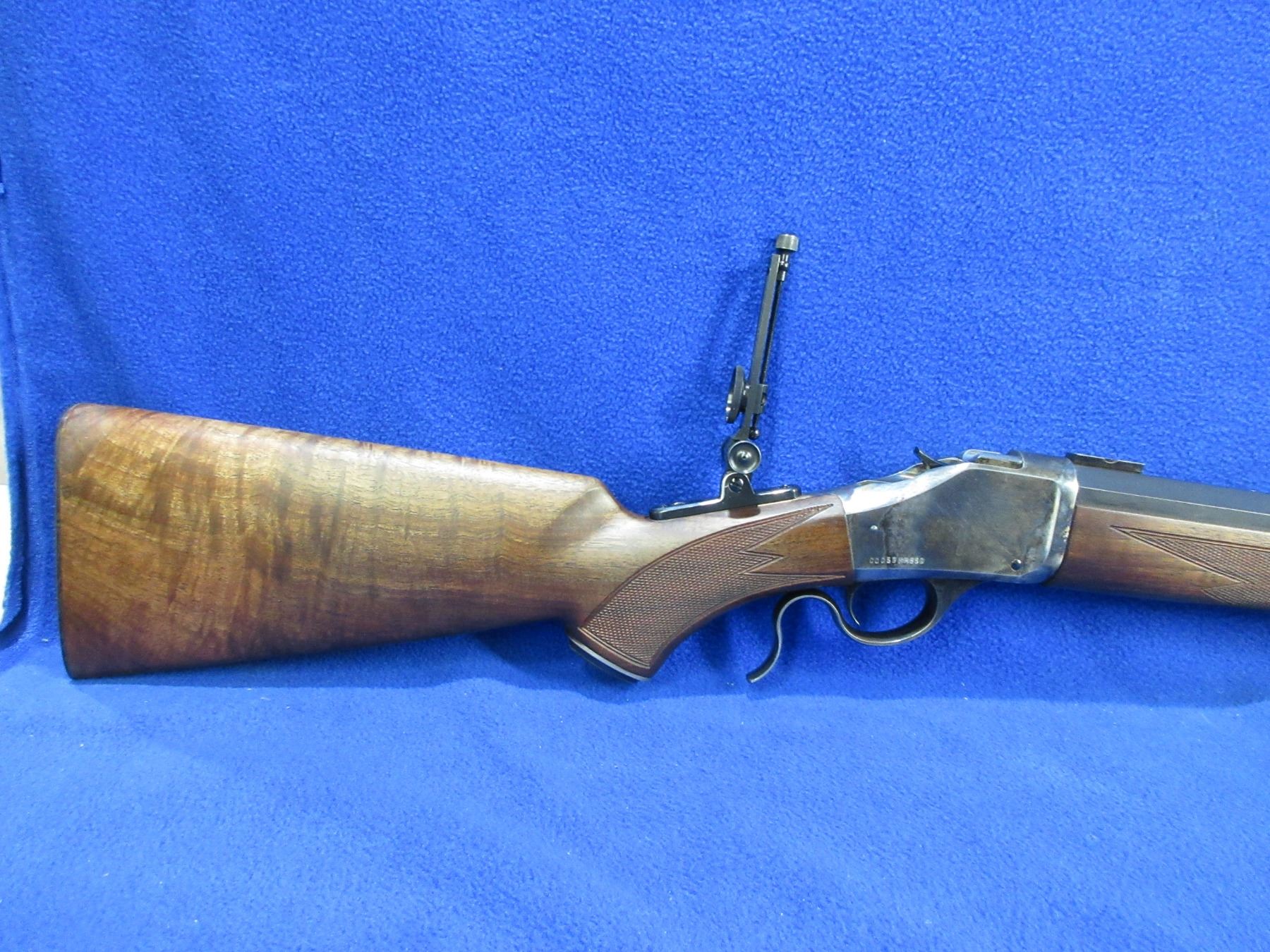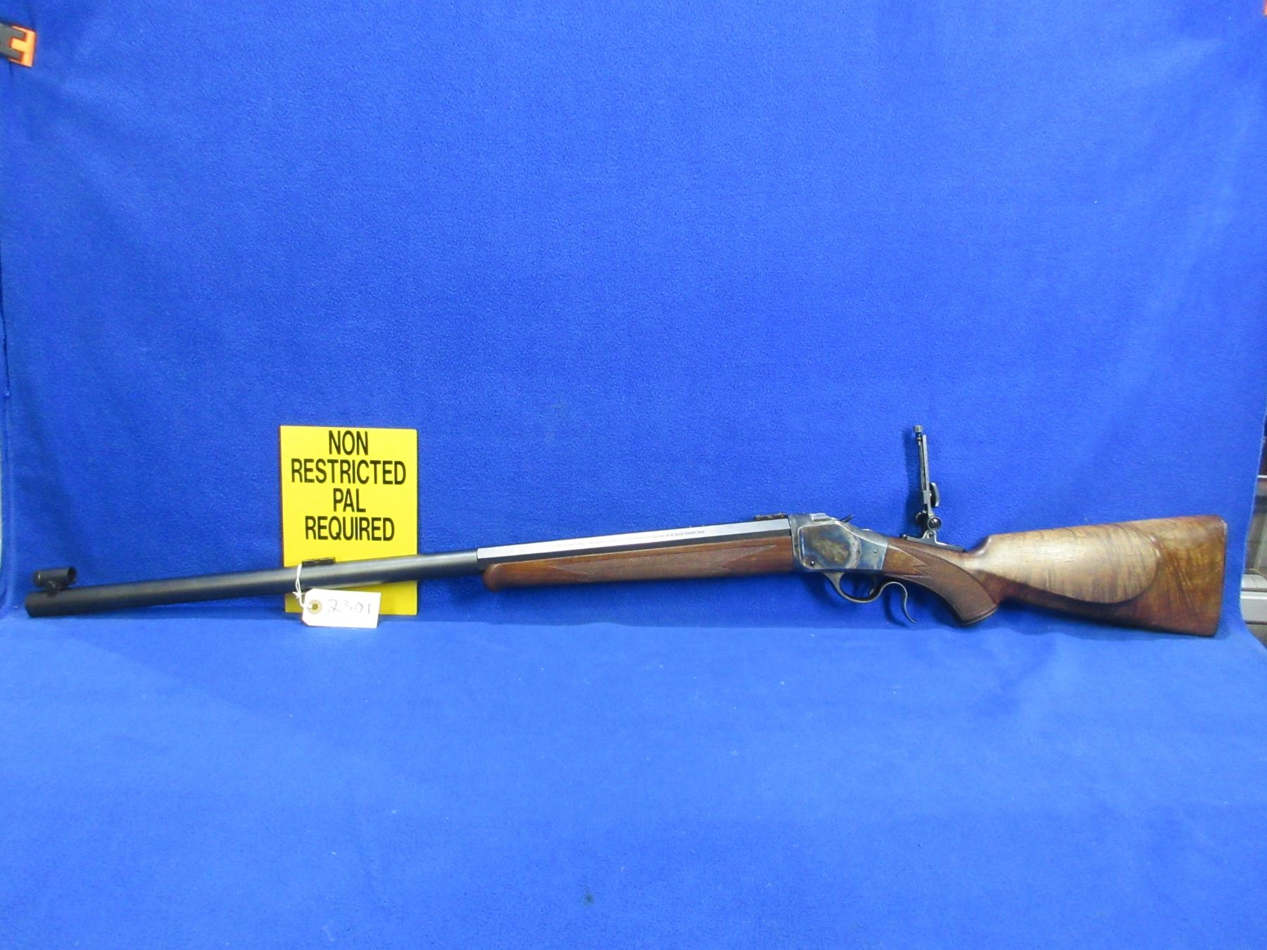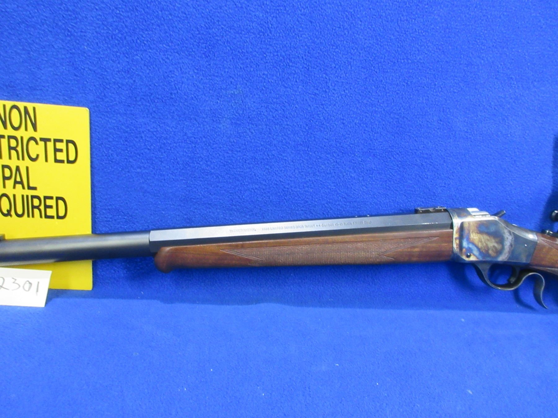 Non-Restricted - Winchester 1885 High-Wall Limited Series BPCR Target in 45-90 Black Powder Only - This beautiful single shot falling block rifle is like new, case hardened action is in very good working order. Octagon to round heavy barrel is 30", rifling is very good, bluing is very good, has both sights and bases for period correct target scope, high grade walnut stock and forearm have beautiful grain and are in very good condition, length of pull is 13 3/4", case hardened metal butt plate very good. Ser # OOO59MR850