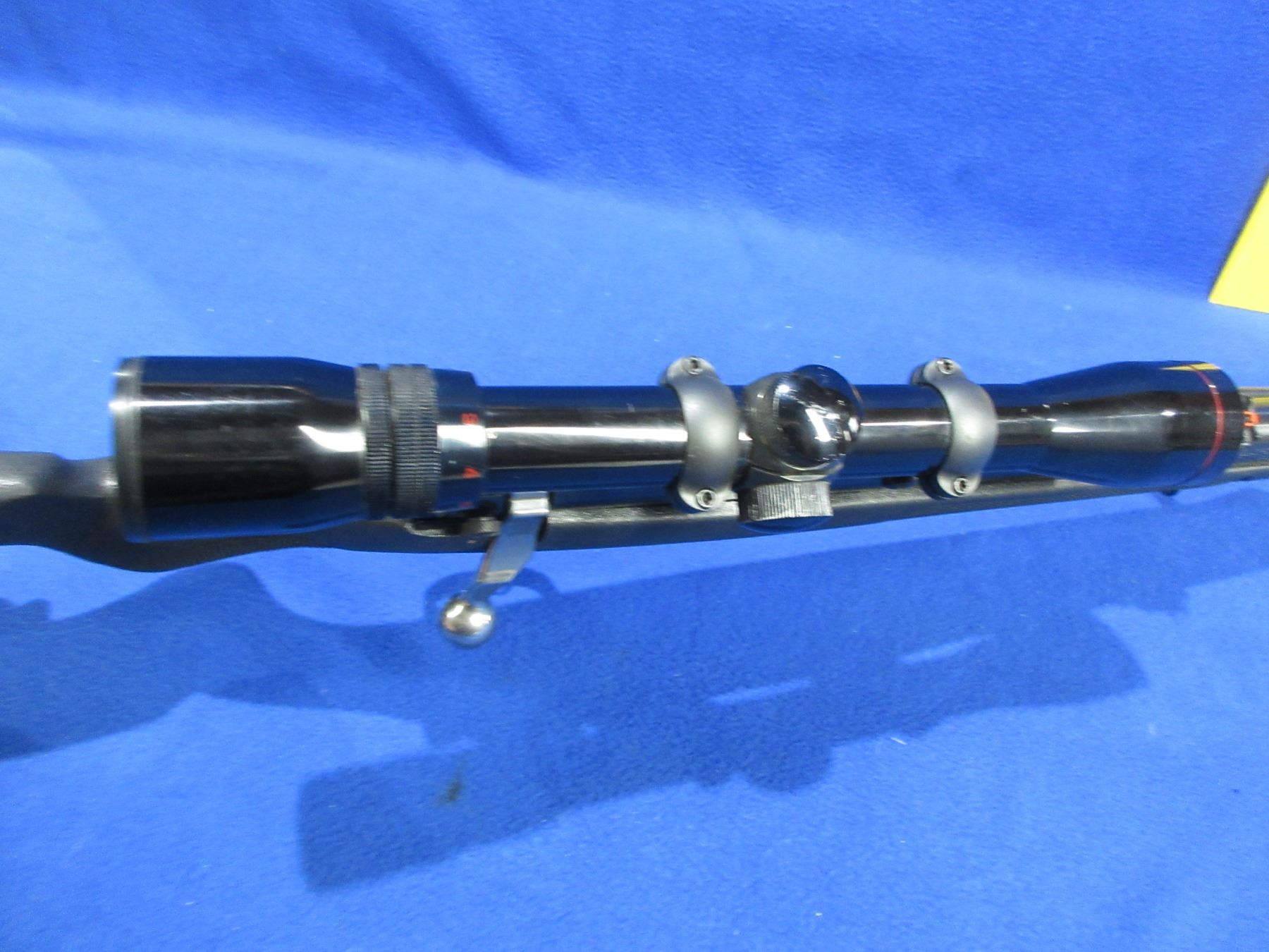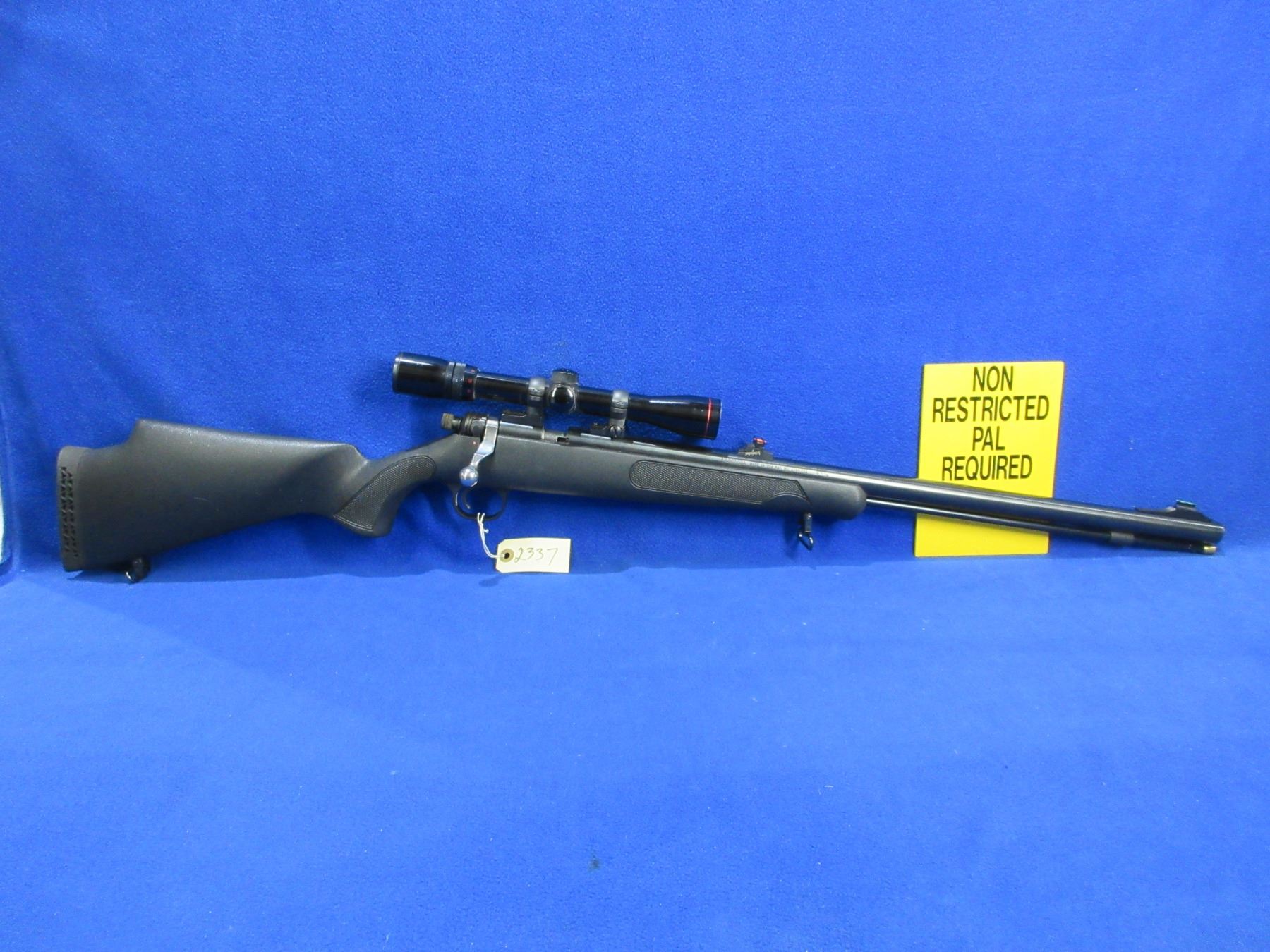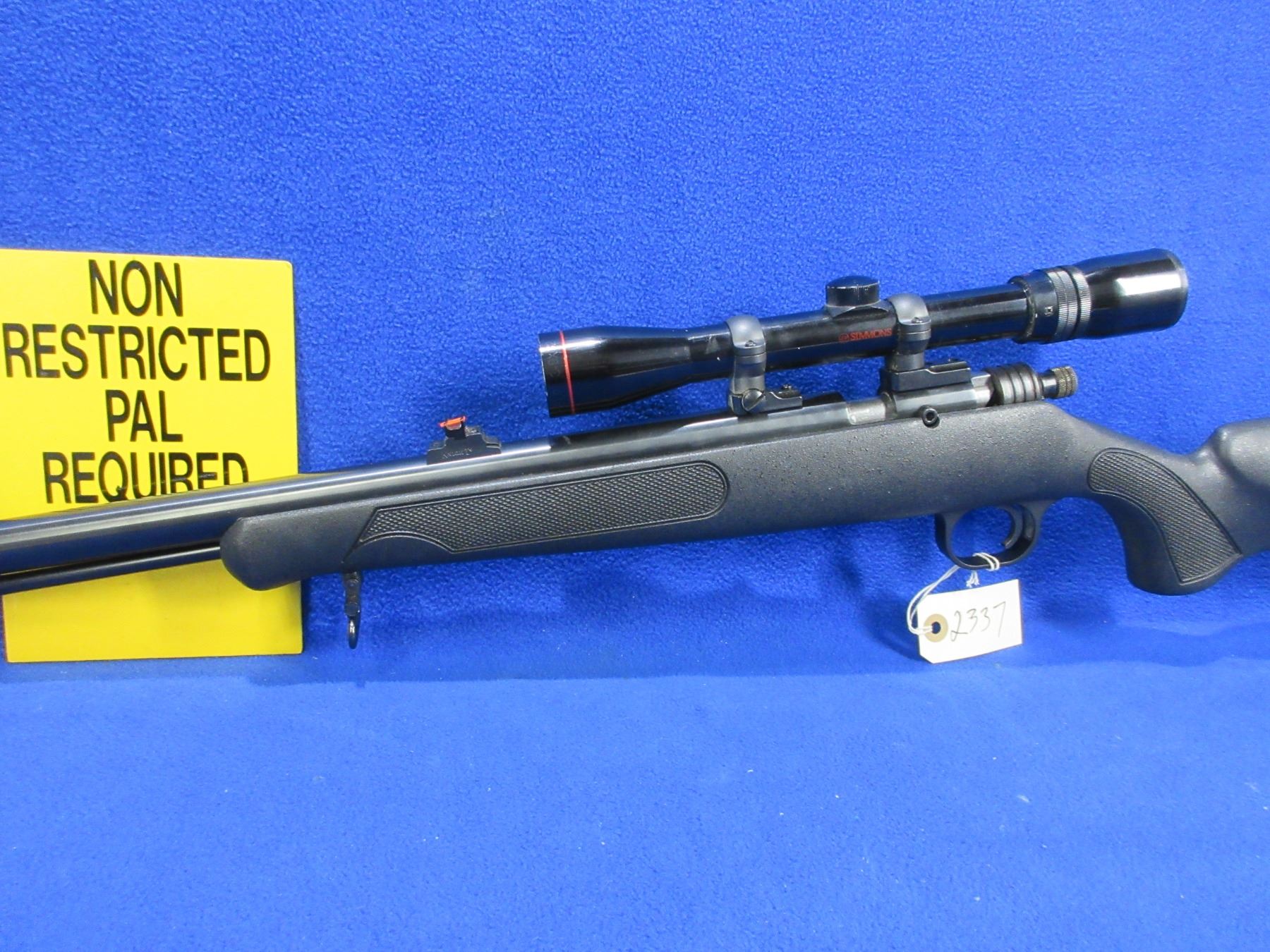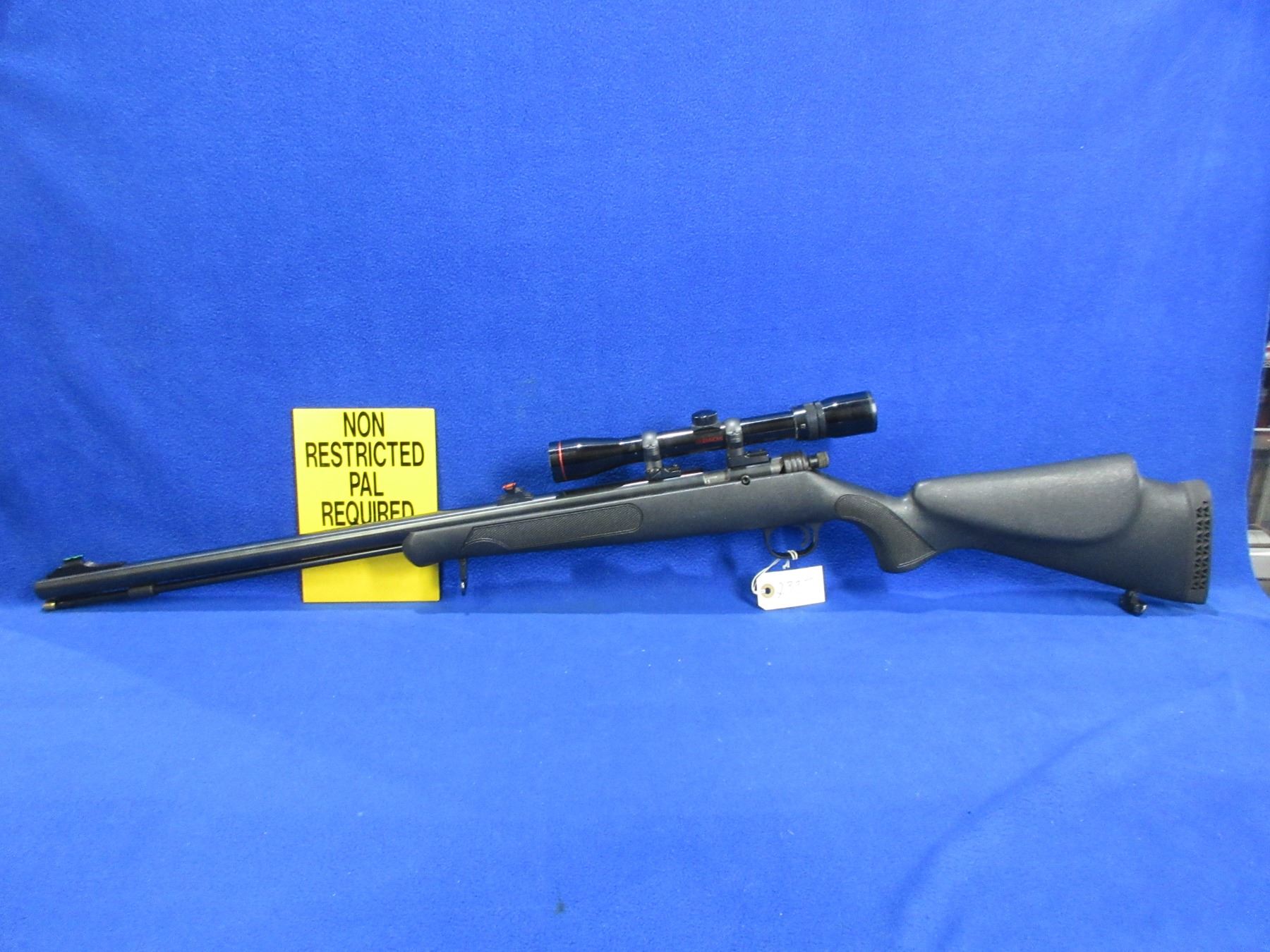 Non-Restricted - Knight Muzzle Loader in 50 Cal. - This is an inline muzzleloading rifle, action appears to be in good working order. Barrel is 24", bore appears good, bluing is good to very good, has both sights and Simmons 3-9 scope - appears clear - duplex reticle, synthetic stock is very good, length of pull is 14 1/4", rubber recoil pad good, comes with QR swivels and ram rod. Ser # O52182