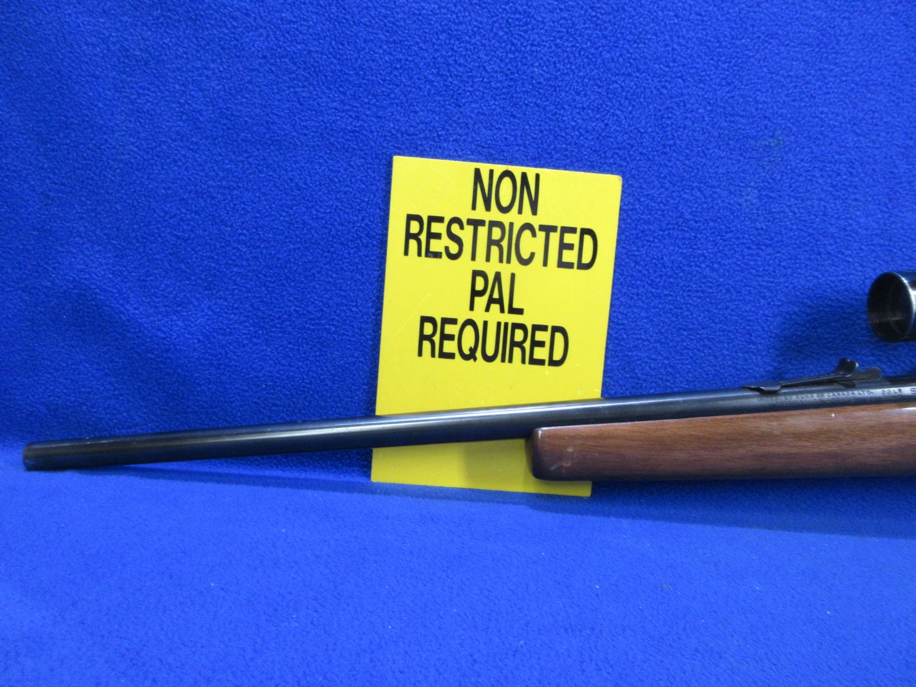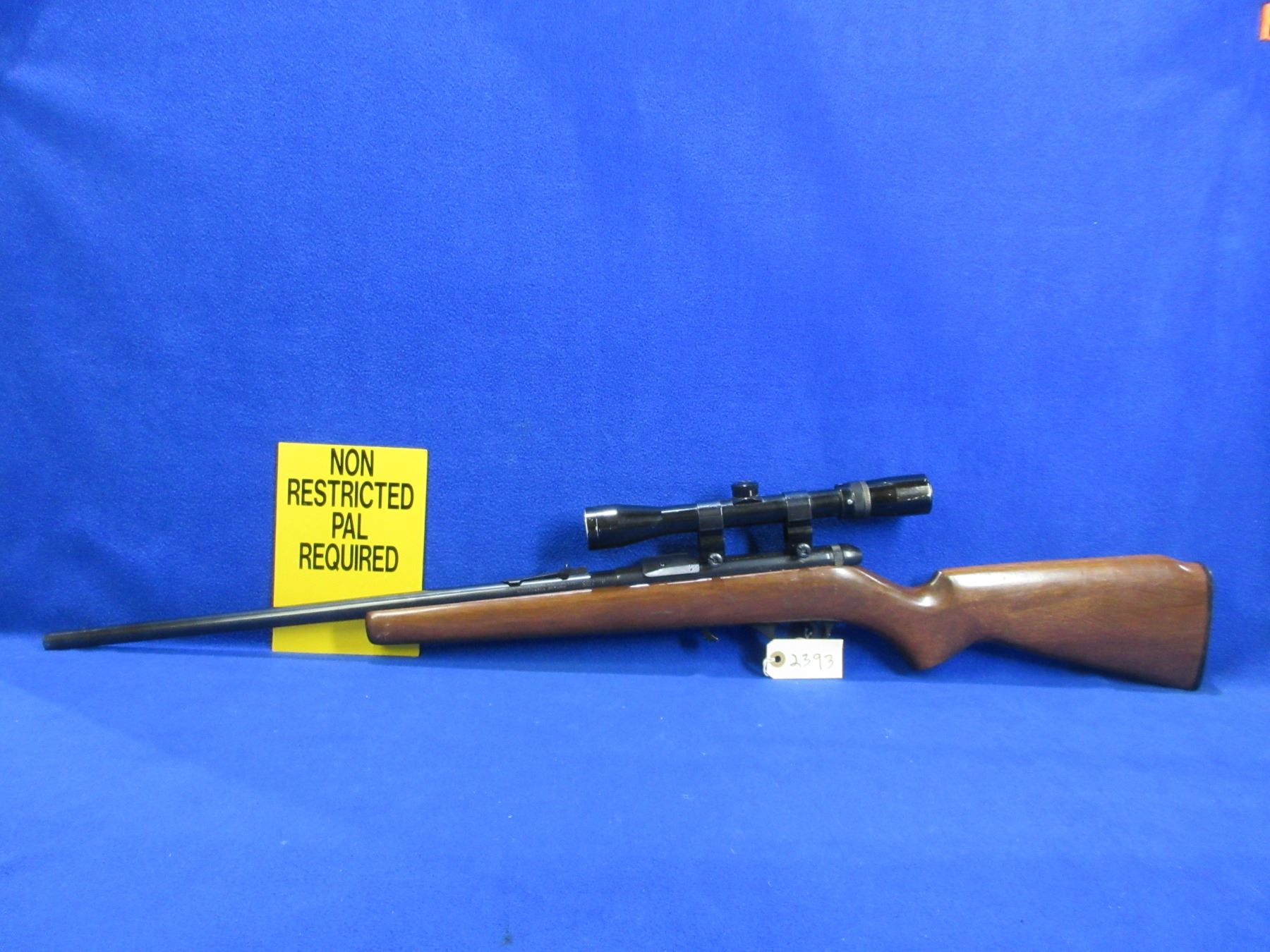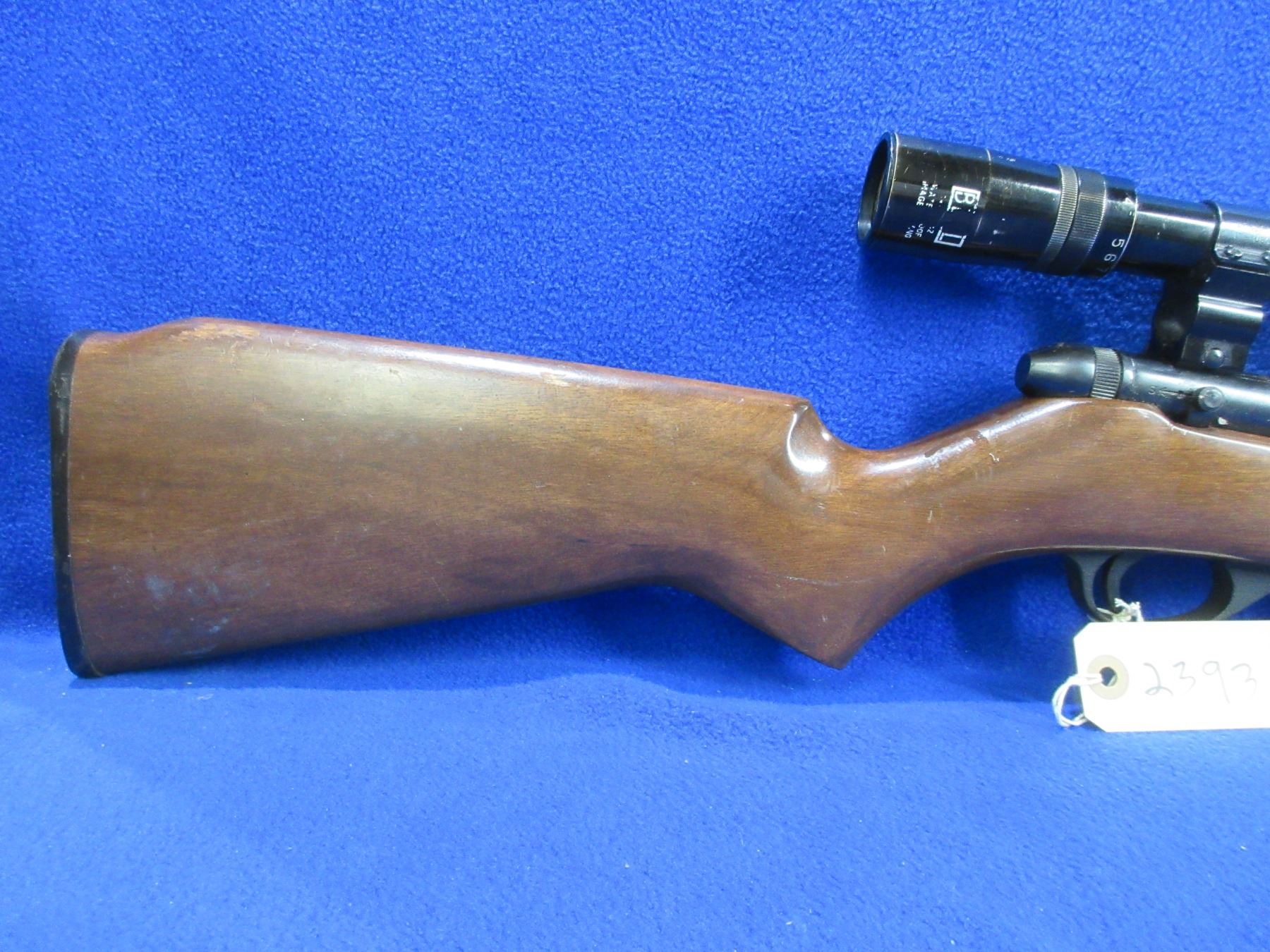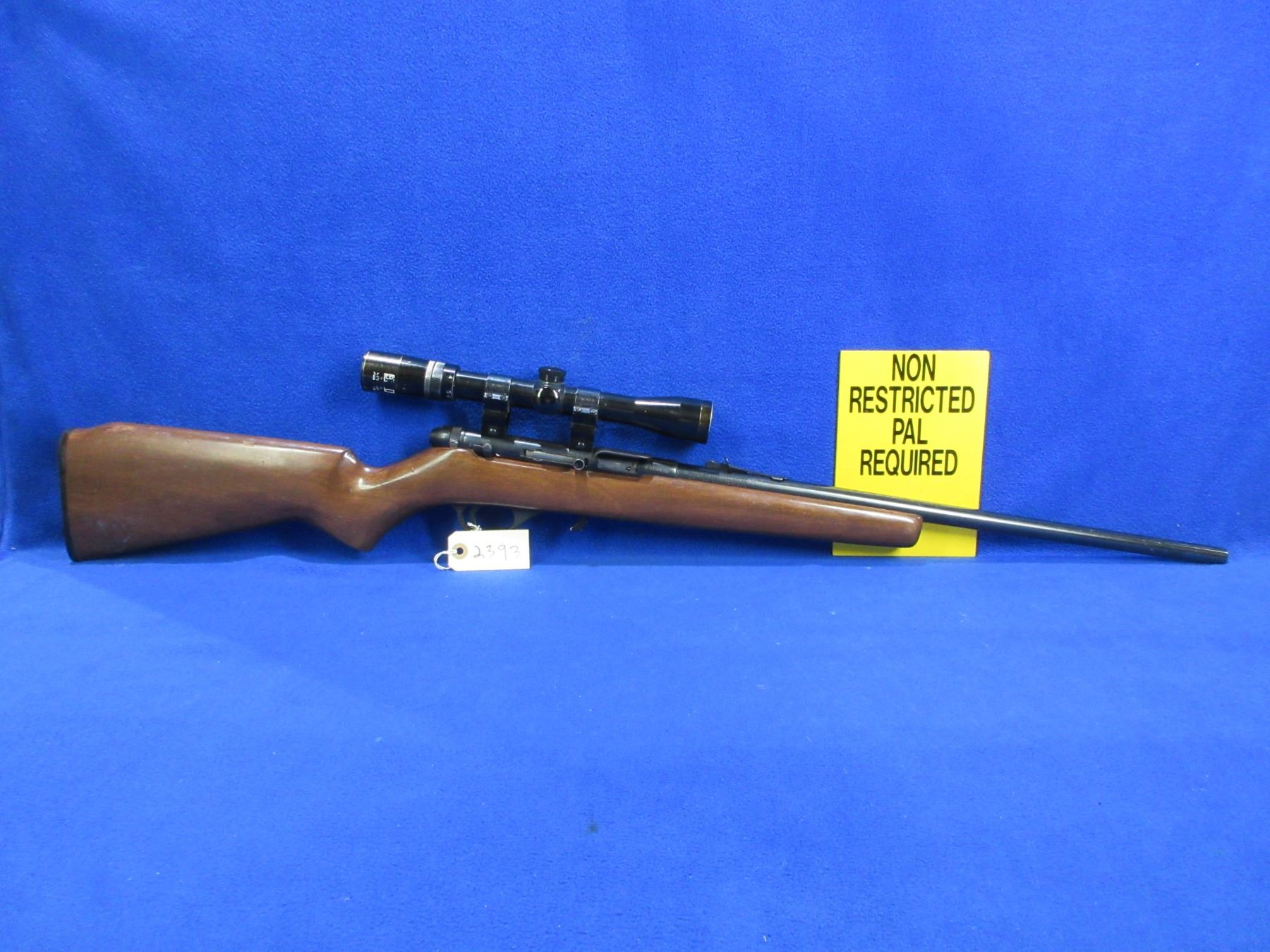 Non-Restricted - Squires Bingham Model 20P in 22 LR - This is a semi-auto rifle with removable magazine (magazine missing), action appears to be in good to very good working order. Barrel is 20 3/4", rifling is good to very good, bluing is good to very good, has rear sight, missing front sight and has Bushnell 3-9 scope - appears clear - duplex reticle, stock is good to very good with usage marks, length of pull is 14 ", butt plate good. Ser # A580156