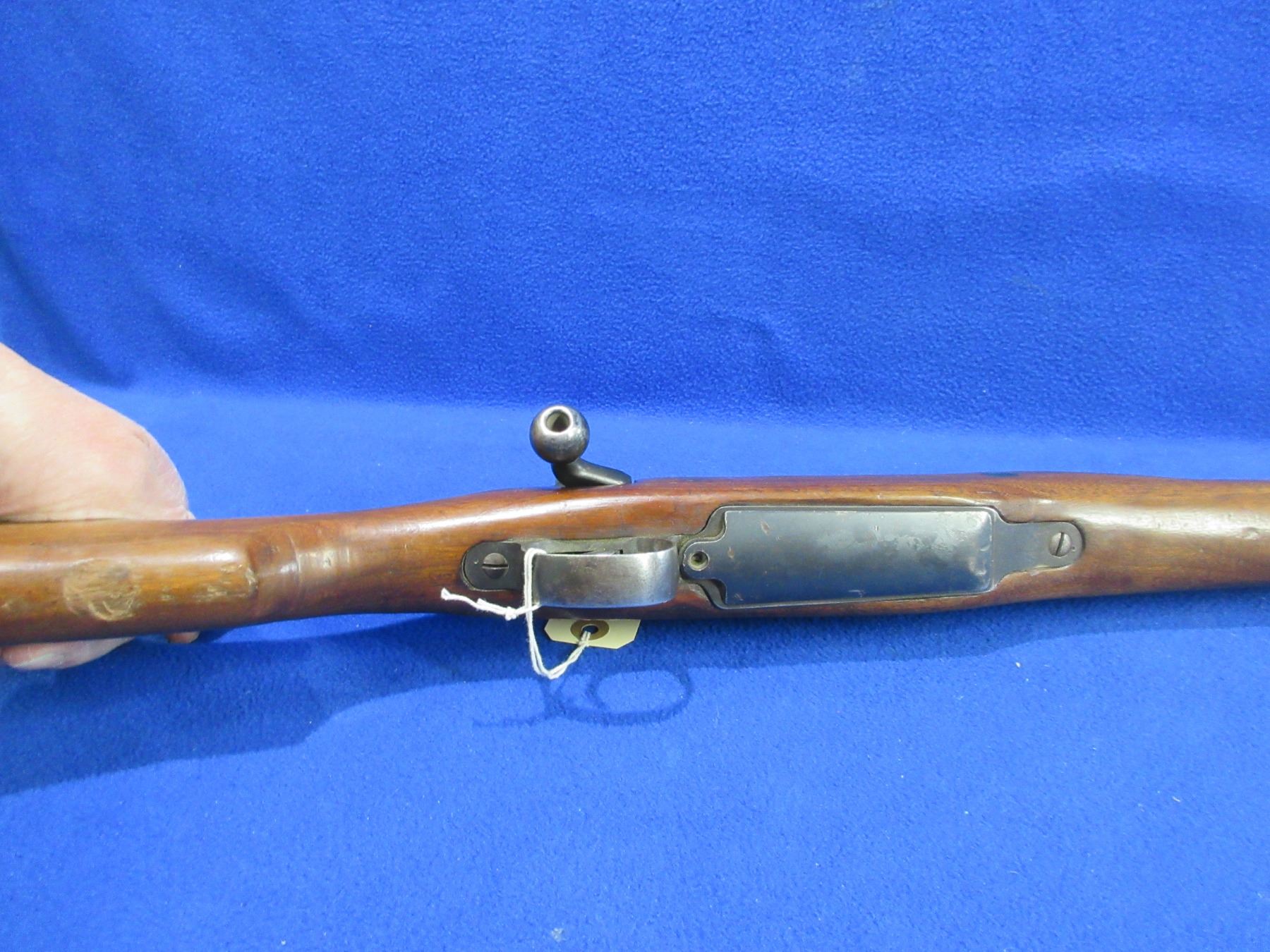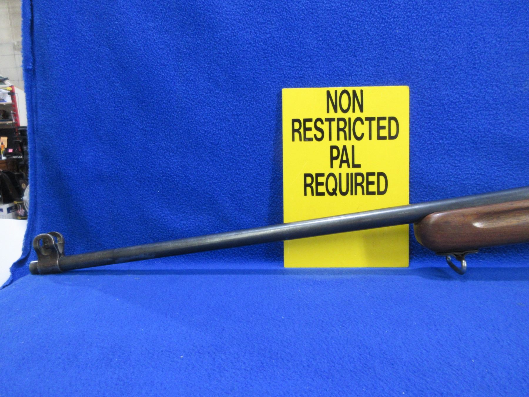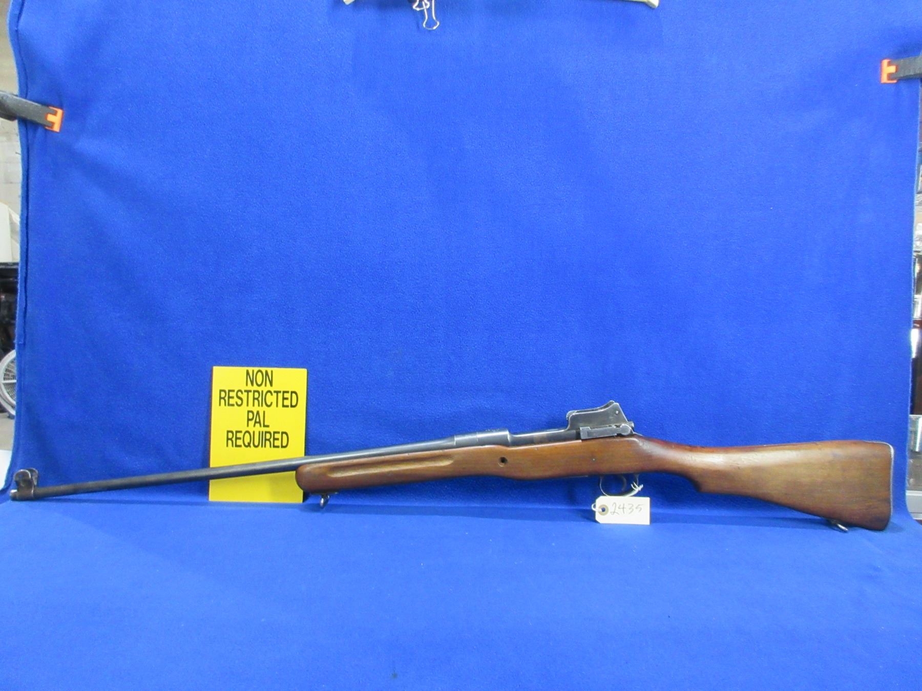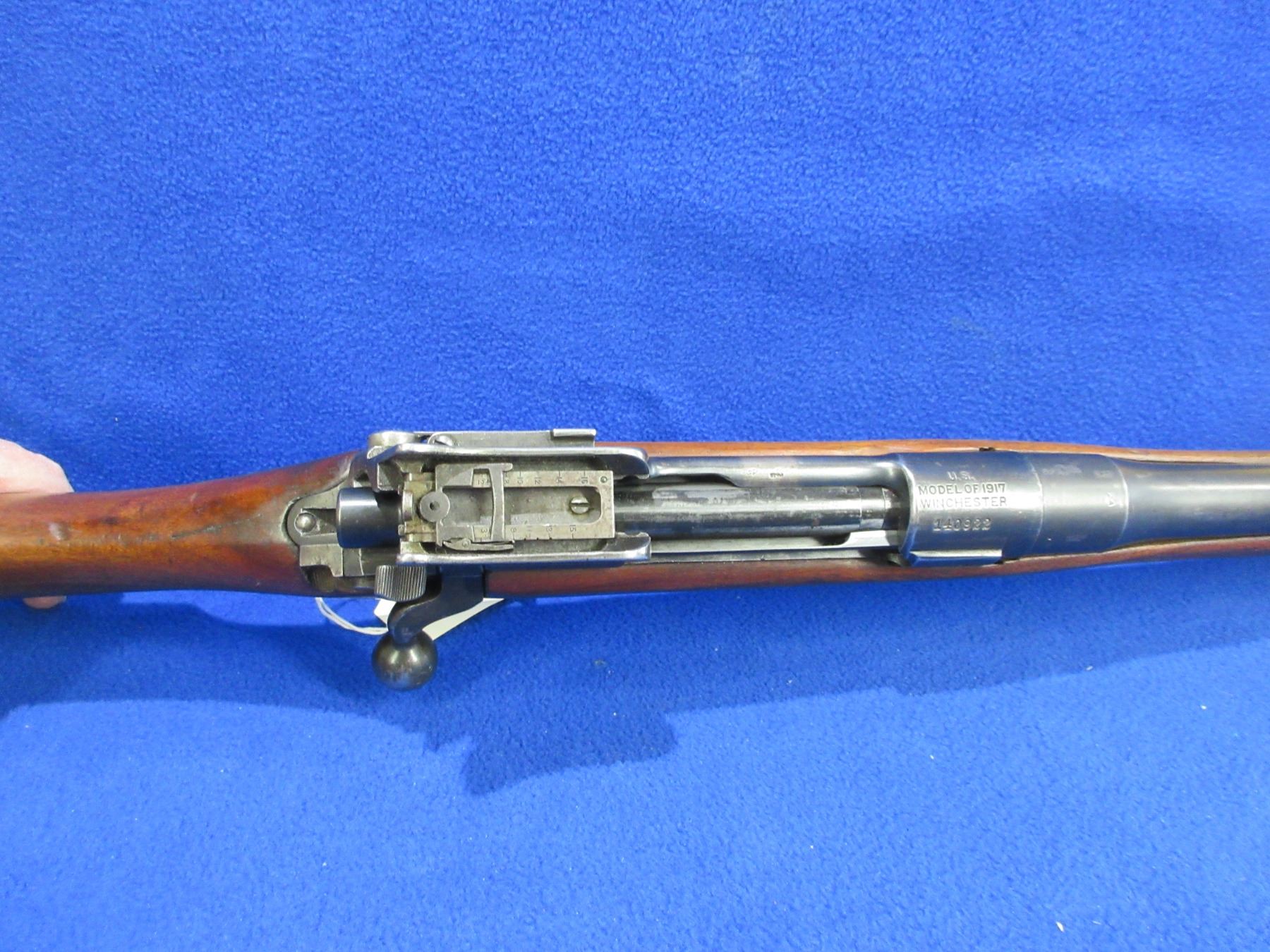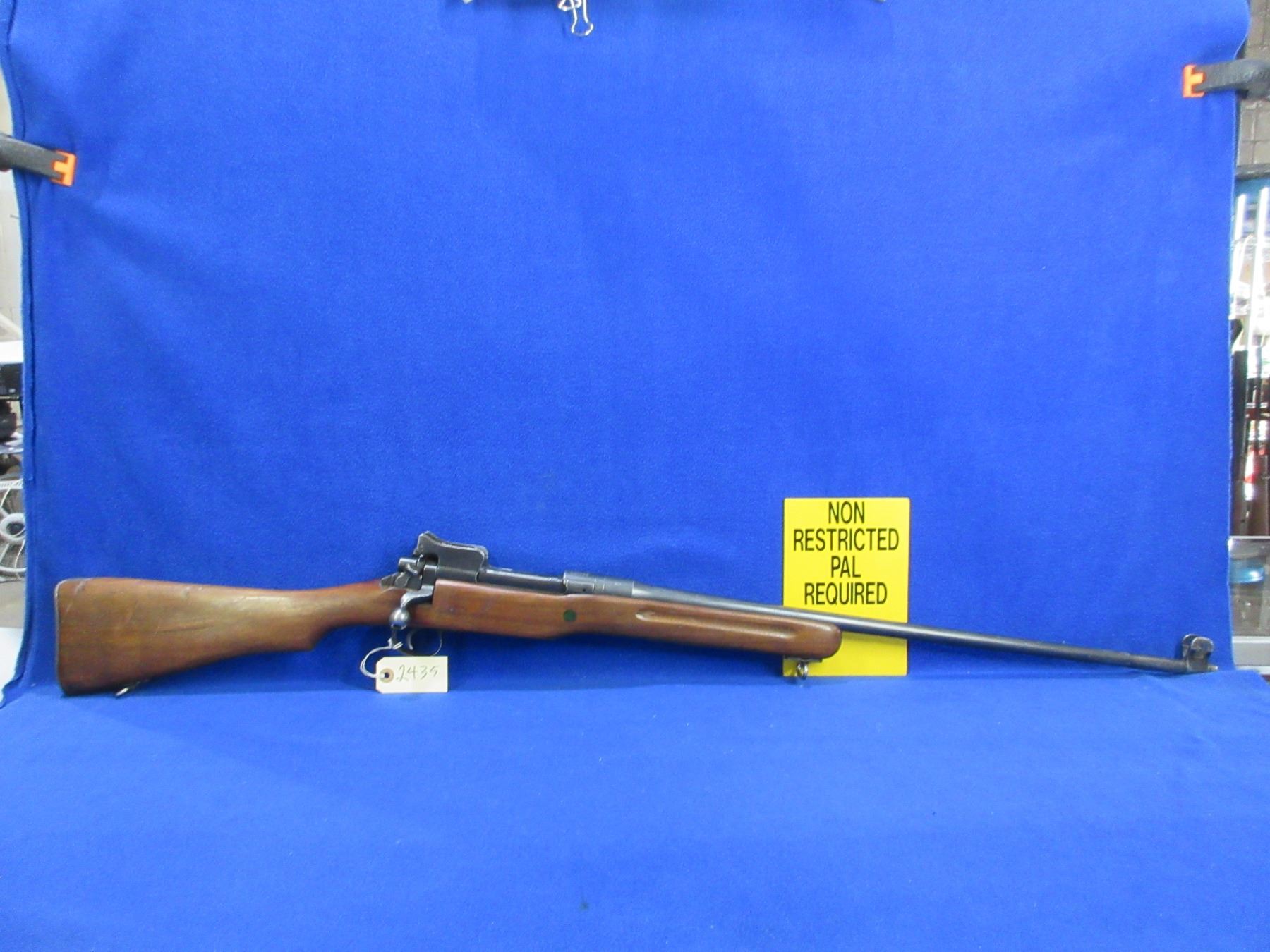 Non-Restricted - Enfield P17 by Winchester in 30-06 Sprg- This is a bolt action rifle with floorplate magazine, action appears to be in good to very good working order. Barrel is 26", rifling is good to very good, bluing is fair to good as turning grey, has both sights (rear ladder sight), sporterized stock is good with usage marks, length of pull is 13 1/2", metal butt plate good, one side of crossbolt in stock is missing, comes with swivels. Ser # 140922