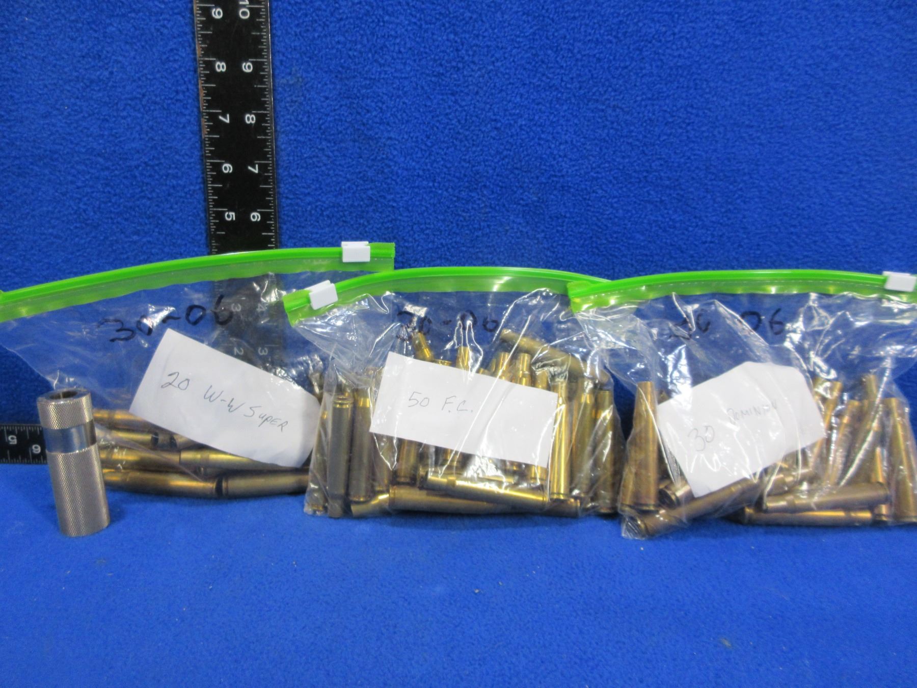 30-06 Sprg Brass Deprimed & Hornady 30-06 Cartridge Gauge - 100 Brass Total - Bag of 30 (Dominion Headstamp), Bag of 20 (WW Super Headstamp), Bag of 50 (FC Headstamp)