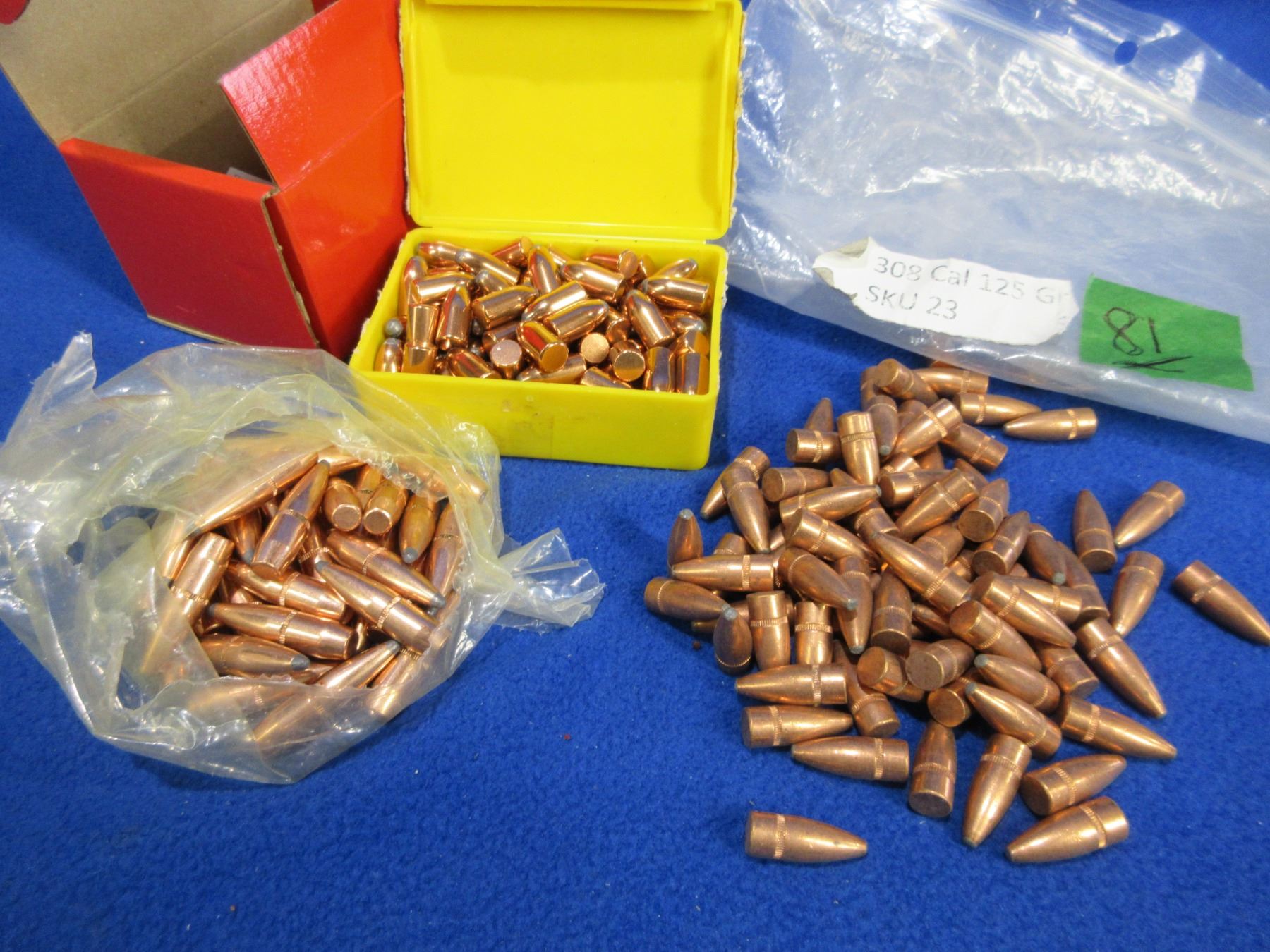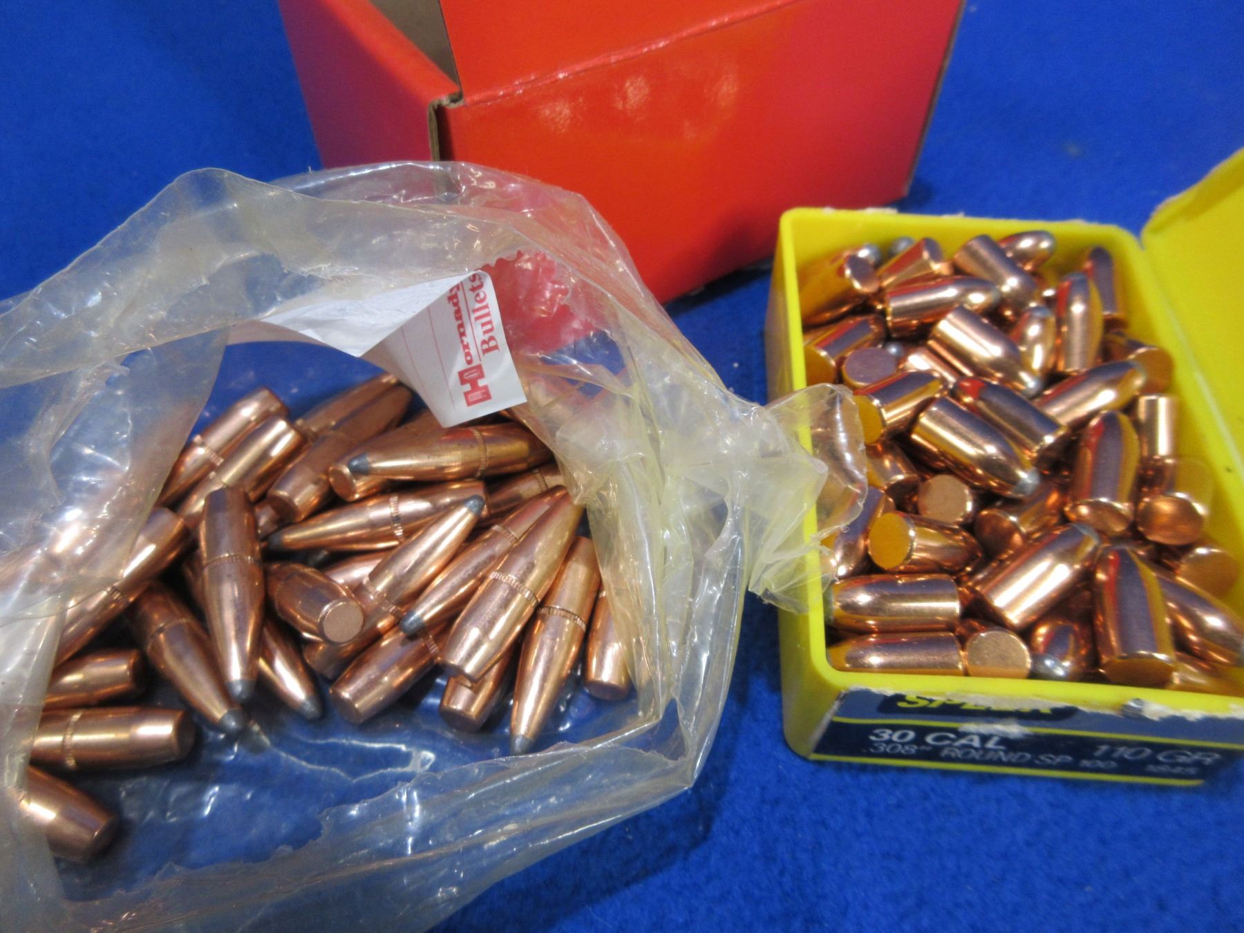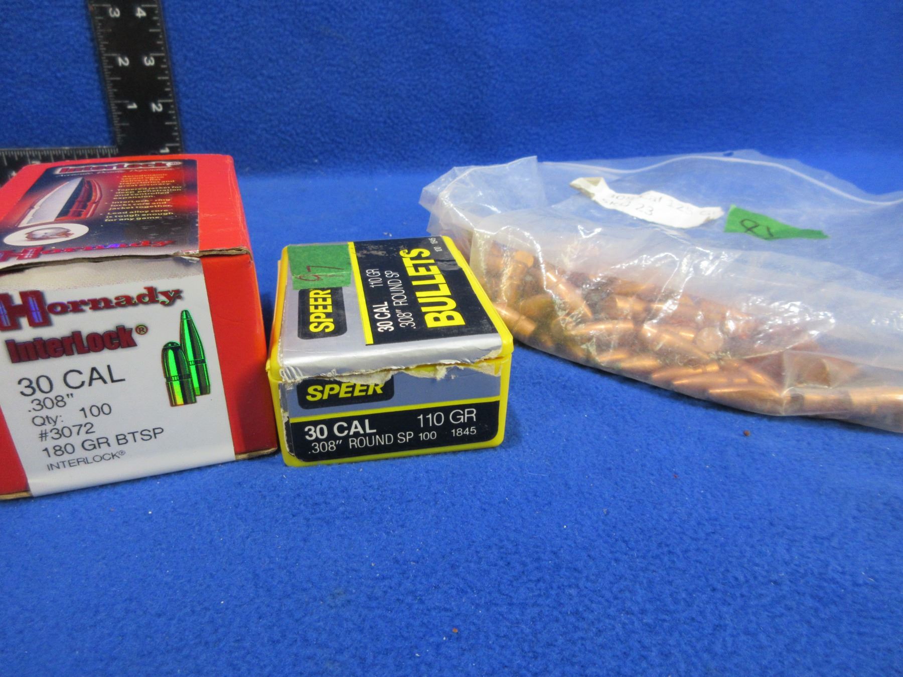 30 Cal. .308" Hornady and Speer Bullets - Box of 97 (Speer 110gr Round SP), Box of 34 (Hornady 180gr BTSP), Bag of 81 (Unknown 125gr)