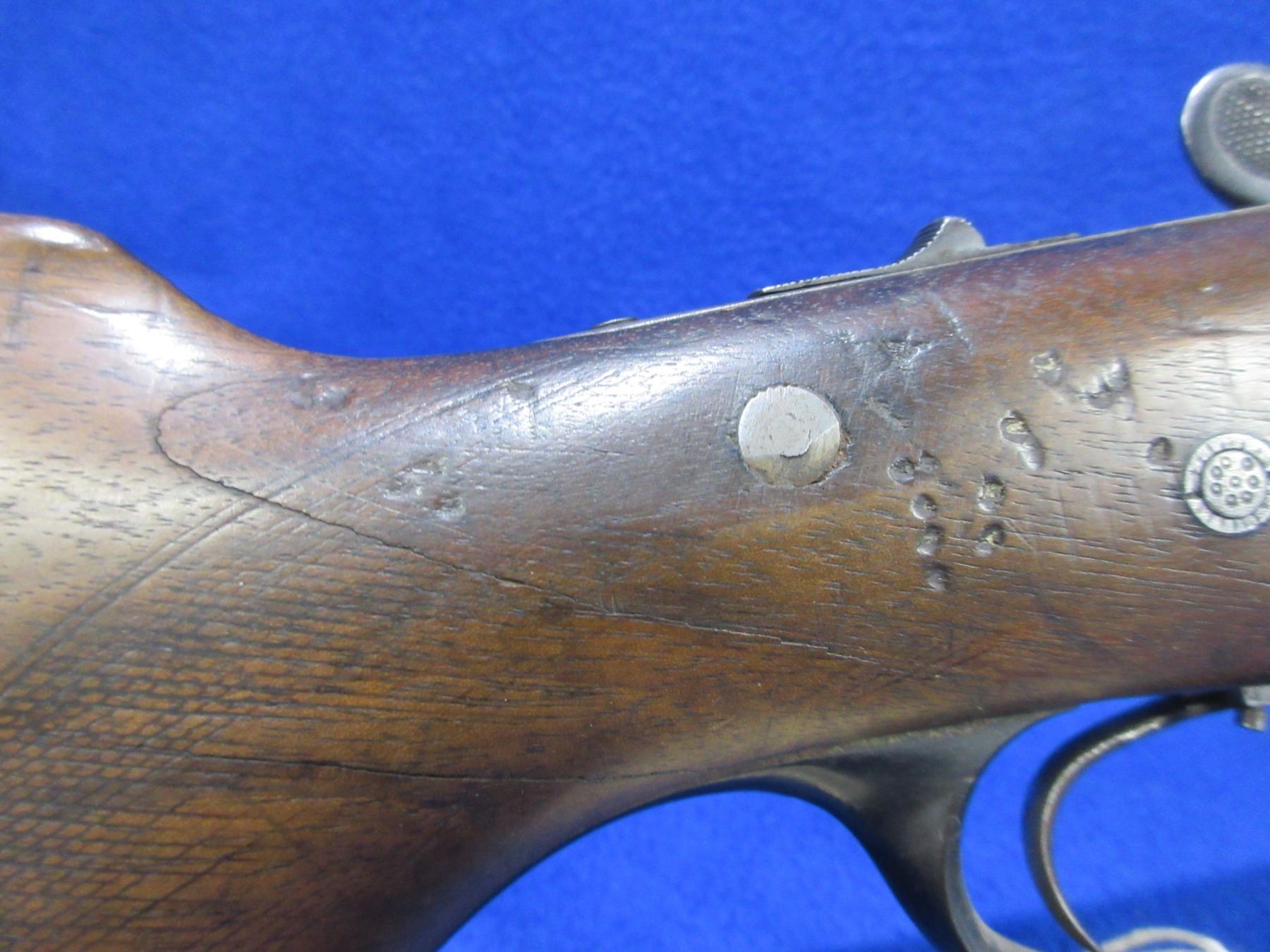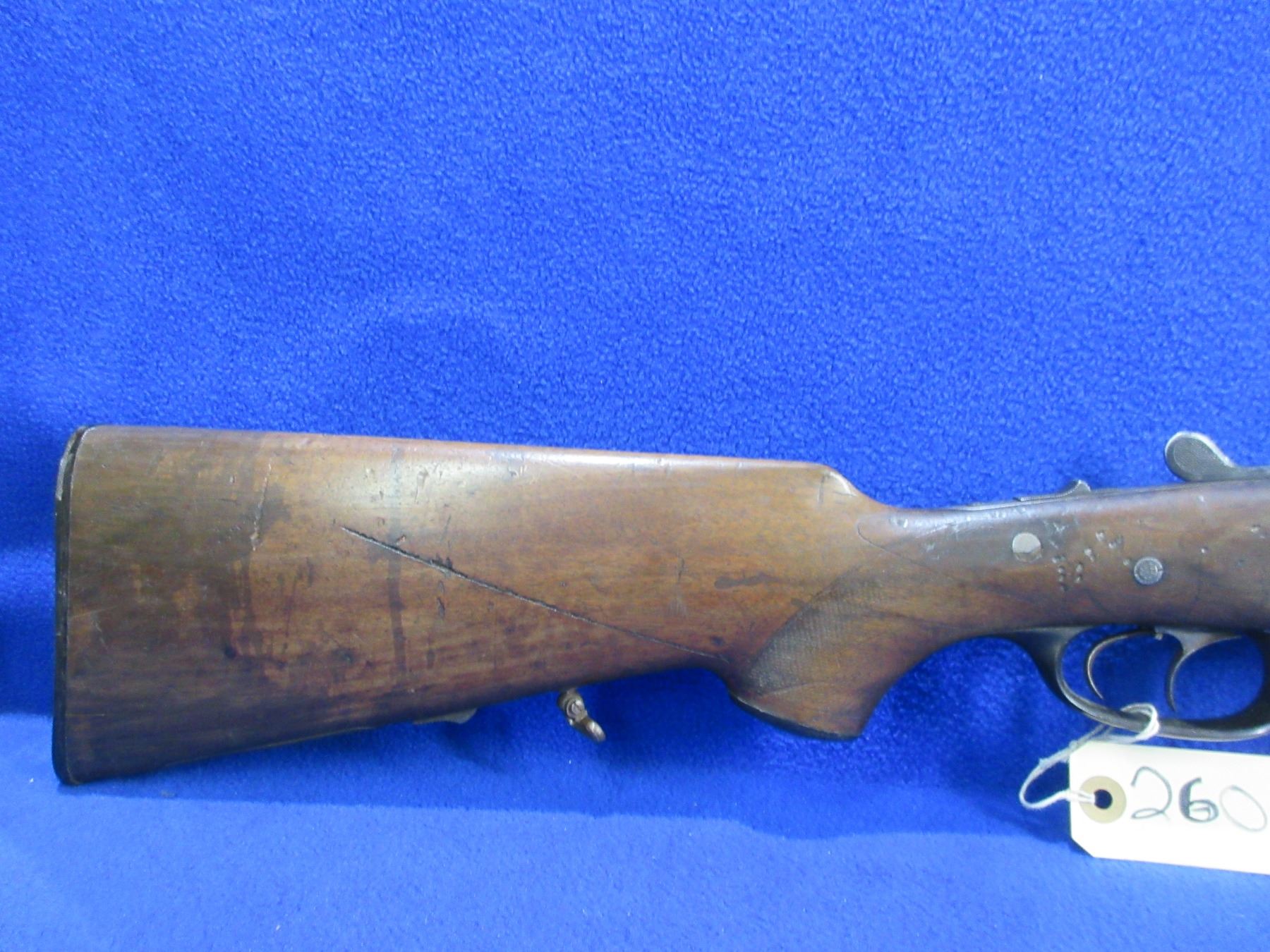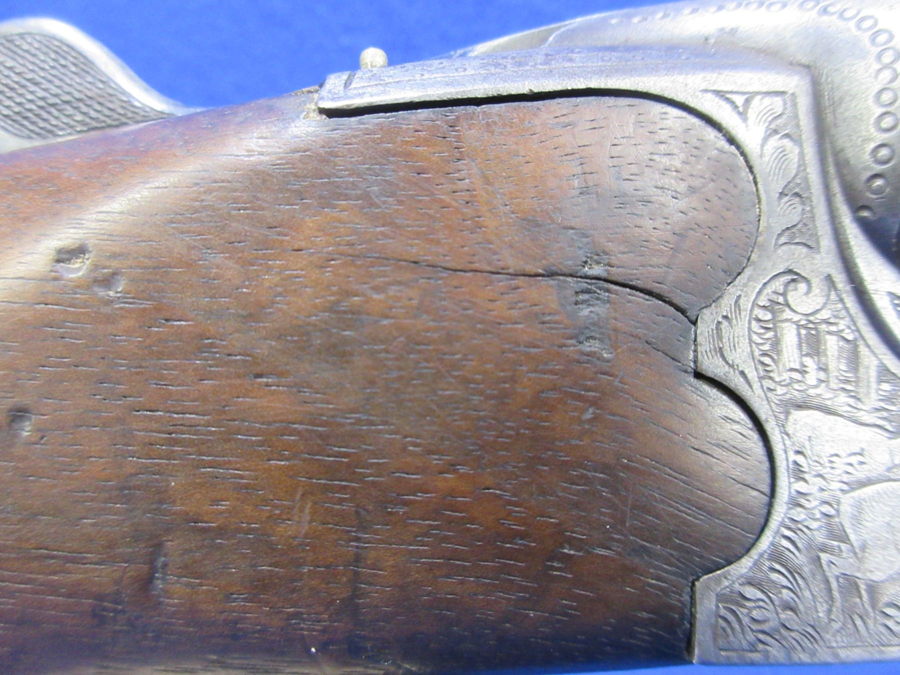 Non-Restricted - Meffert Drilling Combo in 16 Ga. 2 1/2"/9.3x72R- This is a tip up combo shotgun/rifle, nicely engraved action is tight and appears to be in good working order but should not be fired as stock is cracked. 12 Ga. barrels are 27" - bores are fair with pitting, rifle barrel is 27" - rifling is fair with pitting, bluing is good, length of pull is 13 3/4", has both sights, stock has a major crack repair in the wrist area, and cracks in the heel, forearm is good with many usage marks, butt plate has a chip on the heel, trigger guard missing front screw, comes with swivels. Ser # 2074