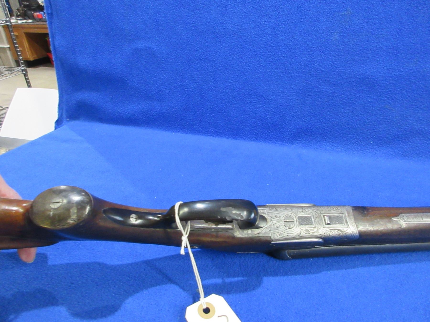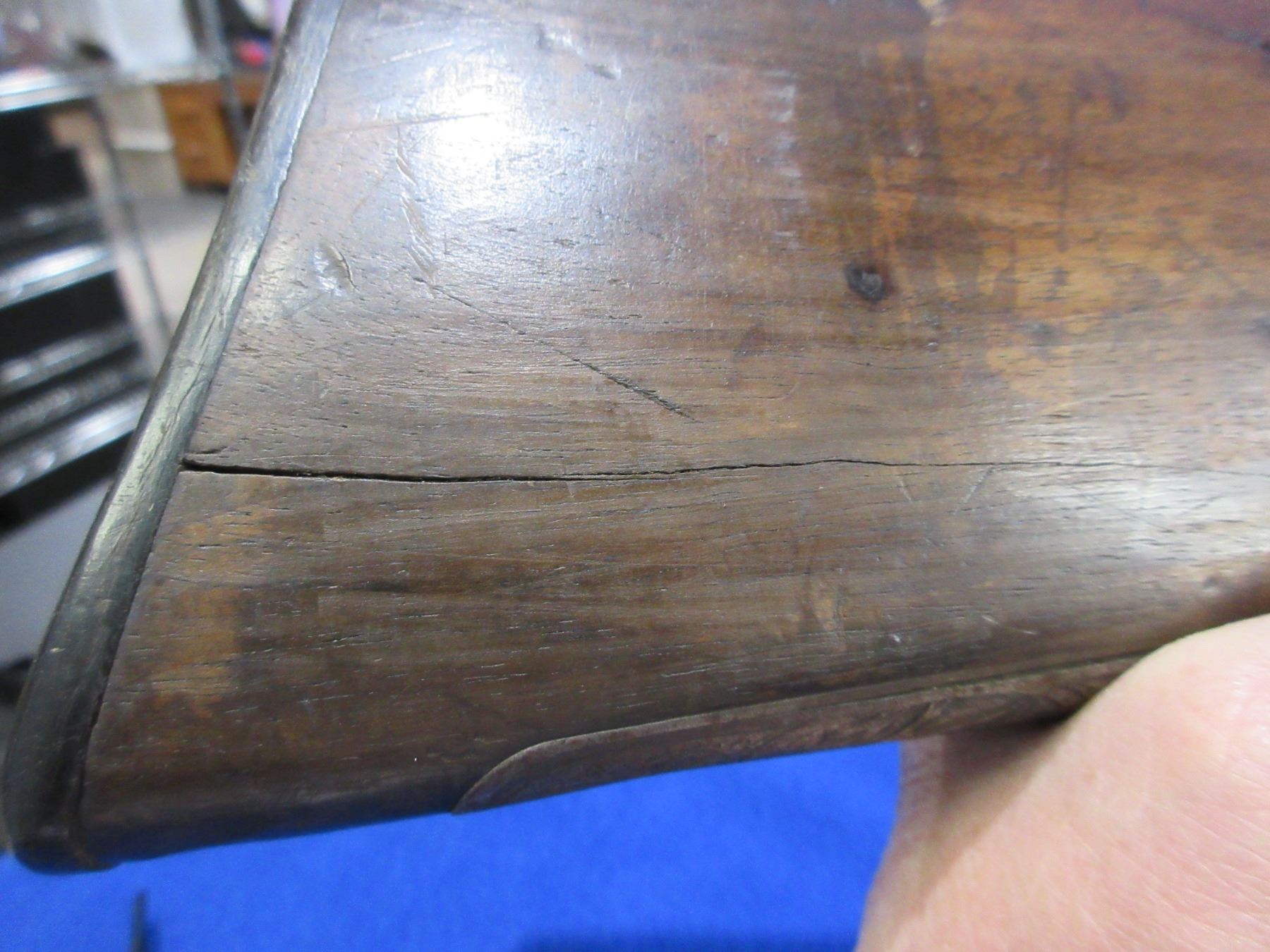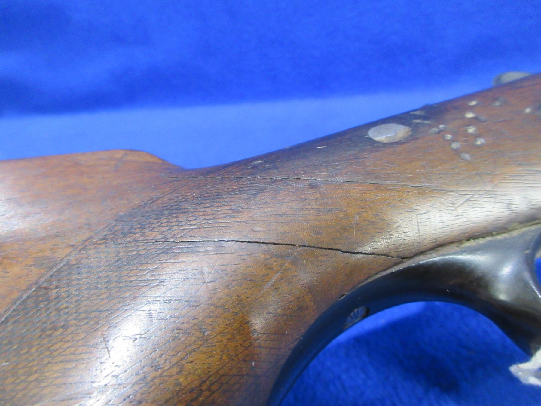 Non-Restricted - Meffert Drilling Combo in 16 Ga. 2 1/2"/9.3x72R- This is a tip up combo shotgun/rifle, nicely engraved action is tight and appears to be in good working order but should not be fired as stock is cracked. 12 Ga. barrels are 27" - bores are fair with pitting, rifle barrel is 27" - rifling is fair with pitting, bluing is good, length of pull is 13 3/4", has both sights, stock has a major crack repair in the wrist area, and cracks in the heel, forearm is good with many usage marks, butt plate has a chip on the heel, trigger guard missing front screw, comes with swivels. Ser # 2074