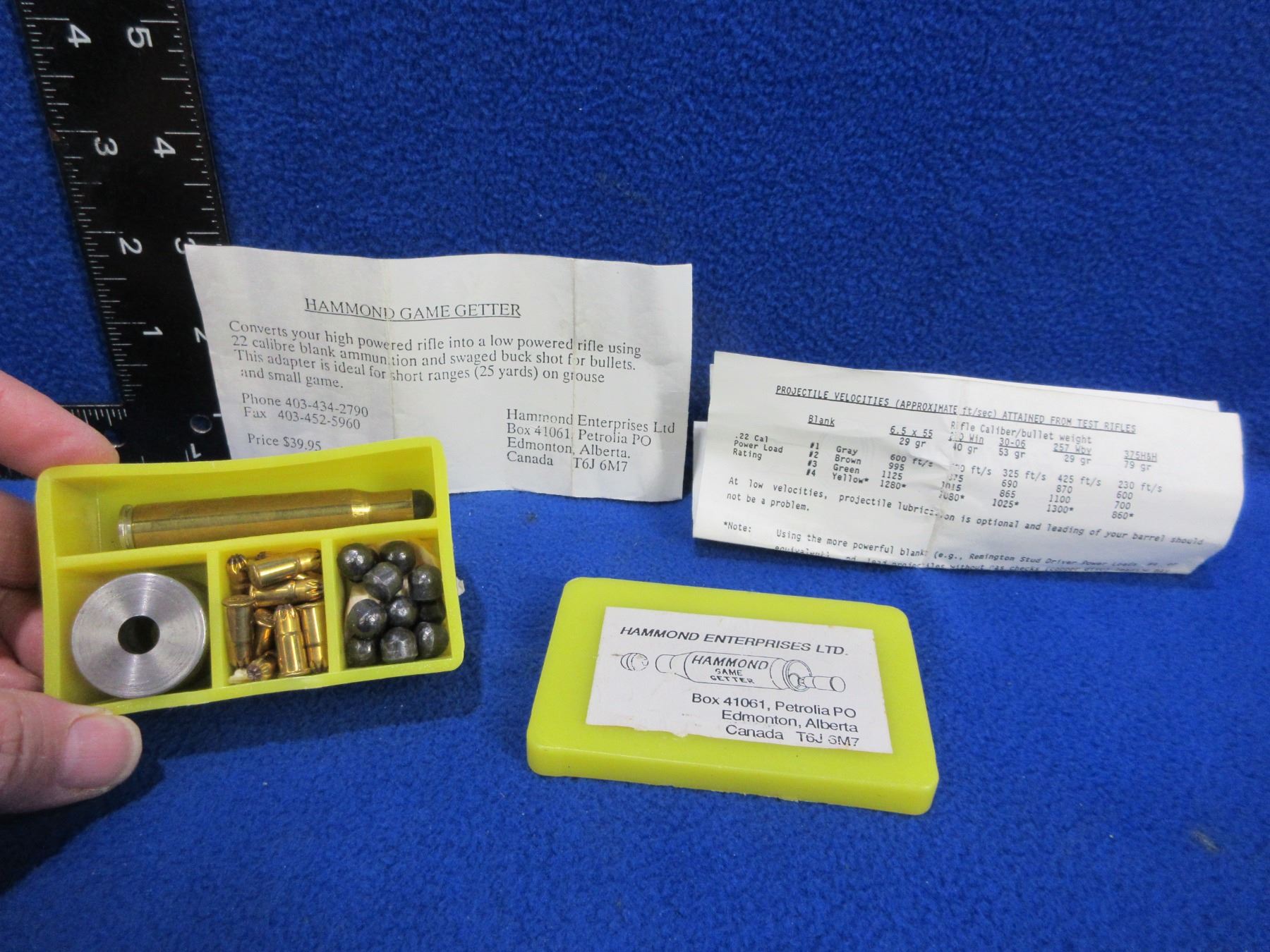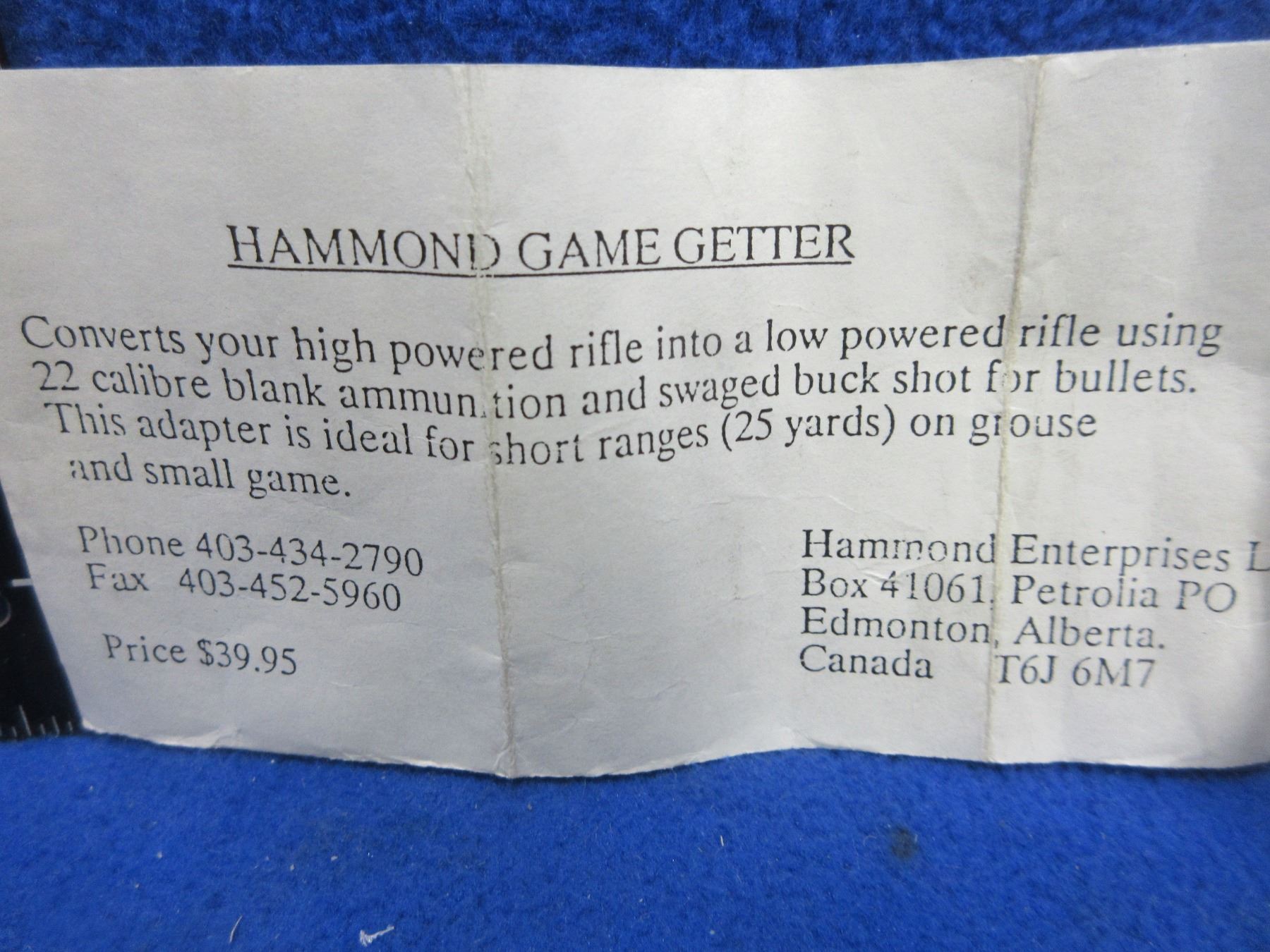 30-06 Hammond Game Getter (Pick Up or Ship by UPS Only) - Appears Complete - Specialized cartridge system for the .30-06 Springfield rifle that uses a .22 caliber rimfire blank and a .308-diameter lead ball to create a low-power load for small game like birds and rabbits.