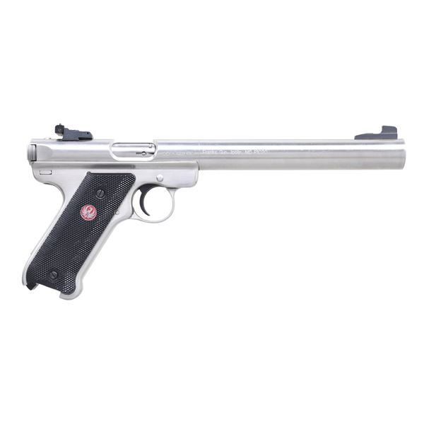 INTEGRAL FRANKS GUN SILENCER. Cal. 22 LR. S# (Silencer): P1020, (Pistol): 22740179. Bbl. 7 7/8" (with silencer). Ruger Mark III Target semi-automatic pistol mfg. by Ruger in 2006, and subsequently fitted with a Franks Gun integral silencer. Left side of the receiver is marked with the model and cal. designations, with the S# marked on the right. Right side of silencer is marked "Franks Gun Joplin, MO P1020". Receiver, frame, and silencer exhibit a polished in-the-white finish. Frame is mounted with 2-piece Ruger medallion checkered black plastic grips. Blade front sight, with adj. square notch rear sight. Mag. is absent. CONDITION: very good, with scattered superficial marks from handling and storage present overall. Silencer shows some carbon build up front prior use, but is otherwise very good overall. Grips show some smoothing, as well as some scattered marks from handling and storage, but otherwise remain sturdy and serviceable. PROVENANCE: From the Estate of Ivan Lee Shapiro. (03-1790 / 24-6518/MLW). MODERN / MODERN CLASS III. $500-700.