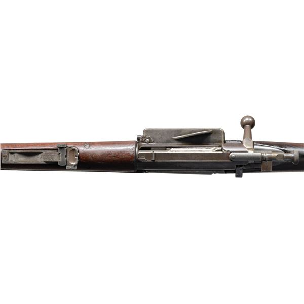 MILITARY RIFLE. Cal. 30-40 Krag. S# 170956. Bbl. 30". Model 1902 tangent rear sight w/ sliding peep graduated to 2,000 yards. Front sight base is present, blade is missing. Walnut stock set. Buttstock w/ worn arsenal refinish. Has illegible inspector's mark. Encircled script "P" proof is visible under grip. Smooth trap buttplate. CONDITION: stock set has worn finish w/ numerous handling marks. Has bored soldier "HCWV" initials at right rear of butt. Metal has turned gray & patina w/ traces of original blue & spots of peppery light oxidation. Fair worn bore remains shiny. (25-2801/RW). CURIO. $500-800.