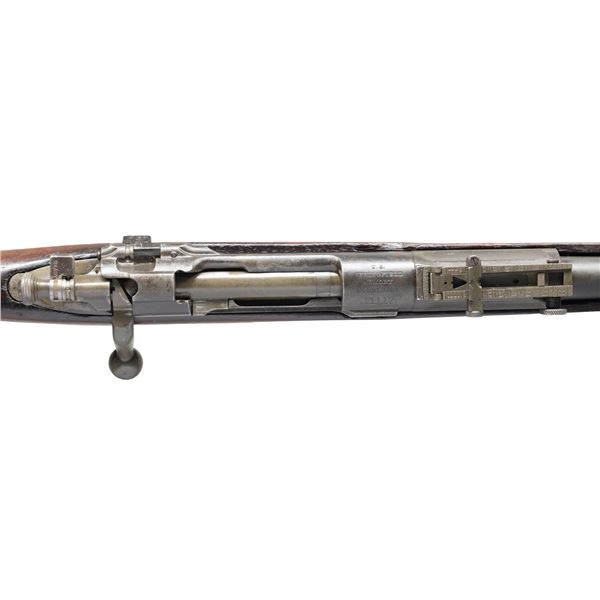 SPRINGFIELD BOLT ACTION MILITARY RIFLE. Cal. 30-06. S# 11117. Bbl. 24". Avis WWI field replacement barrel is marked behind front sight "AV / flaming bomb / 12-18". Ladder rear sight marked "R", without volley notch. Blade front sight movable base marked "R". Unmarked bolt w/ straight-down handle. Magazine cutoff marked "R". Milled trigger guard assembly. Smooth trigger. Balance of furniture is not present, except band spring. S type straight grip walnut stock w/ two recoil bolts & grasping grooves. CONDITION: stock has arsenal rework finish w/ heavy wear & handling marks. Finish renders markings illegible. Area of damaged missing wood at forward end of trigger guard. Metal has mix of worn parkerized finish. Receiver has dull blackened appearance. Good bore w/ lightly worn lands. (25-2873/RW). CURIO. $250-400.