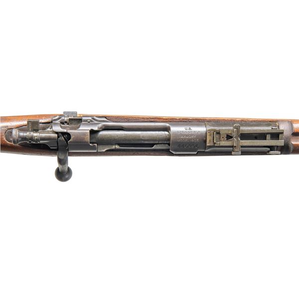 RIFLE. Cal. 30-06. S# 440296. Bbl. 24". Marked behind front sight "SA / flaming bomb / 2-15". Receiver not drilled for Hatcher hole. Straight down bolt handle. Bolt is marked underneath handle w/ "K" & "T". Ladder rear sight graduated to 2,850 yards w/ volley notch. Blade front sight. All milled furniture, including smooth trap buttplate. Upper band has been replaced by a band from a Model 1917 rifle. Stacking swivel is not present. Straight grip walnut stock set w/ single recoil bolt. Buttstock is unmarked except for refreshed "S" in cutout recess. CONDITION: stock set has moderate wear & handling marks over added finish. Cutoff recess has been slightly enlarged. Metal is a mix of blue & parkerized finishes. Some of which appear to be enhanced w/ cold blue. Lower band has notable wear & fine pitting. Band screw has grinding marks at head. Upper band is gray & patina. Bore has worn lands w/ dark oxidized grooves. (25-2867/RW). CURIO. $400-600.