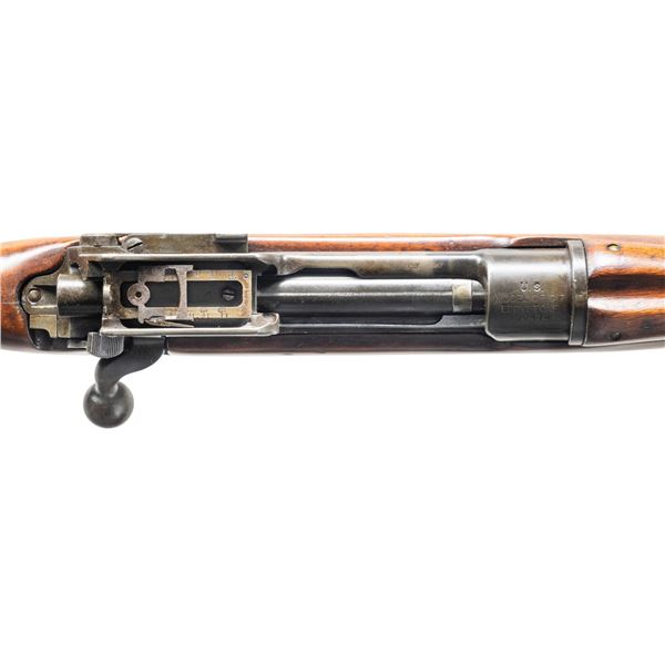 RIFLE. Cal. 30-06. S# 730474. Bbl. 26". Marked behind front sight "E / flaming bomb / 6-18". Rifle has been refinished & a ventilated recoil pad added to the buttstock which renders the rifle no longer Curio. Ladder aperture rear sight graduated to 1,600 yards. Blade front sight w/ protective ears. All visible parts markings are "E" except the Winchester replacement bolt. Walnut stock set. Stock is marked faintly on the left side w/ two rebuild marks & has faint "P" under pistol grip. CONDITION: stock set has gloss finish over moderate wear & handling marks. Butt has been slightly reshaped to accommodate the Pachmayr recoil pad & leaves a portion of the steel buttplate tang visible. Metal has thinning original finish turning gray w/ light wear. Bore has strong lands w/ lightly frosted grooves. (25-2812/RW). MODERN. $300-500.
