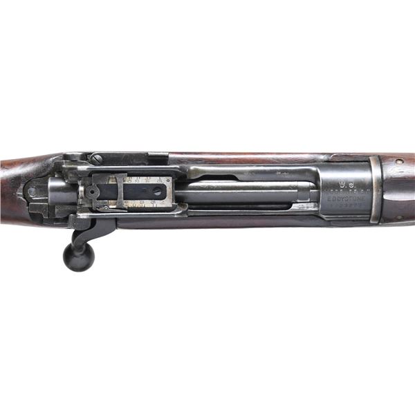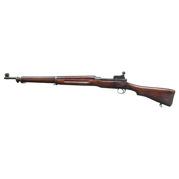 Cal. 30-06. S# 1223277. Bbl. 26" Eddystone dated 8-18. Standard 1917 sights. All visible parts appear to be of Eddystone mfr. with many bearing correct "E" markings. Blued finish. Walnut stock set with bottom mounted sling swivels. CONDITION: stock has an armory oil finish with a light chip behind upper tang, some dings, worn finish & handling marks. Metal retains perhaps 30% blue with overall fading to gray, edge wear, scattered oxidation & handling marks. Action functions properly when hand cycled. Very good bright bore with strong rifling. (25-2822/MJC). CURIO. $400-600.
