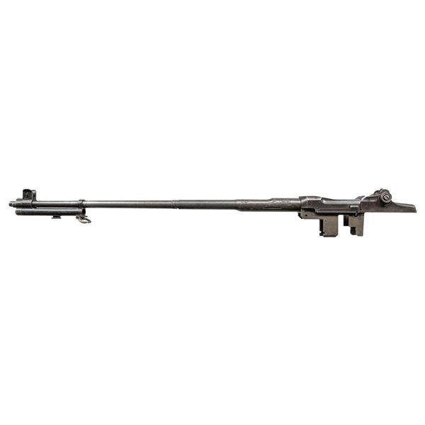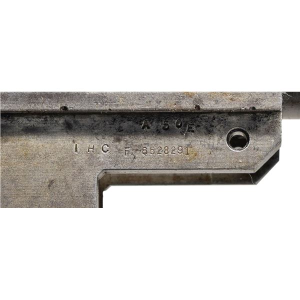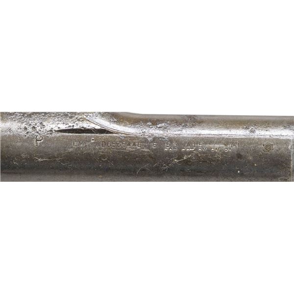 BARREL AND PARTS. Cal. 30-06. S# 4660000. Bbl. 24". Throat gauges 3.0. Muzzle gauges 4.0. Barrel markings on right side include "LMR 6 53" & import marks. Receiver w/ standard markings at heel marked on right forward end "IHC F 6528291". Receiver has clip latch assembly installed & T105E1 rear sight. Barrel is equipped w/ gas cyl., front sight, stacking swivel, high hump gas cyl. lock & cross slot gas cyl. lock screw. "WRA" marked operating rod is present. Rod has the Winchester slant & relief cuts. CONDITION: metal is worn, turning gray w/ areas of moderate pitting, notably over the chamber area. Operating rod appears in better condition. Dark worn oxidized bore. (25-2928/RW). MODERN. $200-400.
